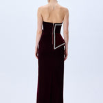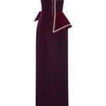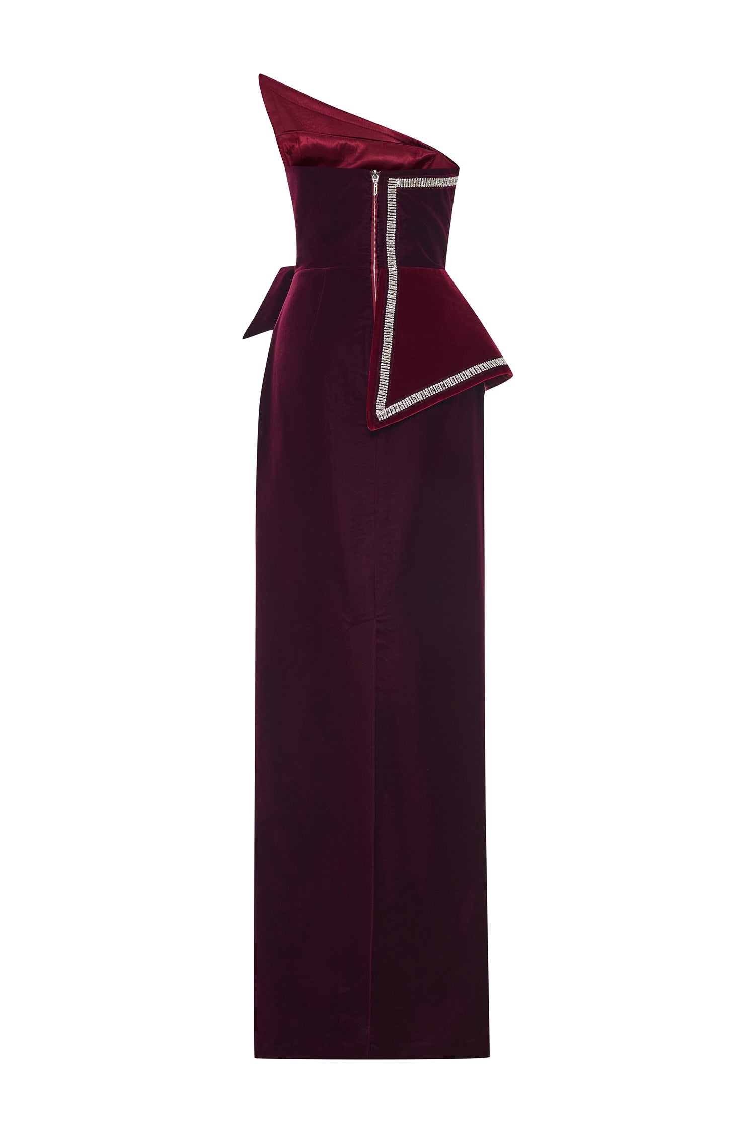 Burgundy Silk Velvet Corseted Architectural Dress With Crystal Border