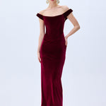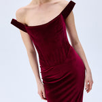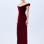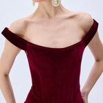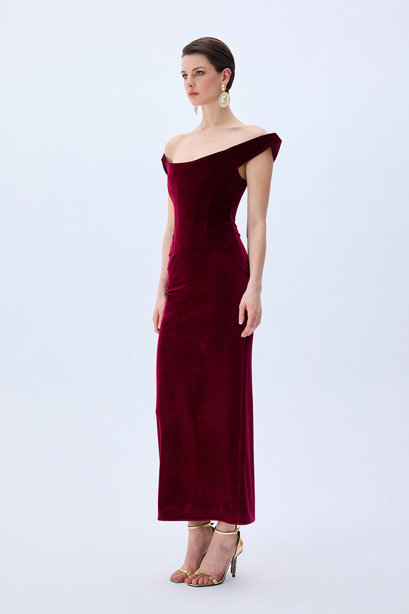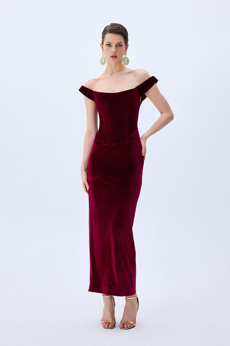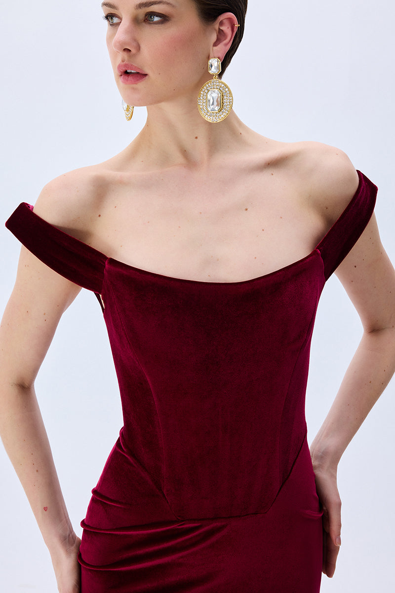 A modern siren’s silhouette. Crafted from plush burgundy velvet, this off-shoulder dress hugs the form with sculptural precision. The corseted bodice and gently draped neckline evoke classic romance with a confident edge.