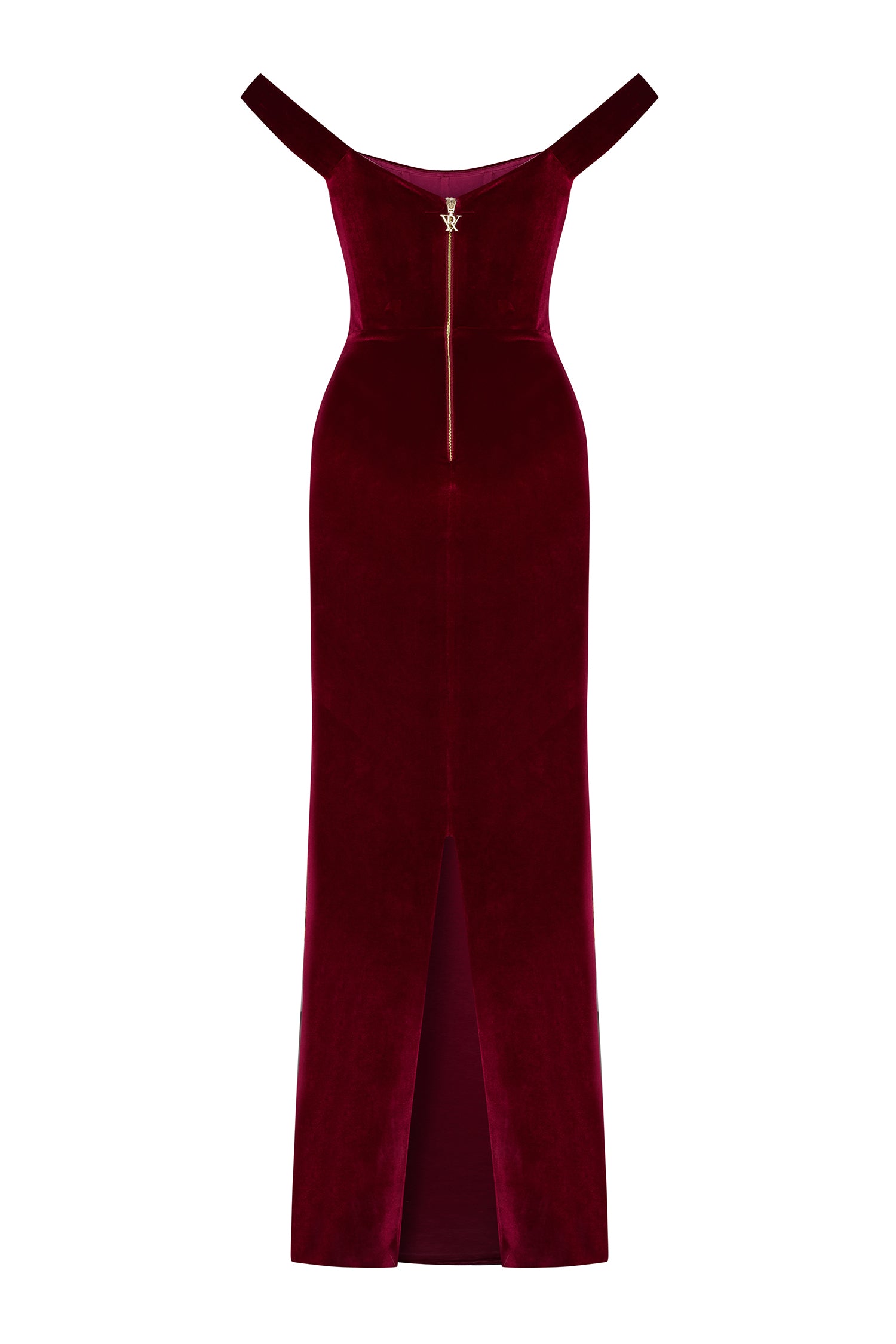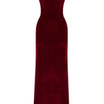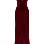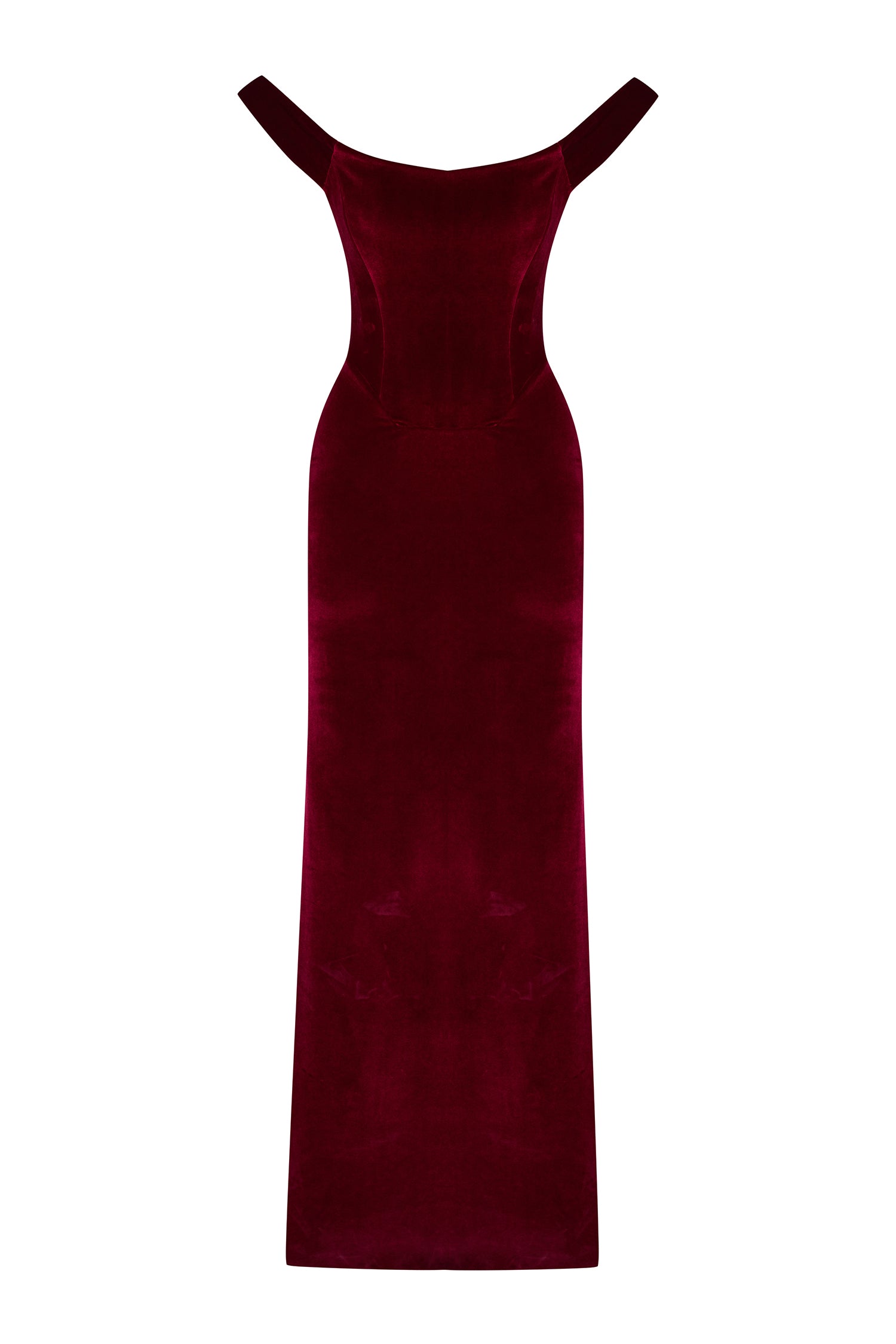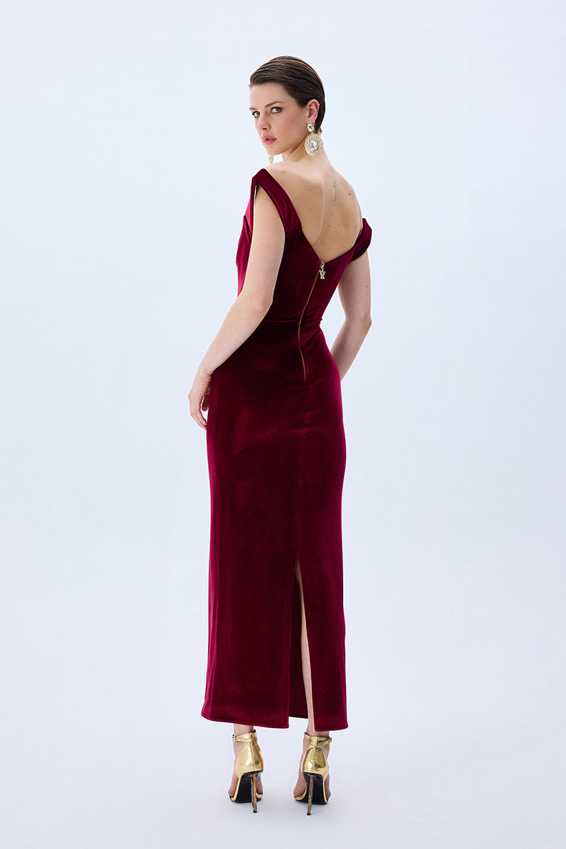 A modern siren’s silhouette. Crafted from plush burgundy velvet, this off-shoulder dress hugs the form with sculptural precision. The corseted bodice and gently draped neckline evoke classic romance with a confident edge.