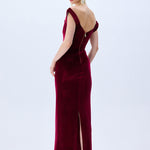 Burgundy Stretchy Velvet Cowl Neckline Corseted Sculptural Dress