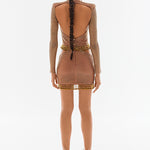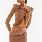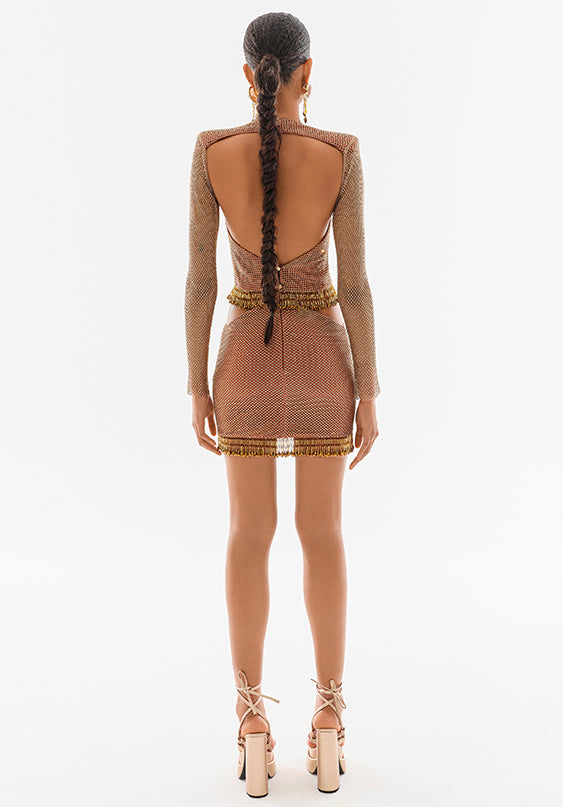 Crystal-Embellished Fishnet Backless Crop Top With Beaded Fringe Details