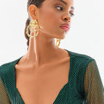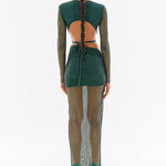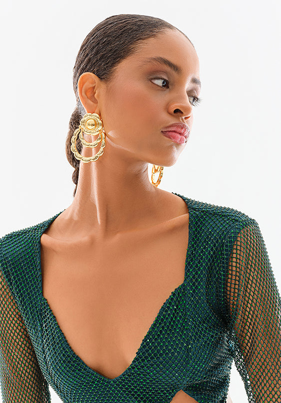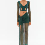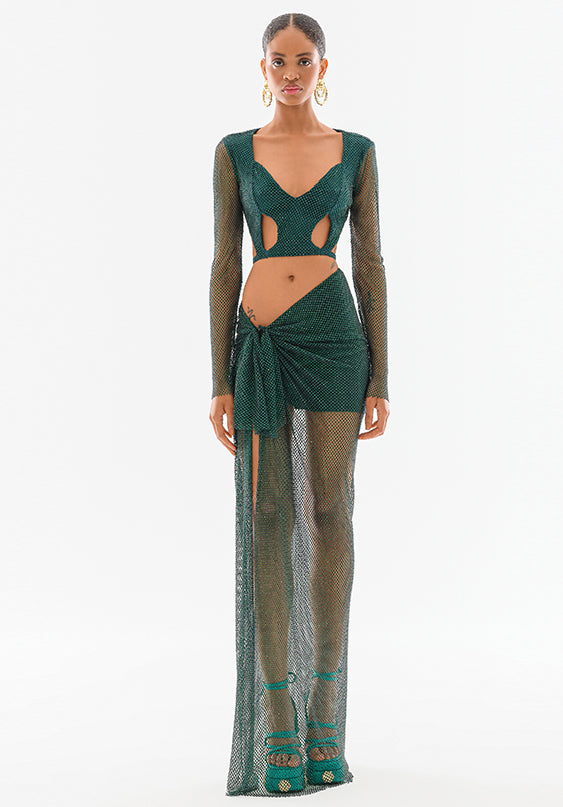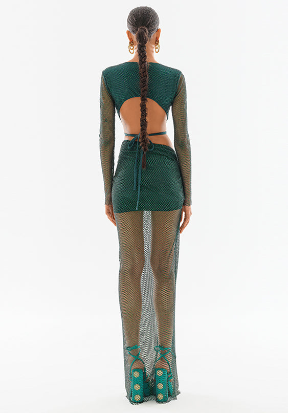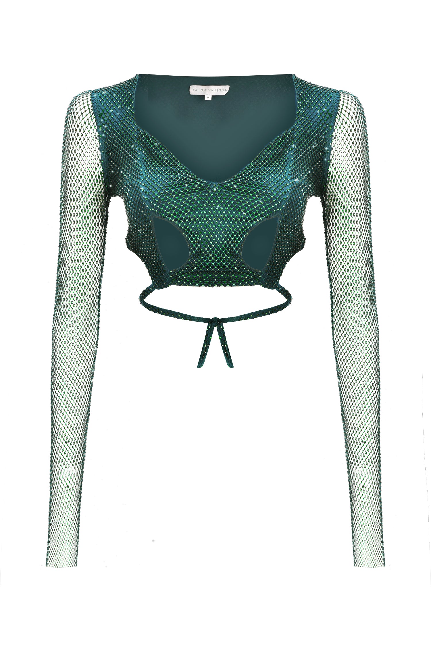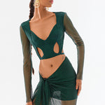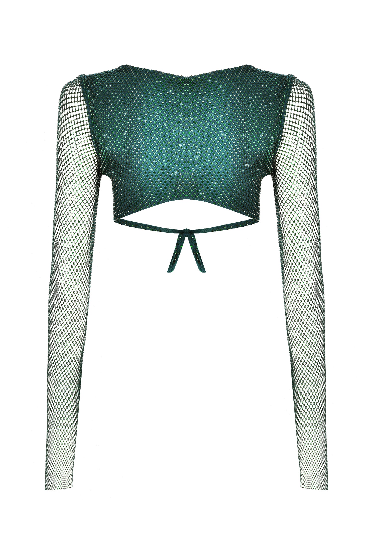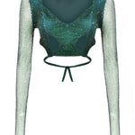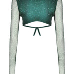 Crystal Embellished Fishnet Open Back Long Sleeve Cutout Crop Top