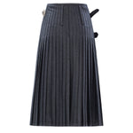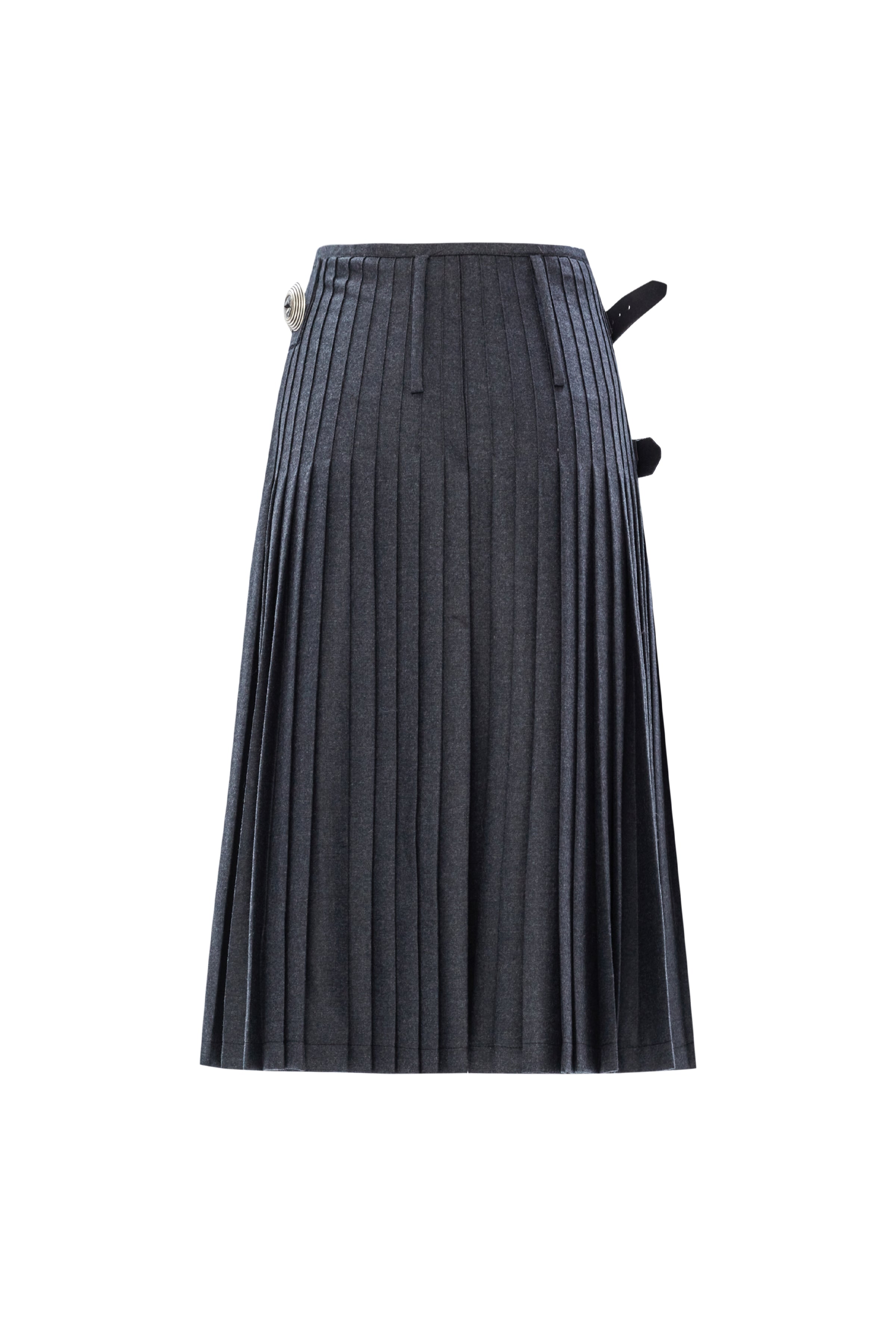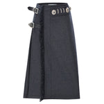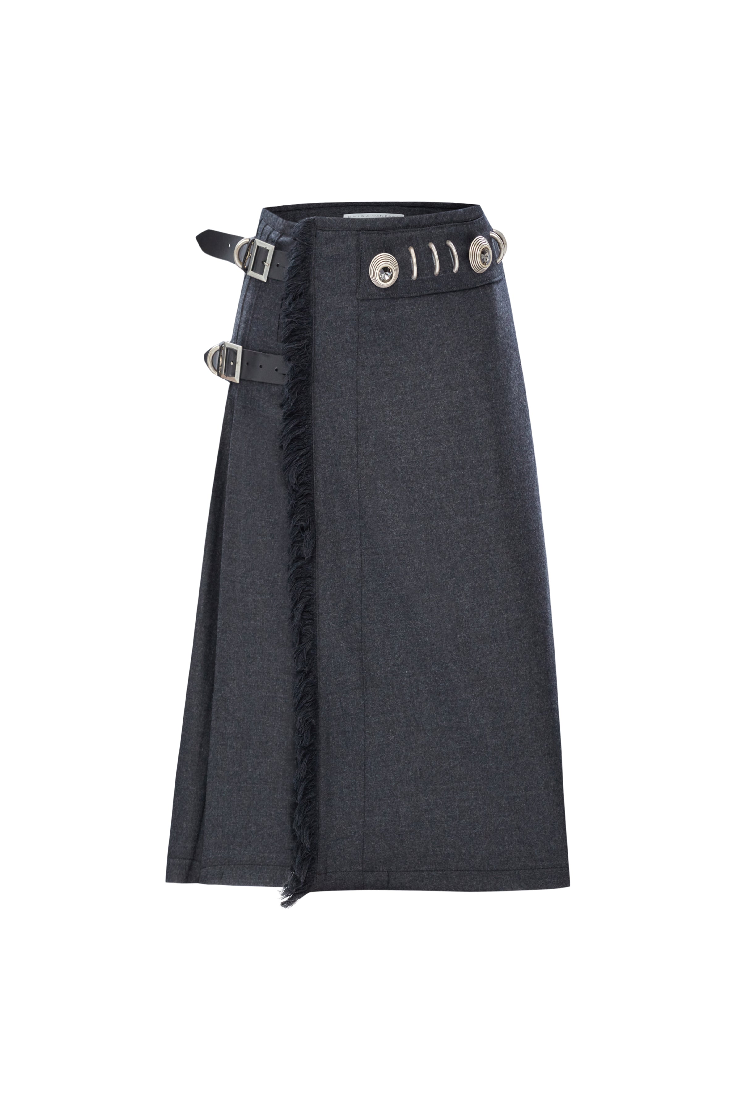 The Dark Grey Wool Midi Skirt features a stylish metallic piercing detailed belt, adding a touch of edgy sophistication to this versatile wardrobe staple.