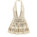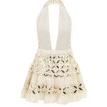 Embroidered deep backless mini dress finished with a deep v-neck.