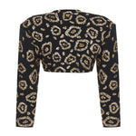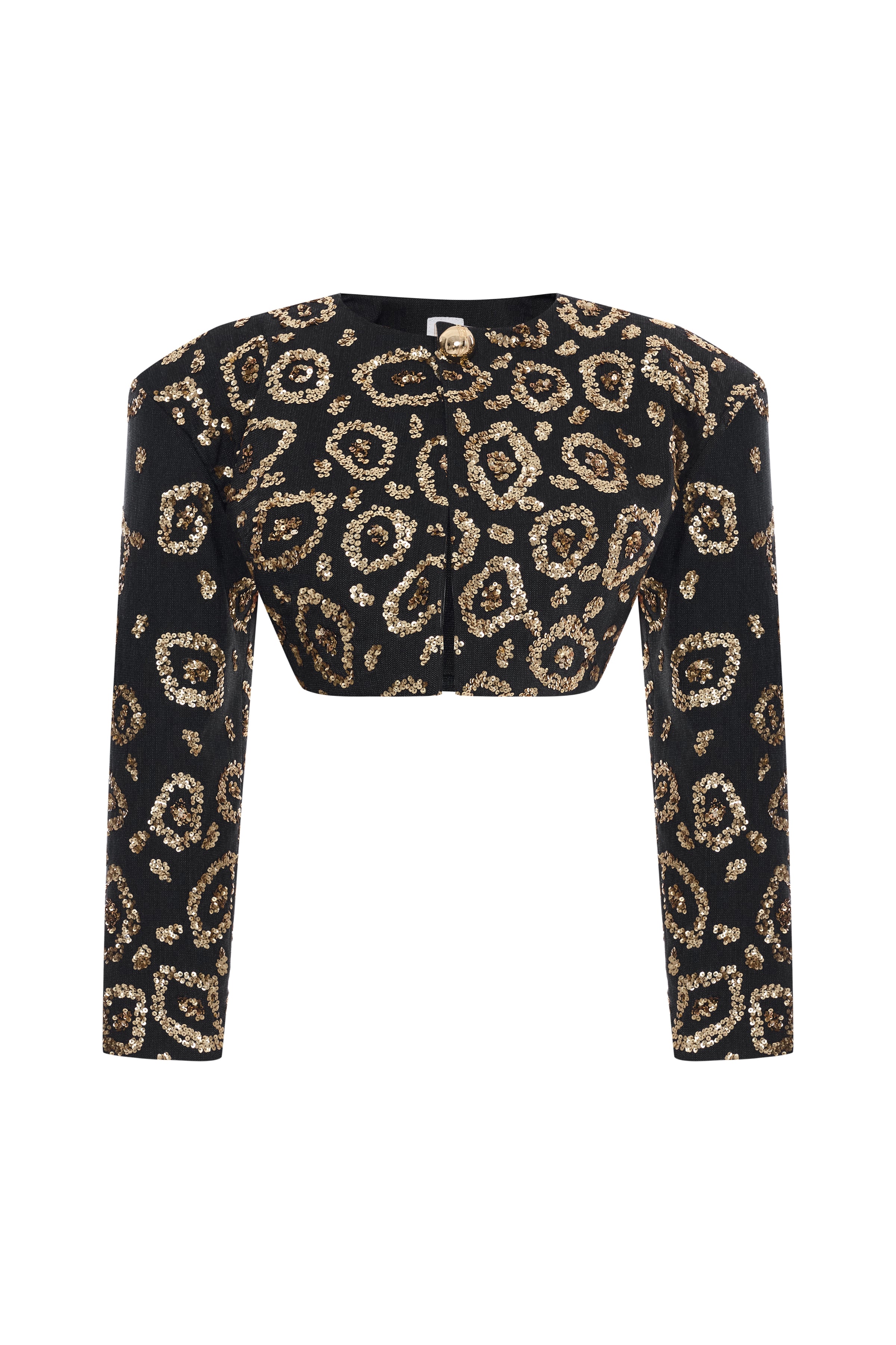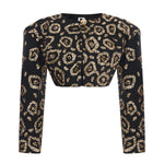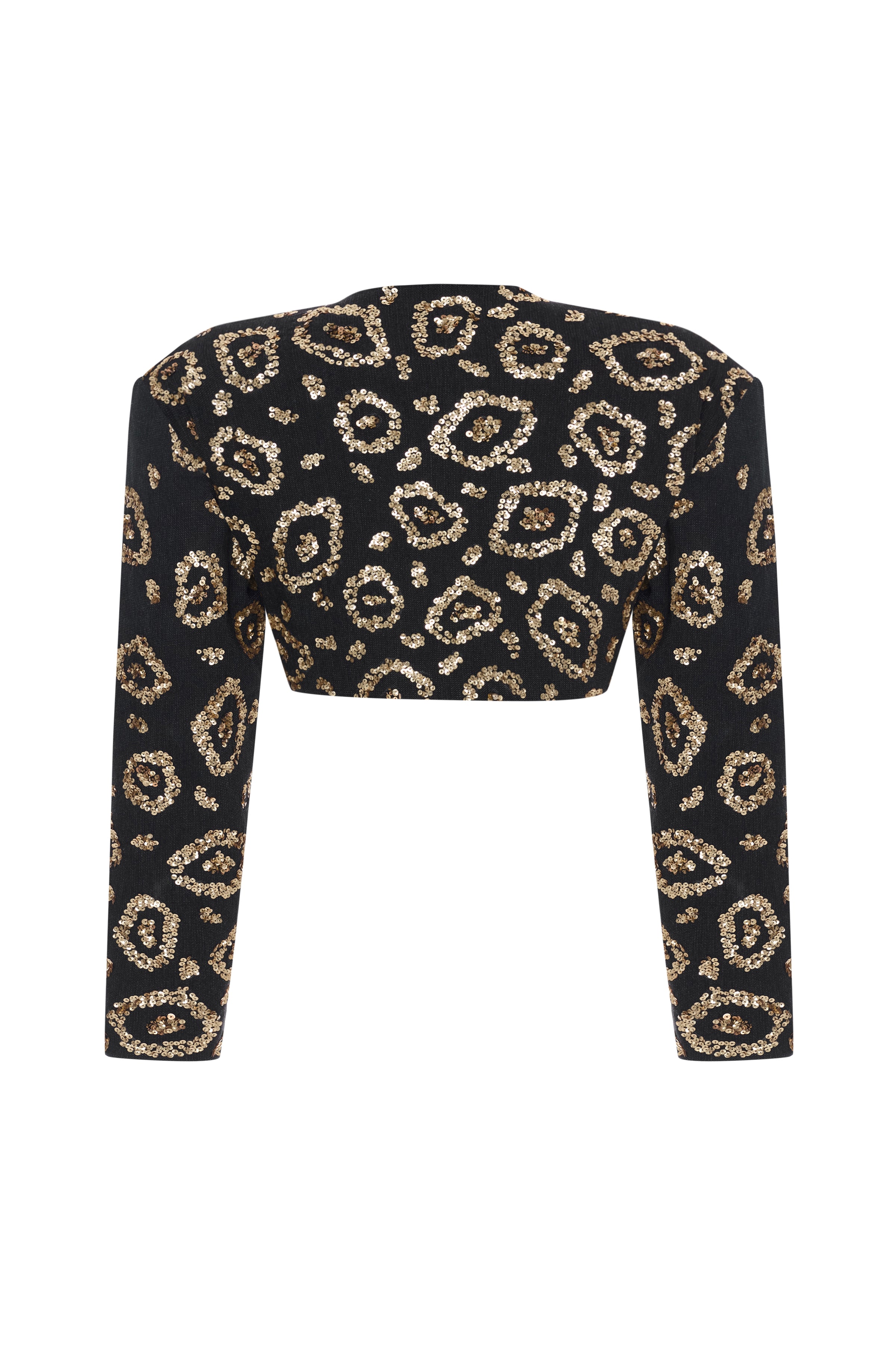Cropped to perfection, this statement jacket fuses sharp tailoring with bold glamour. Its strong shoulders and sculpted waist are offset by shimmering gold leopard sequins, bringing a rebellious spirit to a refined silhouette.
