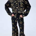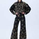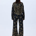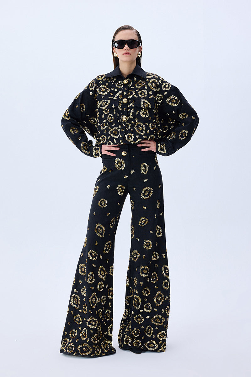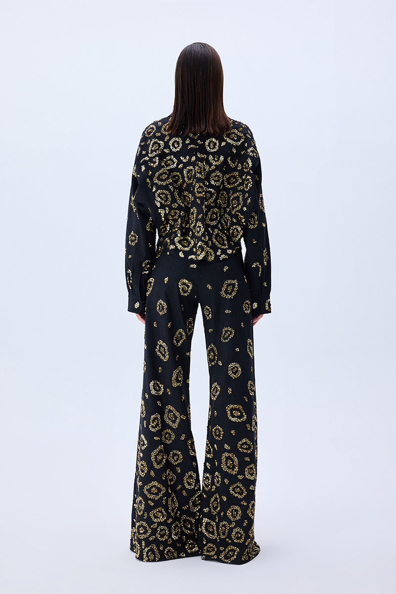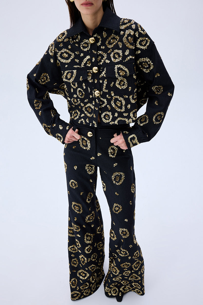 A bold take on classic denim. Flared pants shine with all-over golden leopard sequins, infusing casual tailoring with a fierce, high-glamour twist.