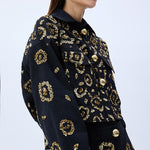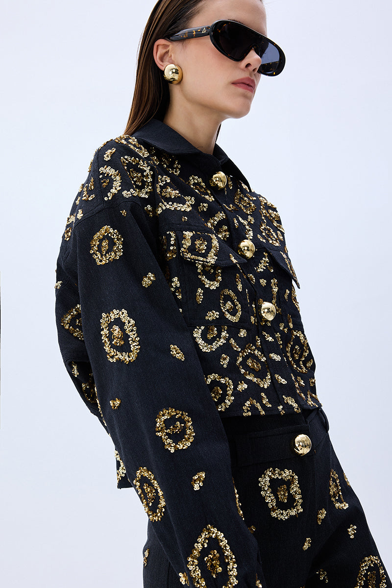 A structured denim shirt elevated by radiant gold leopard sequins and gleaming statement buttons where bold meets refined.