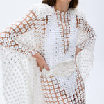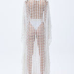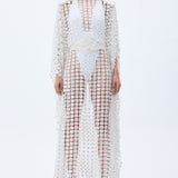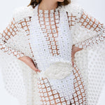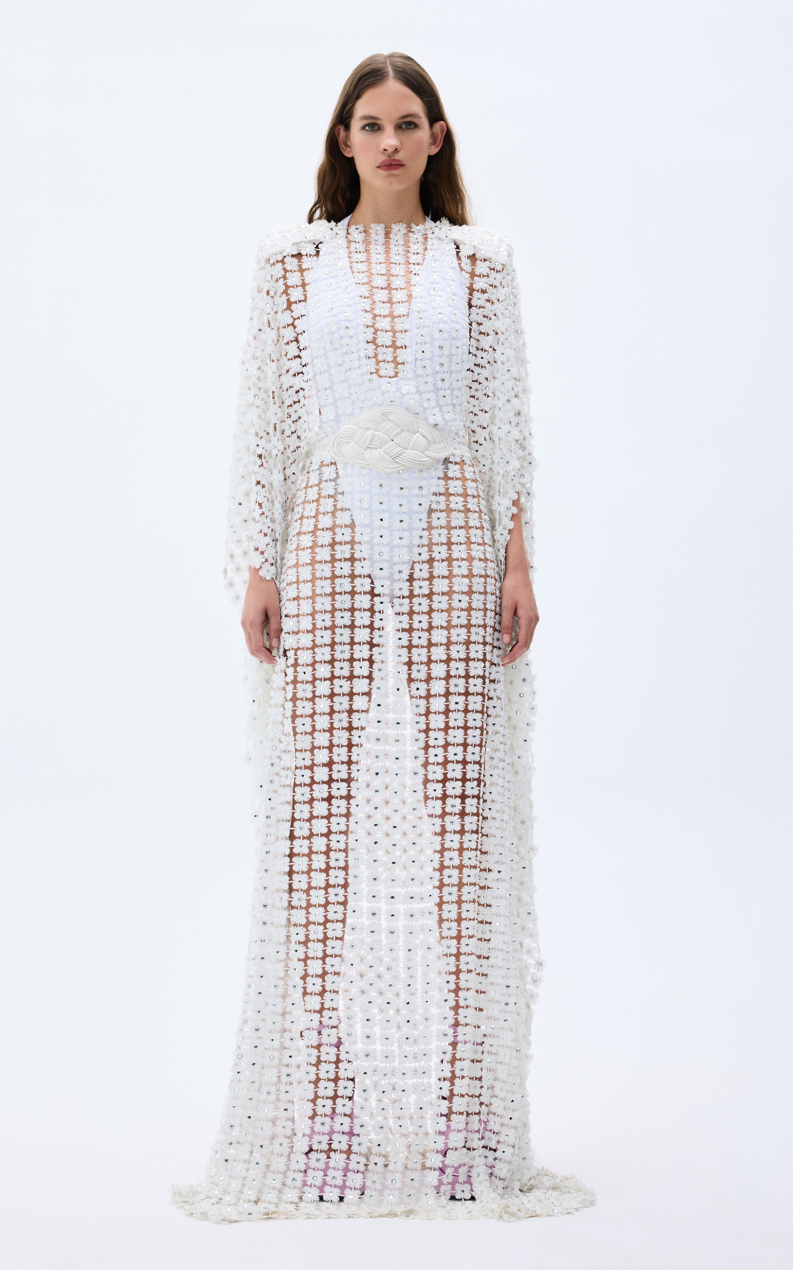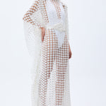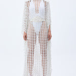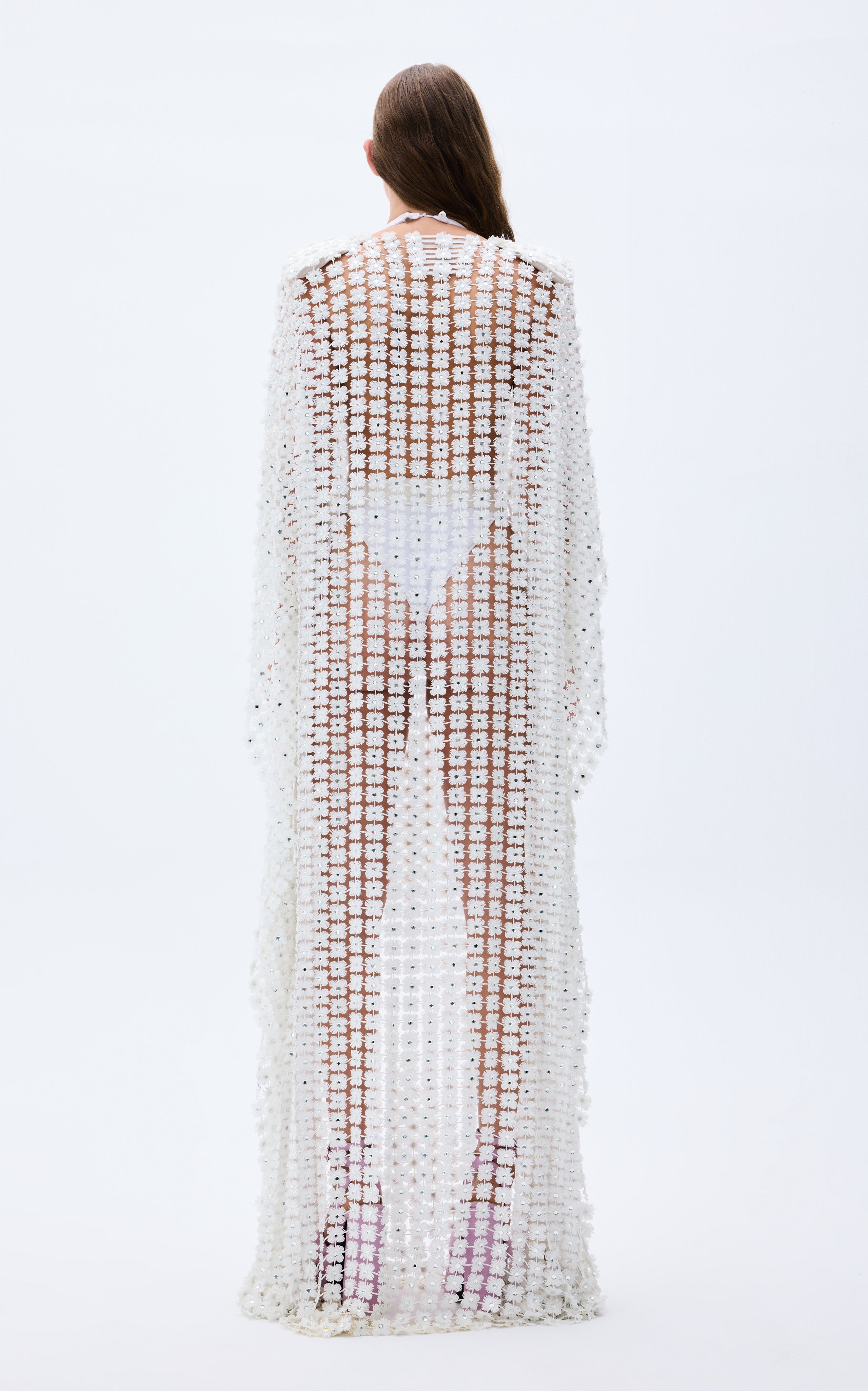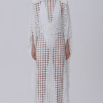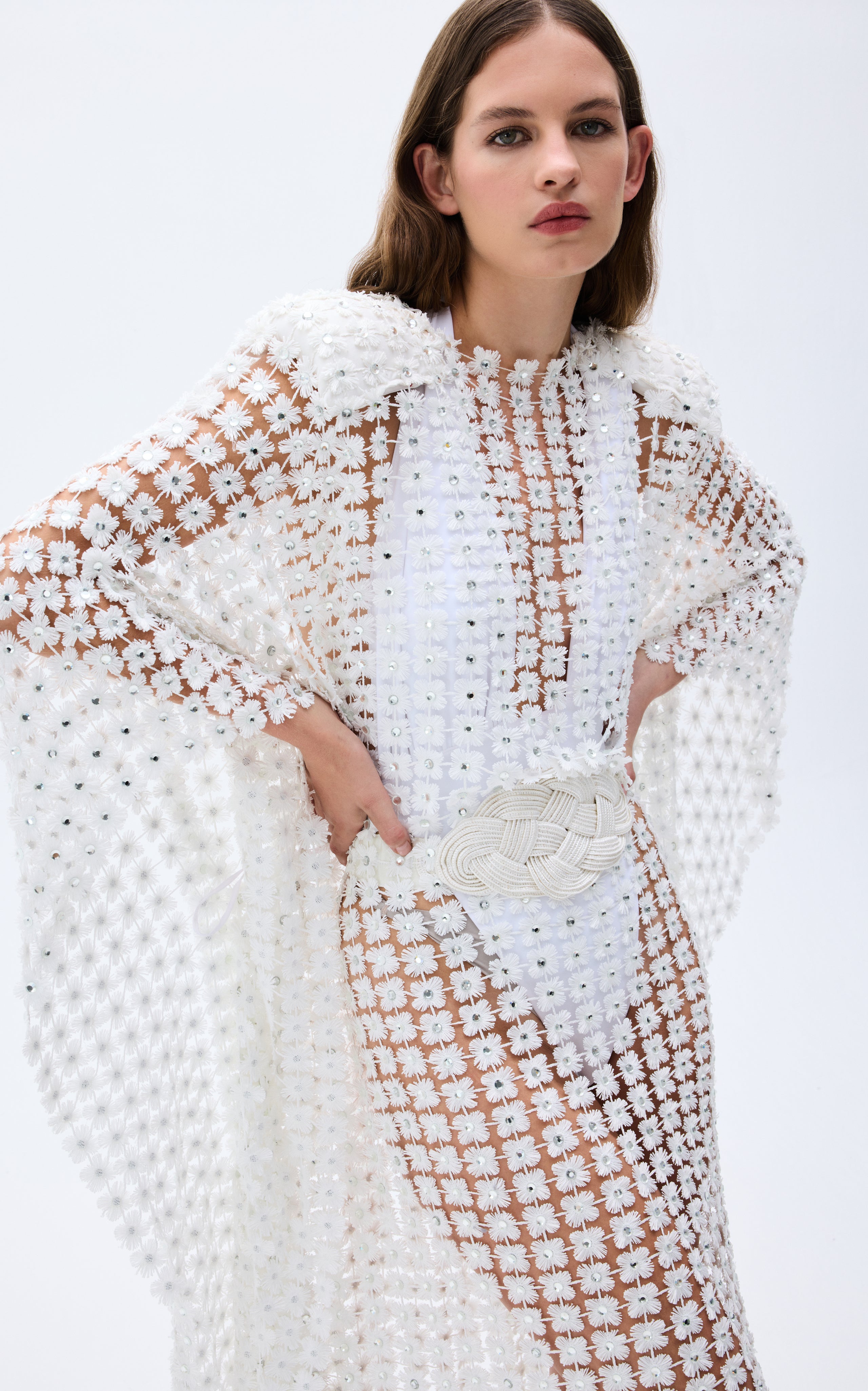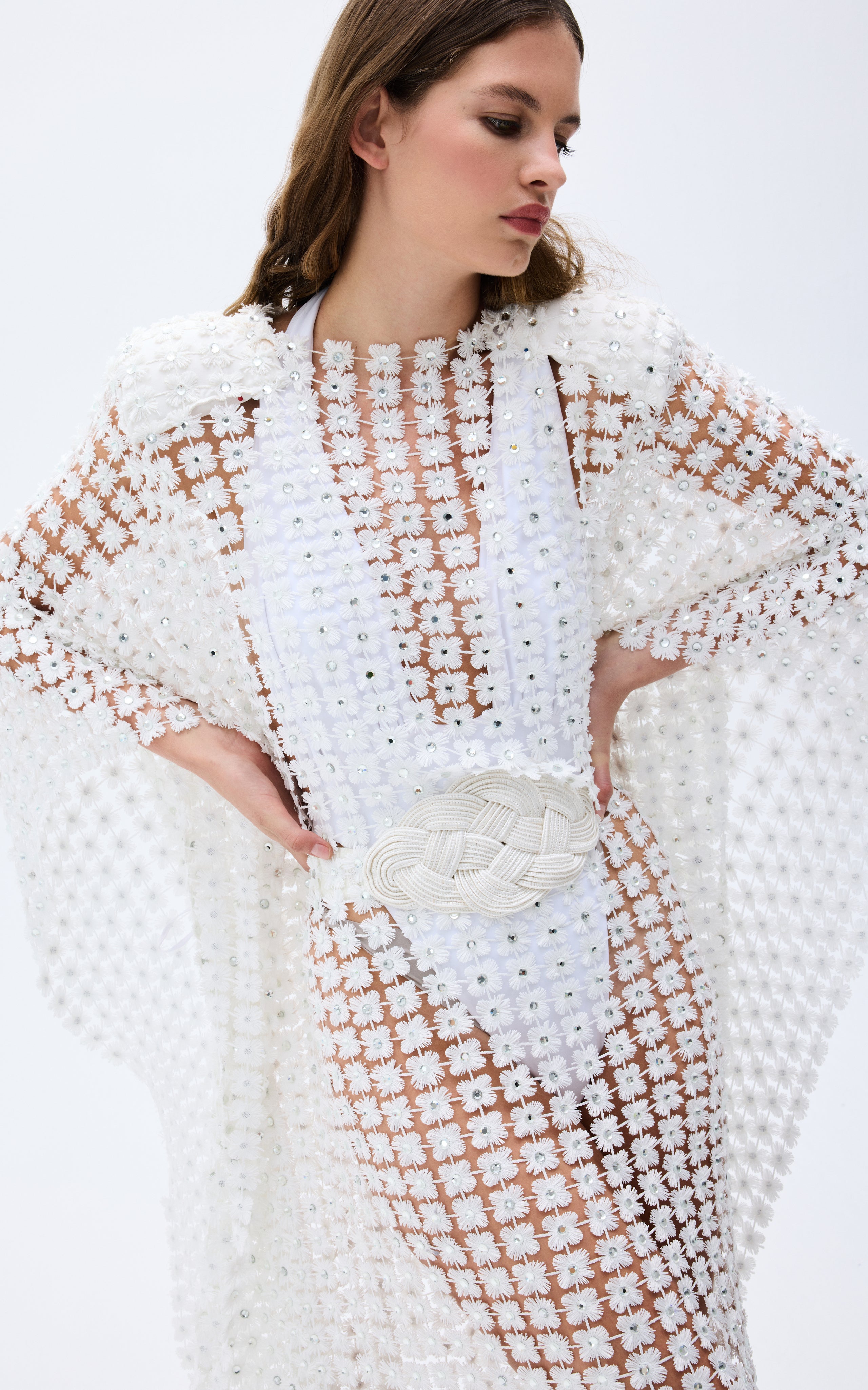 The floral embroidered transparent kaftan is enhanced with a handmade belt, offering a blend of bohemian elegance and luxury. Its delicate embroidery make it a standout piece for any occasion.