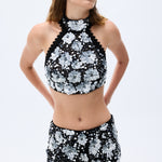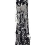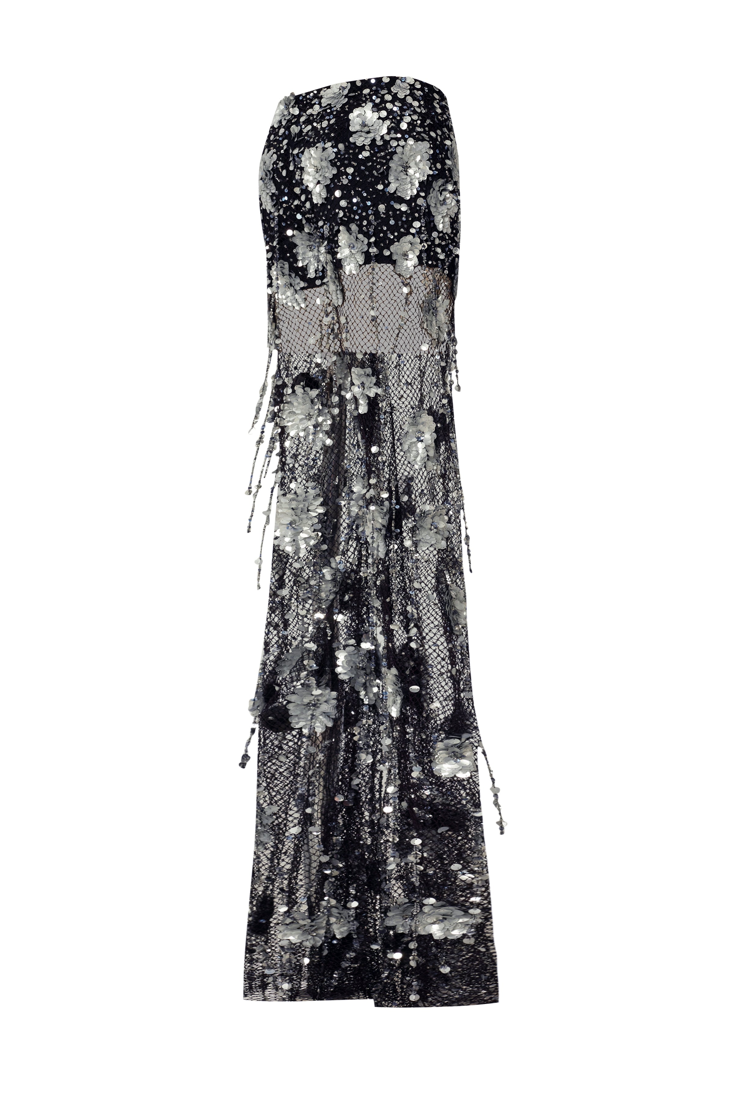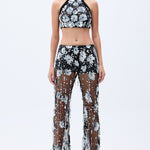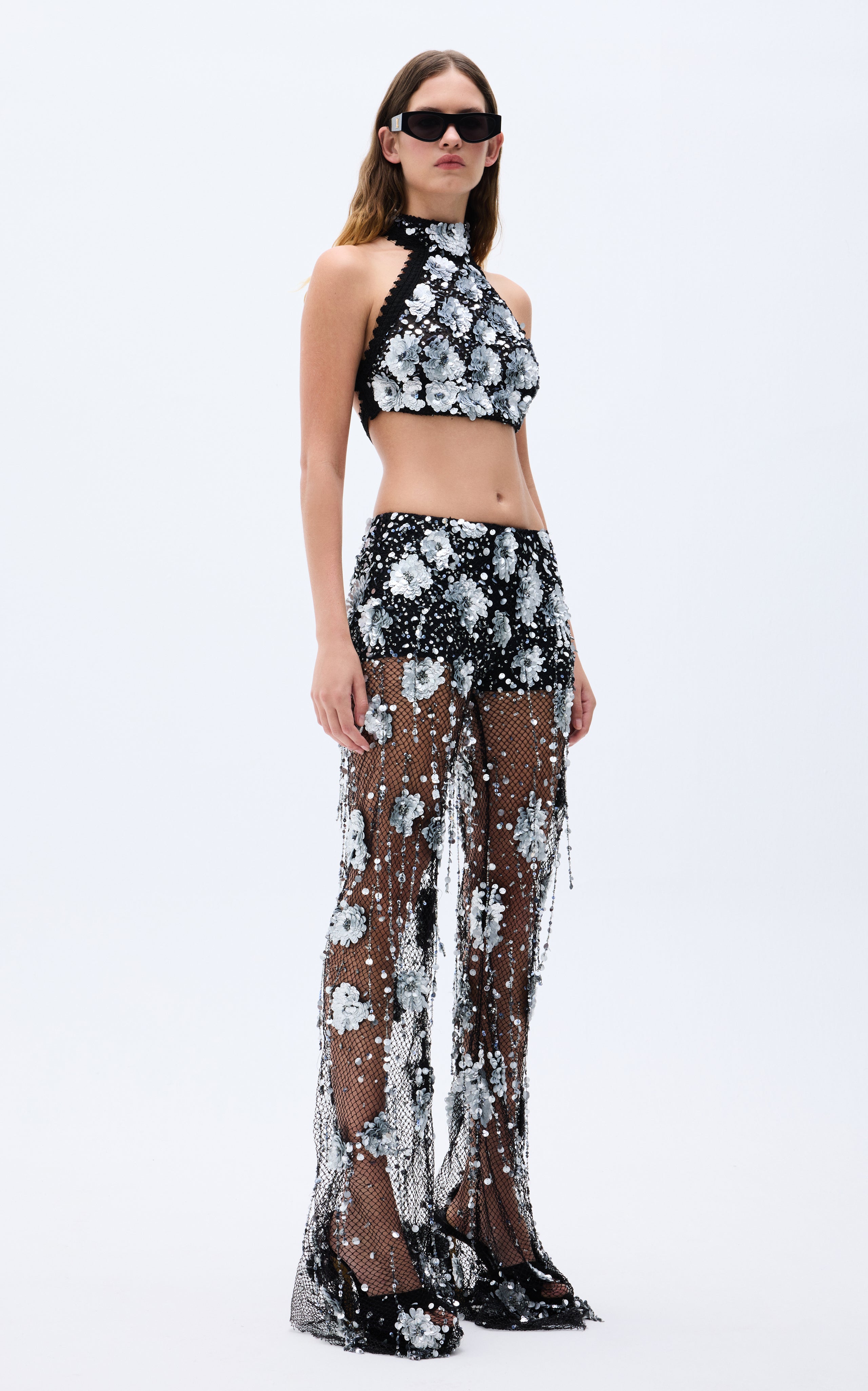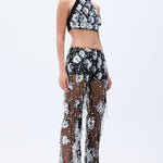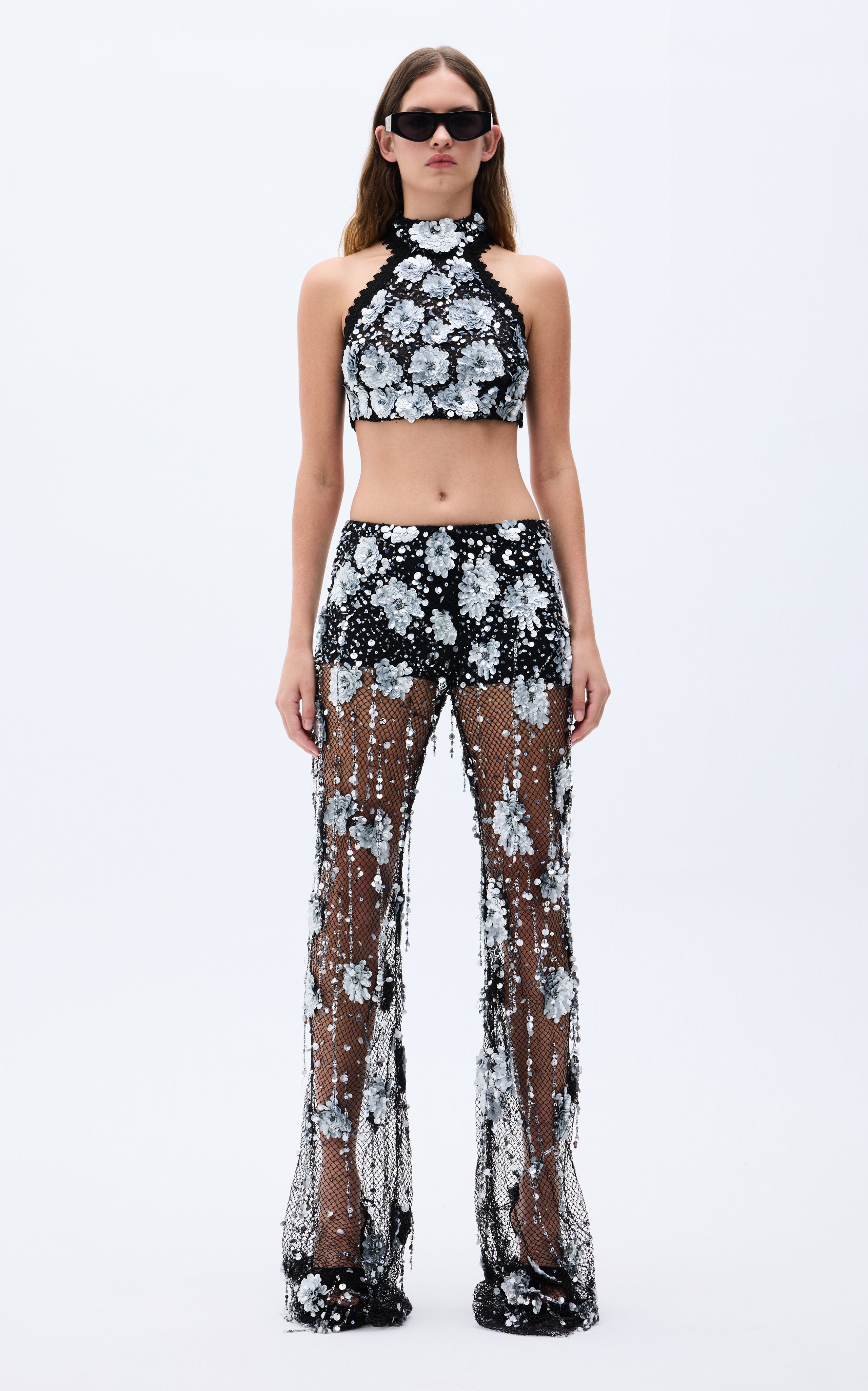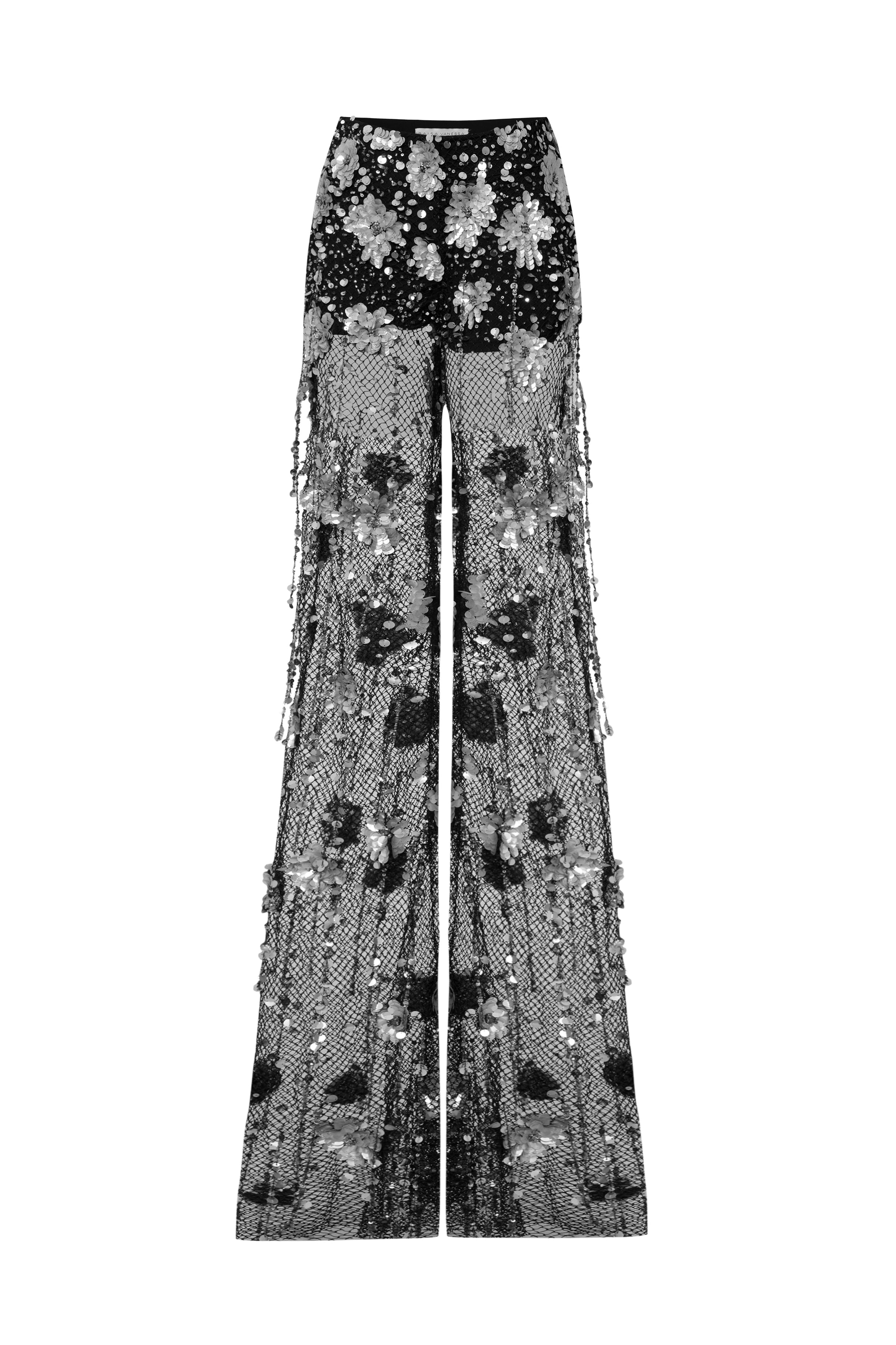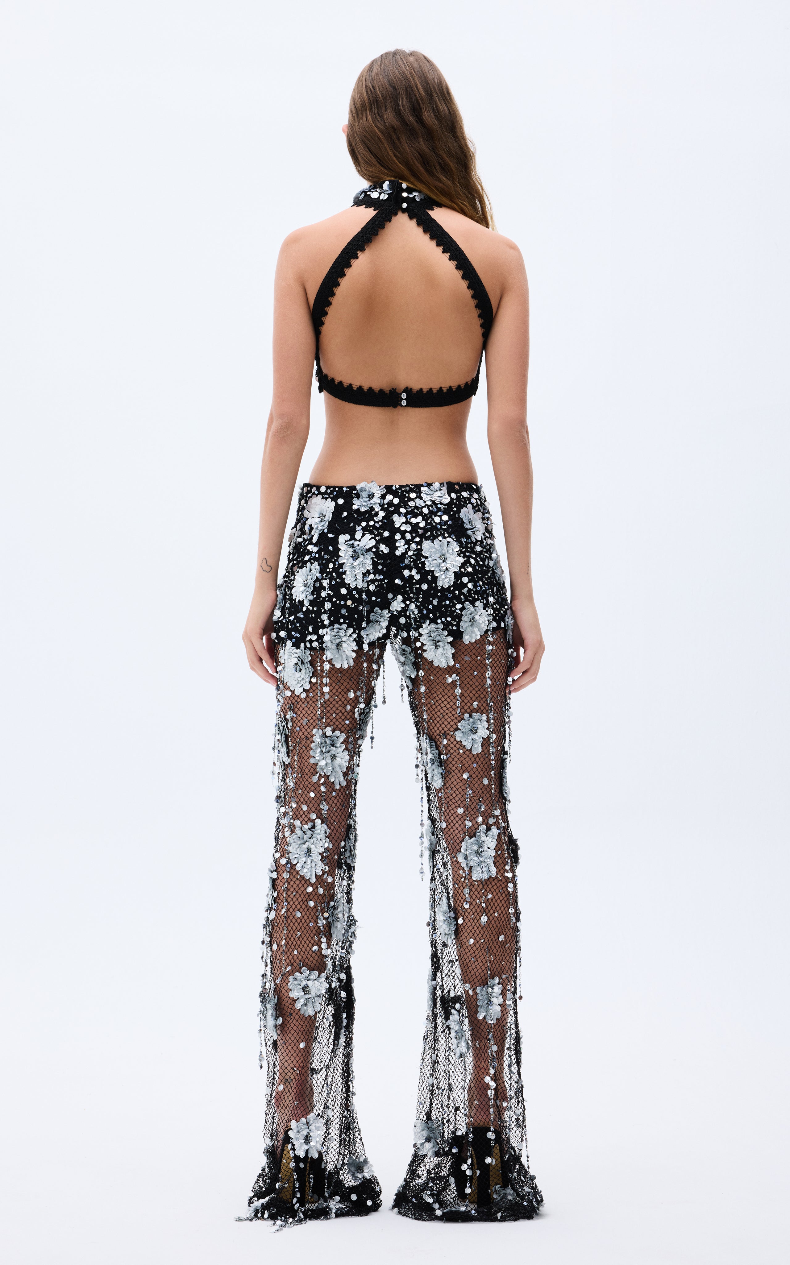 These black net flare pants are adorned with flower-shaped sequin embroidery, bringing a bold, yet graceful touch to their design. The flared silhouette and intricate detailing make them a unique and stylish addition to any outfit.