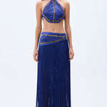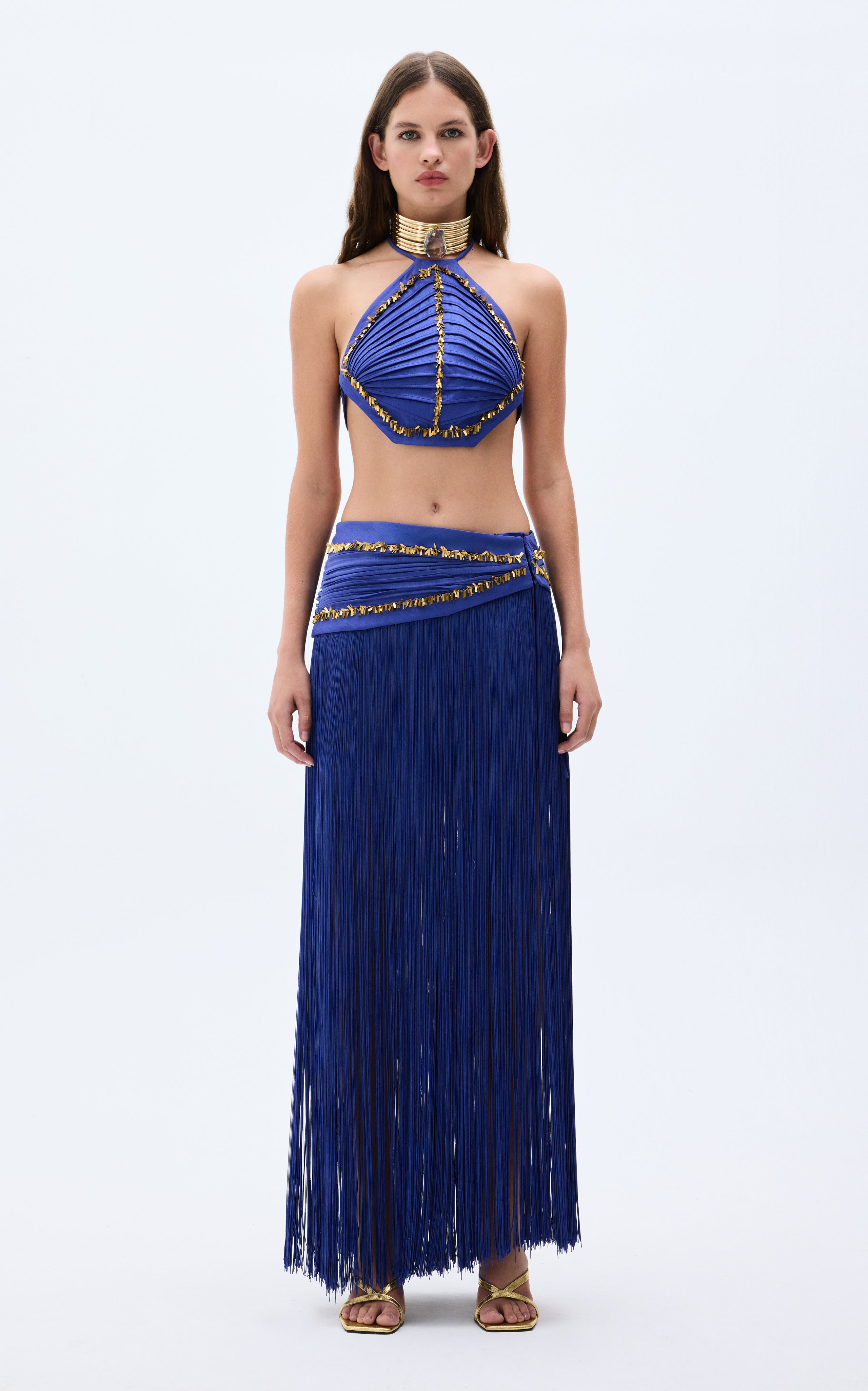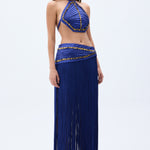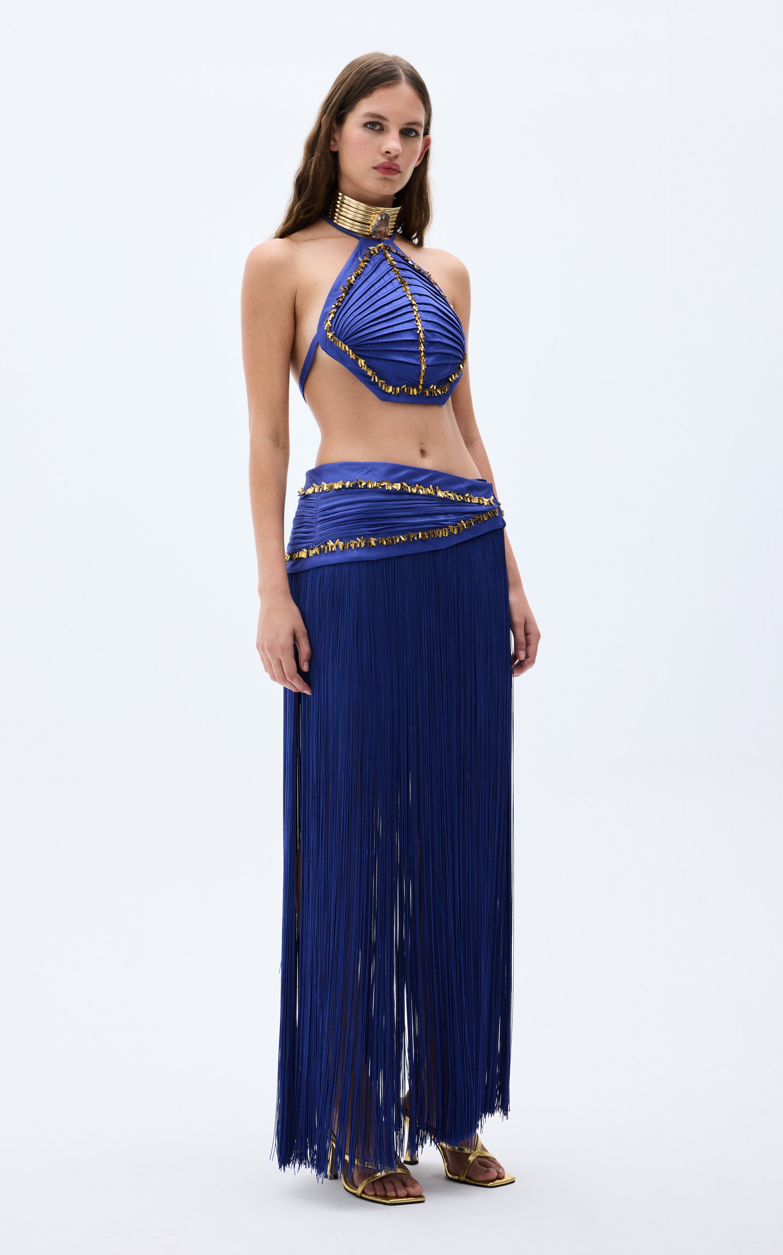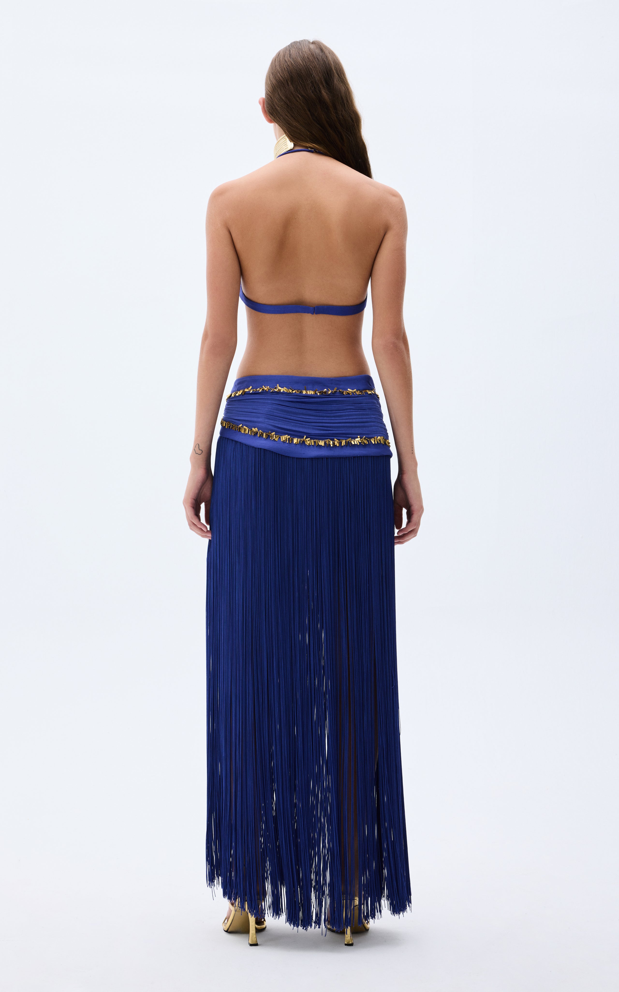 The fringed midi skirt with gold chain detail is the ultimate blend of bold and elegant. Its stylish fringe design moves effortlessly, while the gold chain adds a luxurious touch, making it the perfect statement piece for a chic and unforgettable look.