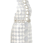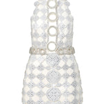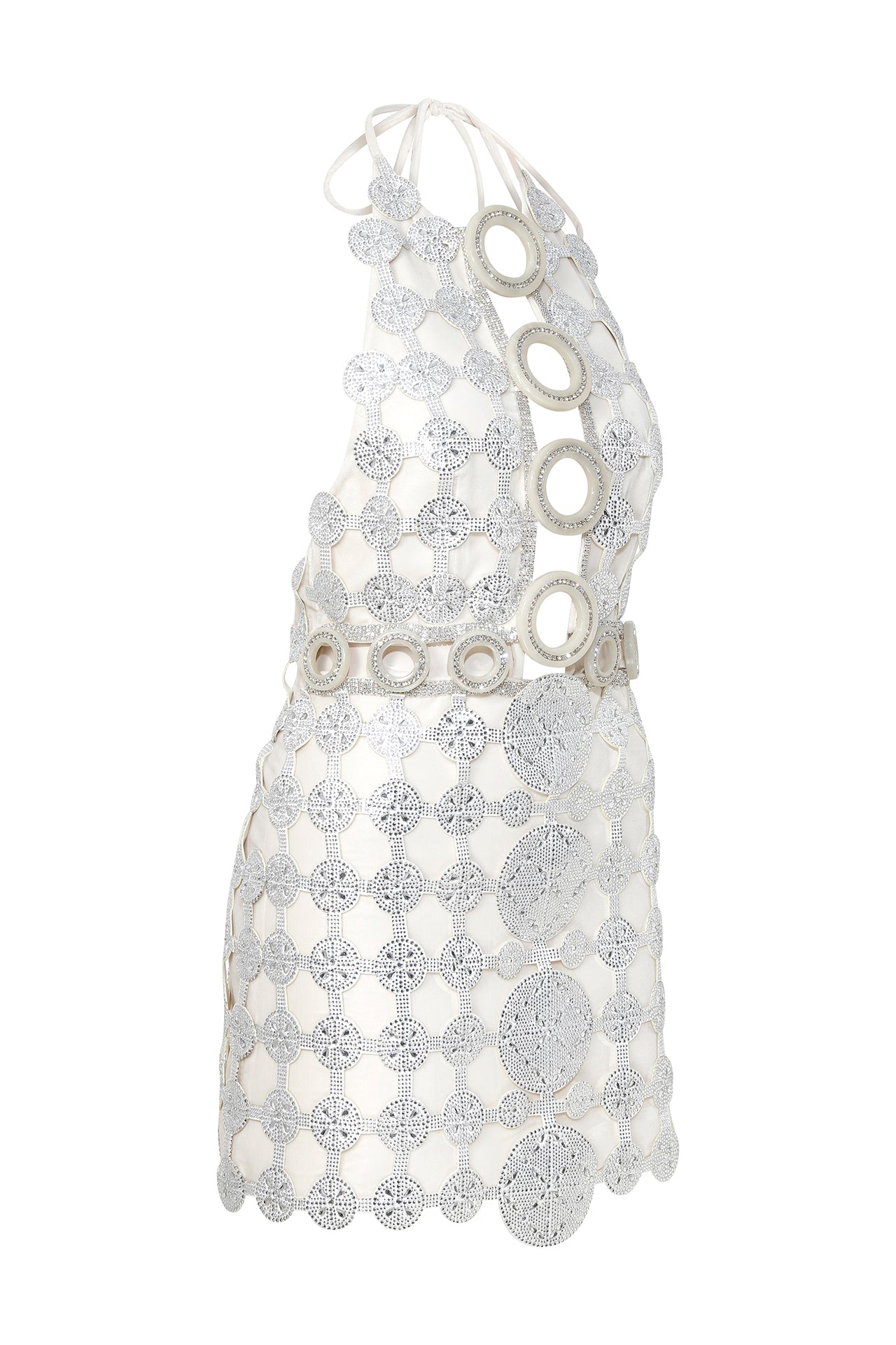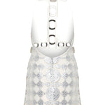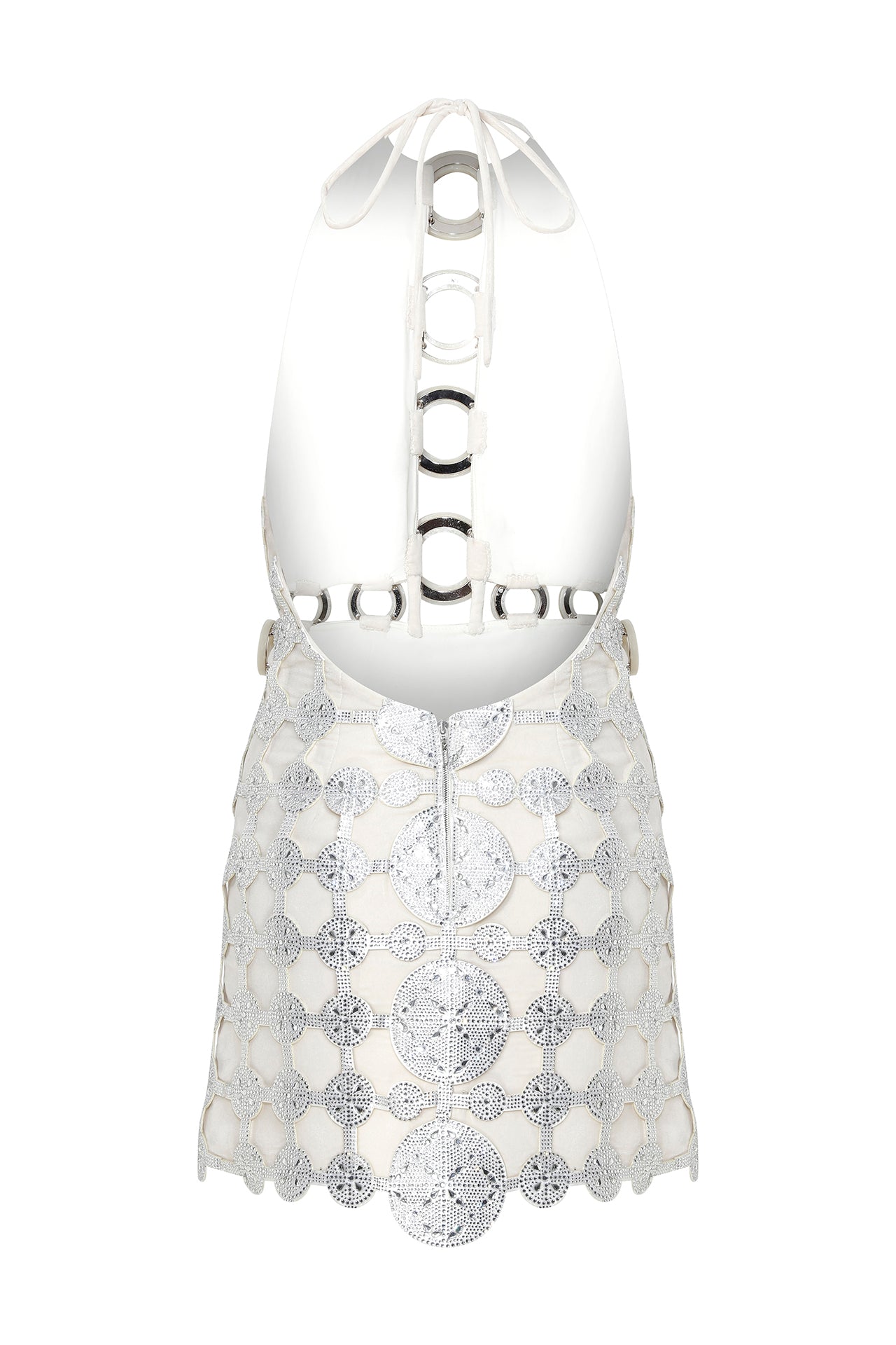A halter-neck mini dress adorned with intricate crystal embellishments, defined by bold circular motifs and sculptural neckline details that exude modern glamour.