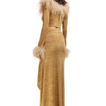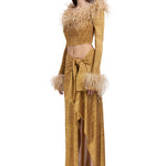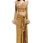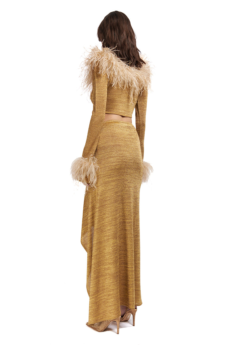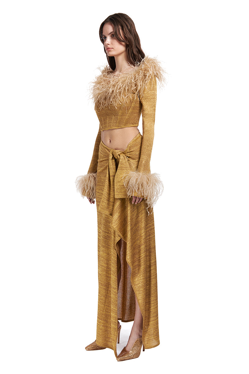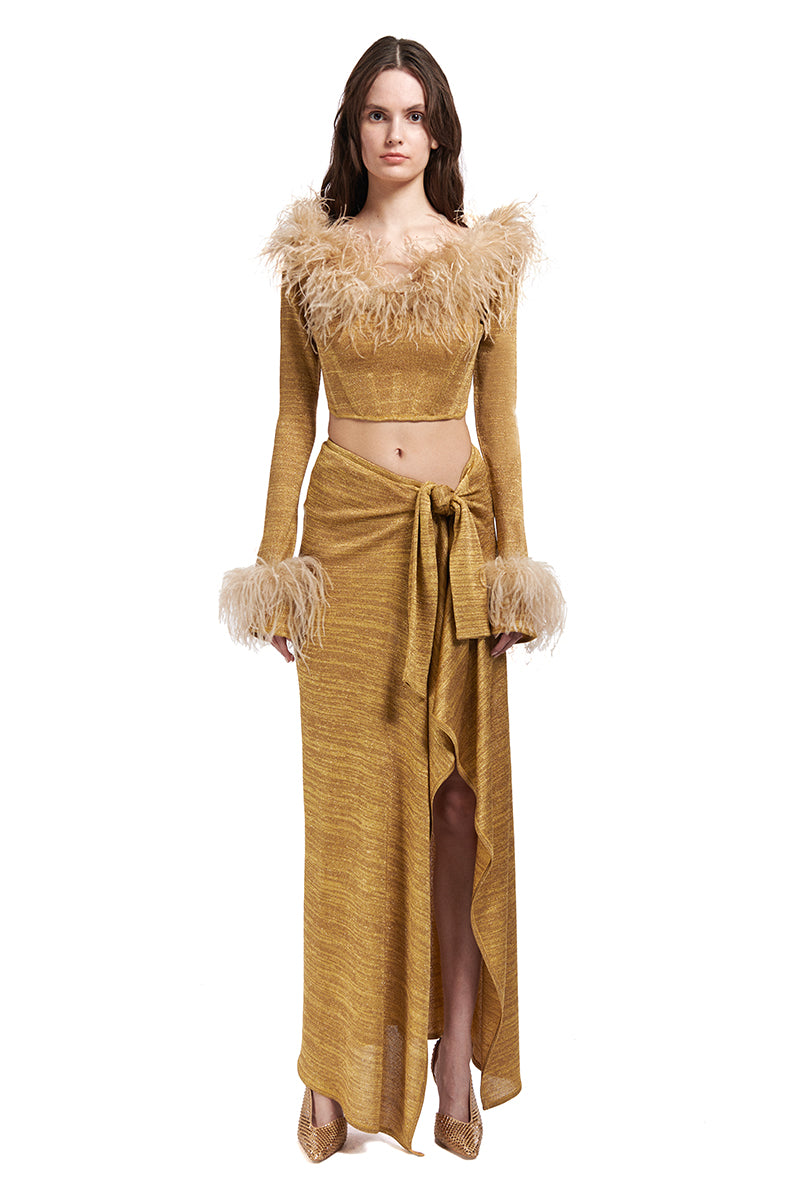 Glittered Knit Midi Skirt With High Slit and Bow Detail