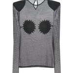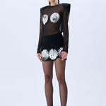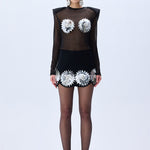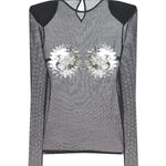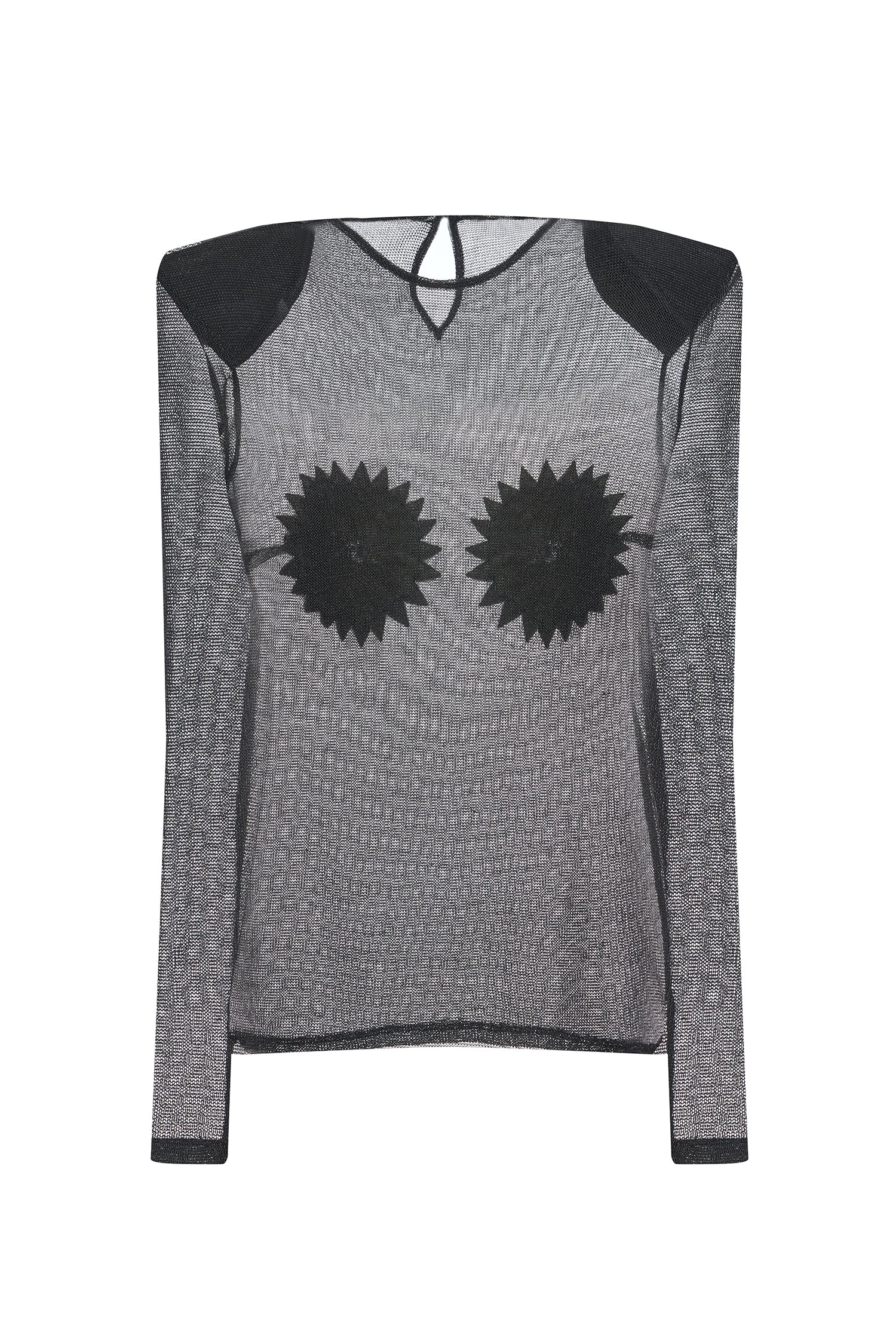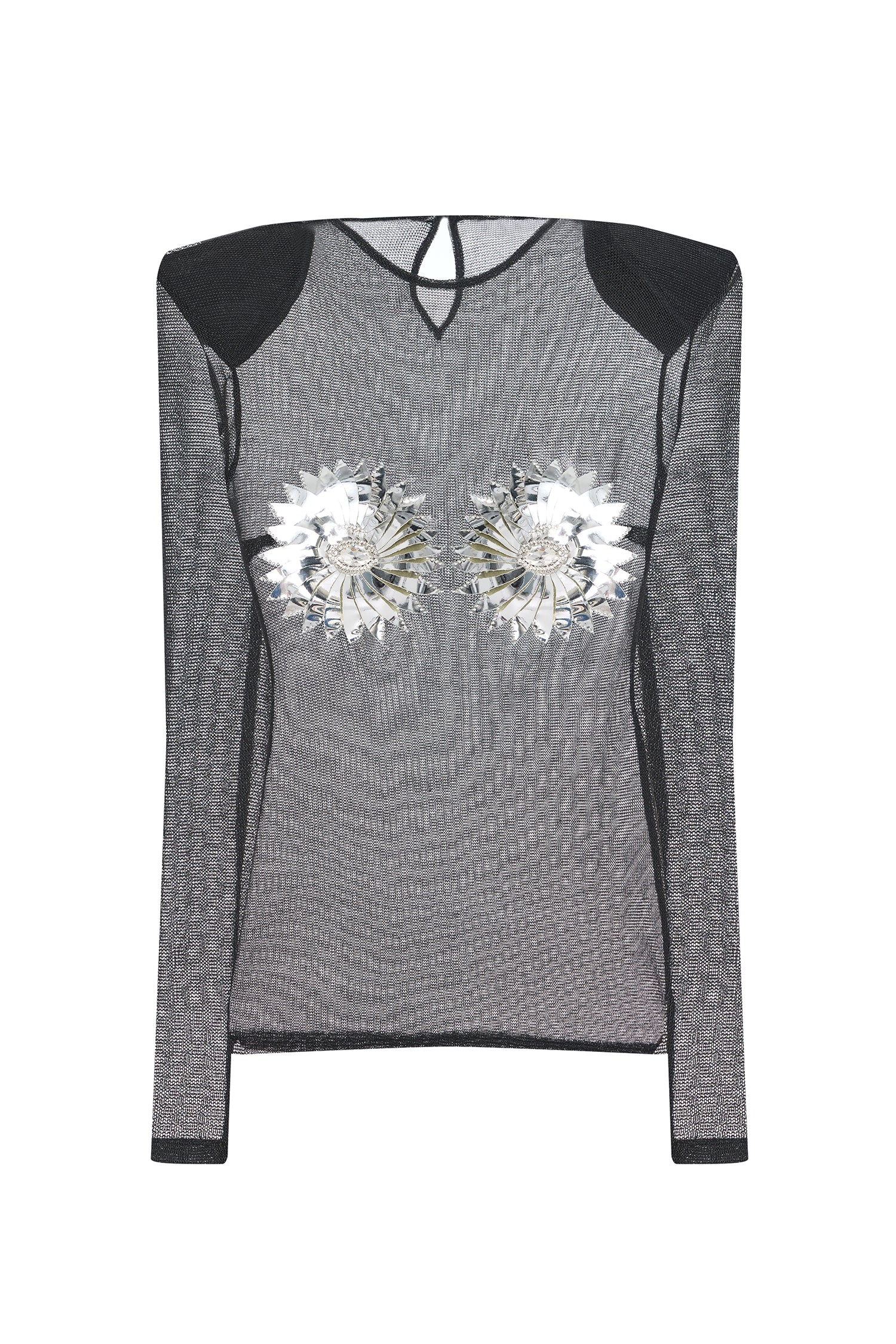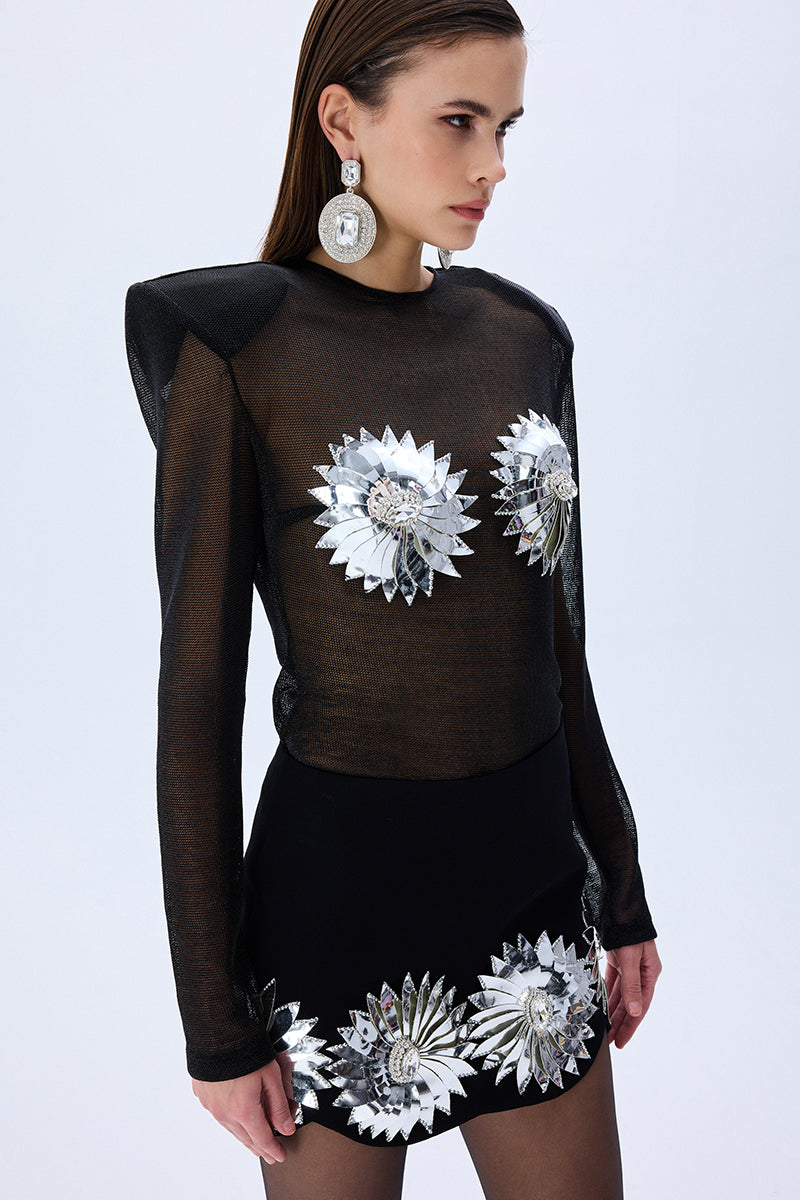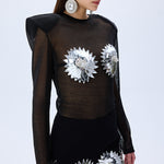 Sheer elegance meets bold design in this glittered weave top, crafted with a see-through silhouette that exudes modern allure. The structured shoulders add a powerful edge, while patent flower appliqués create a striking focal point, blending femininity with avant-garde style.