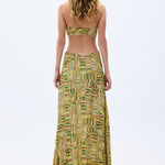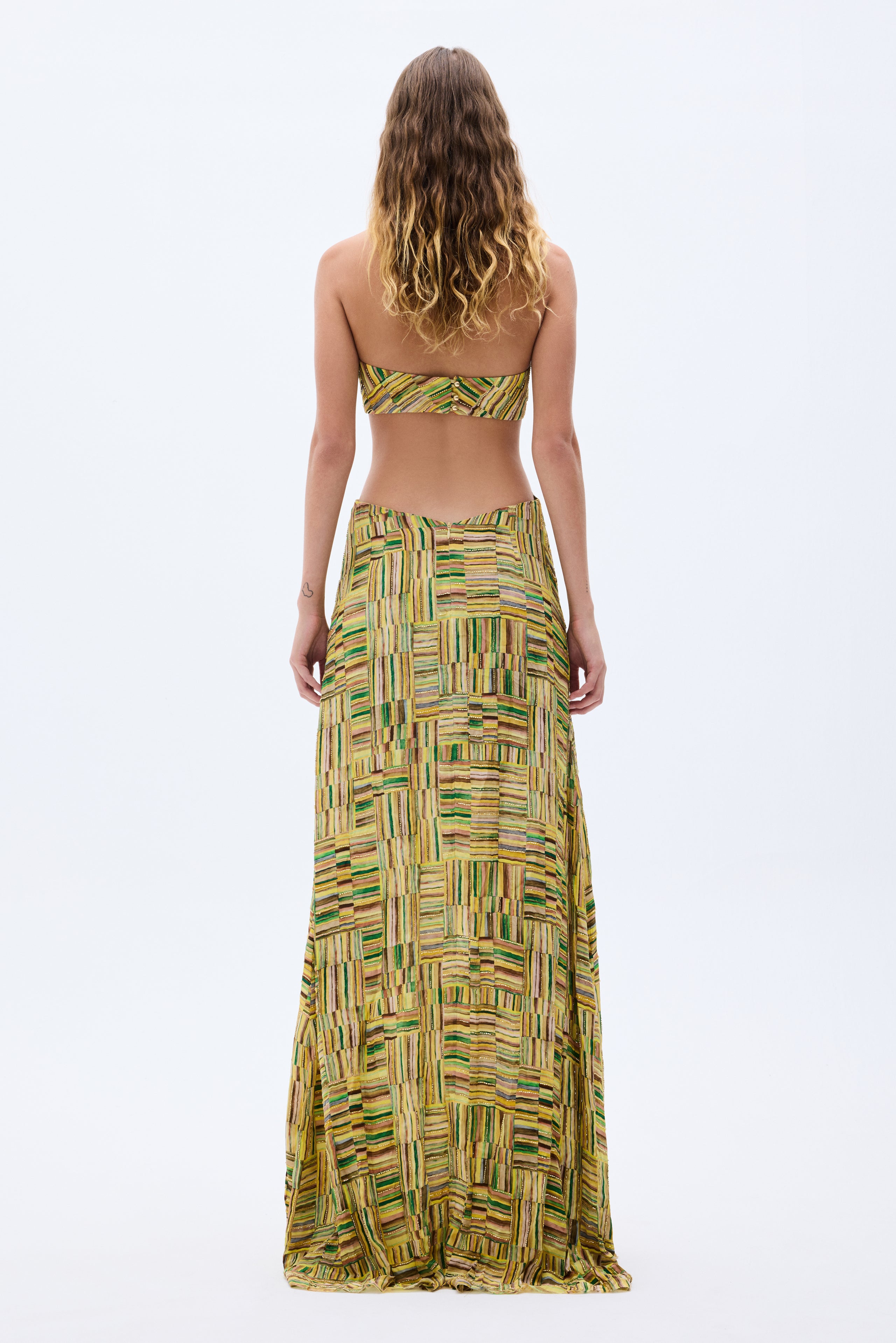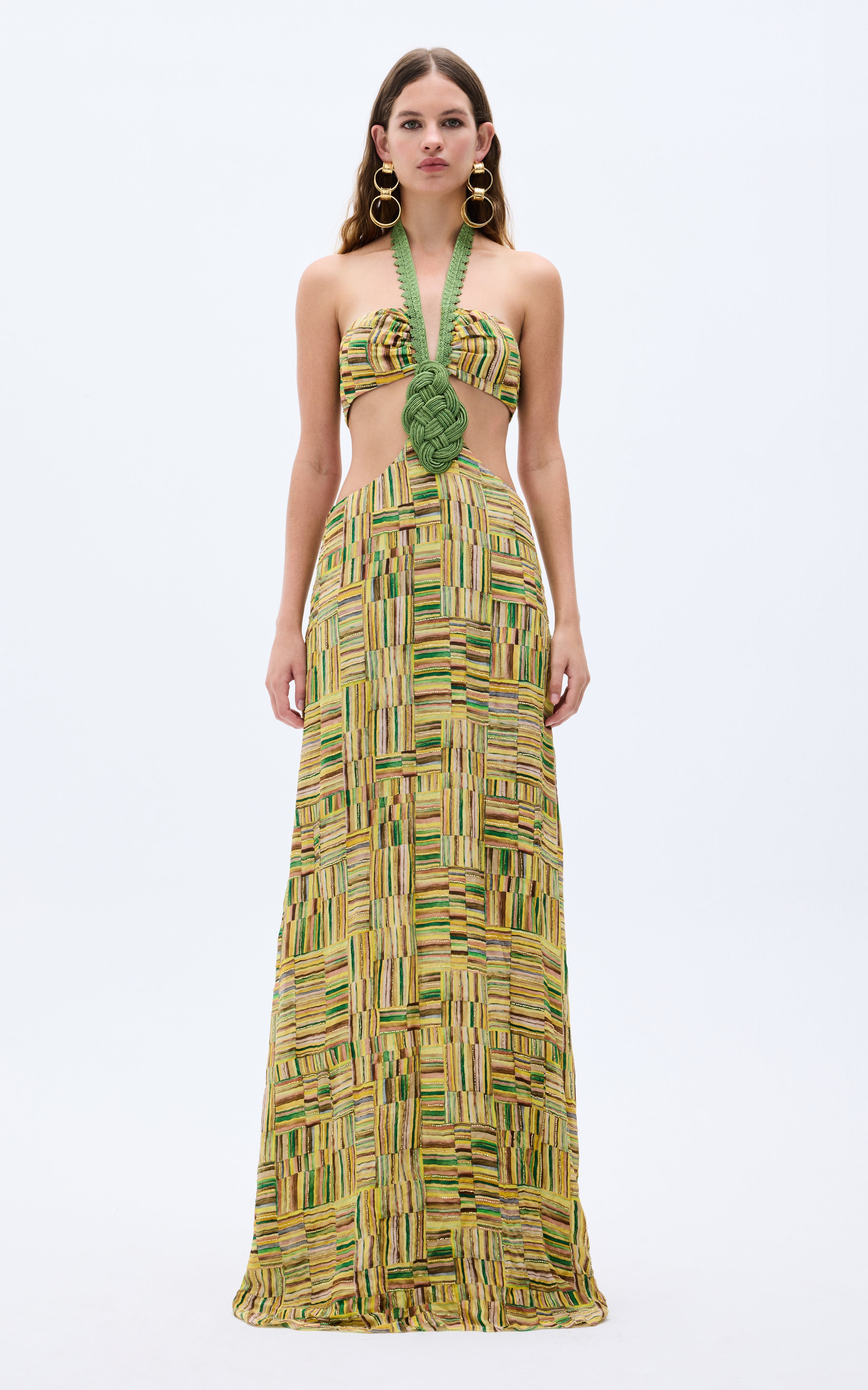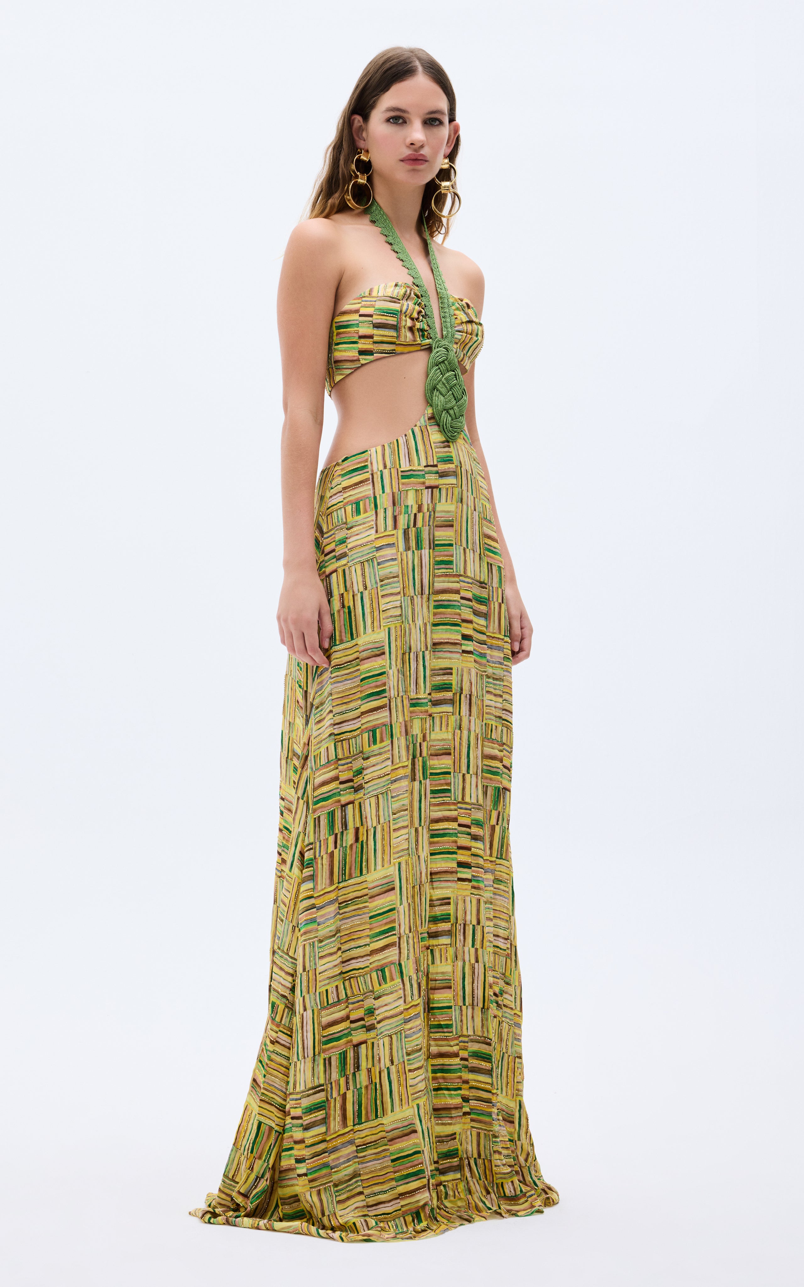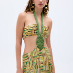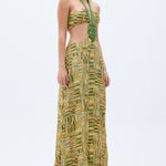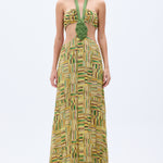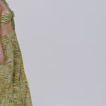 This show-stopping gold beaded chiffon dress exudes elegance and sophistication. Featuring a handmade belt, daring cut-out detail, it’s designed to turn heads at any event. The shimmering beaded print adds a touch of luxury to this stunning piece.
