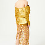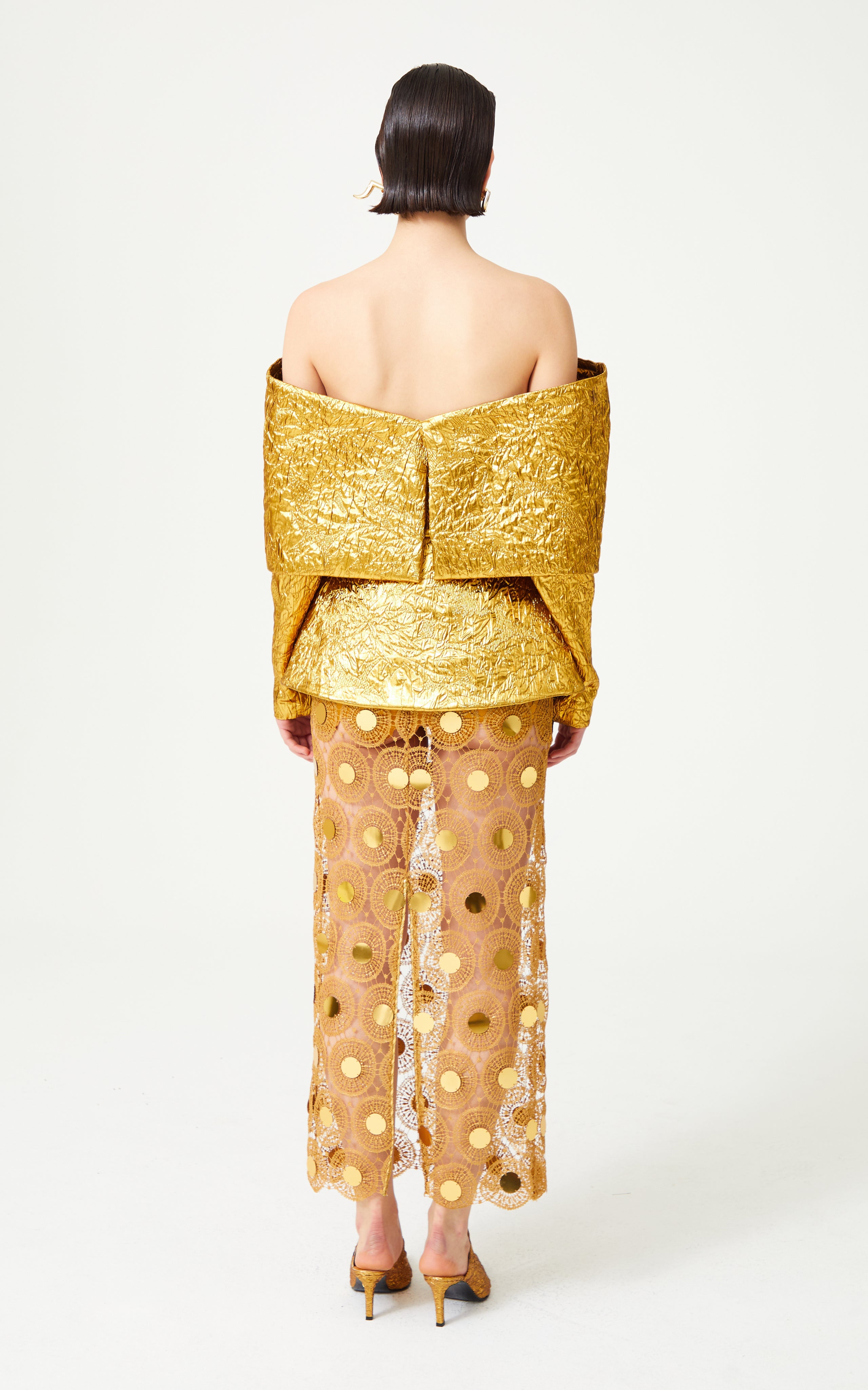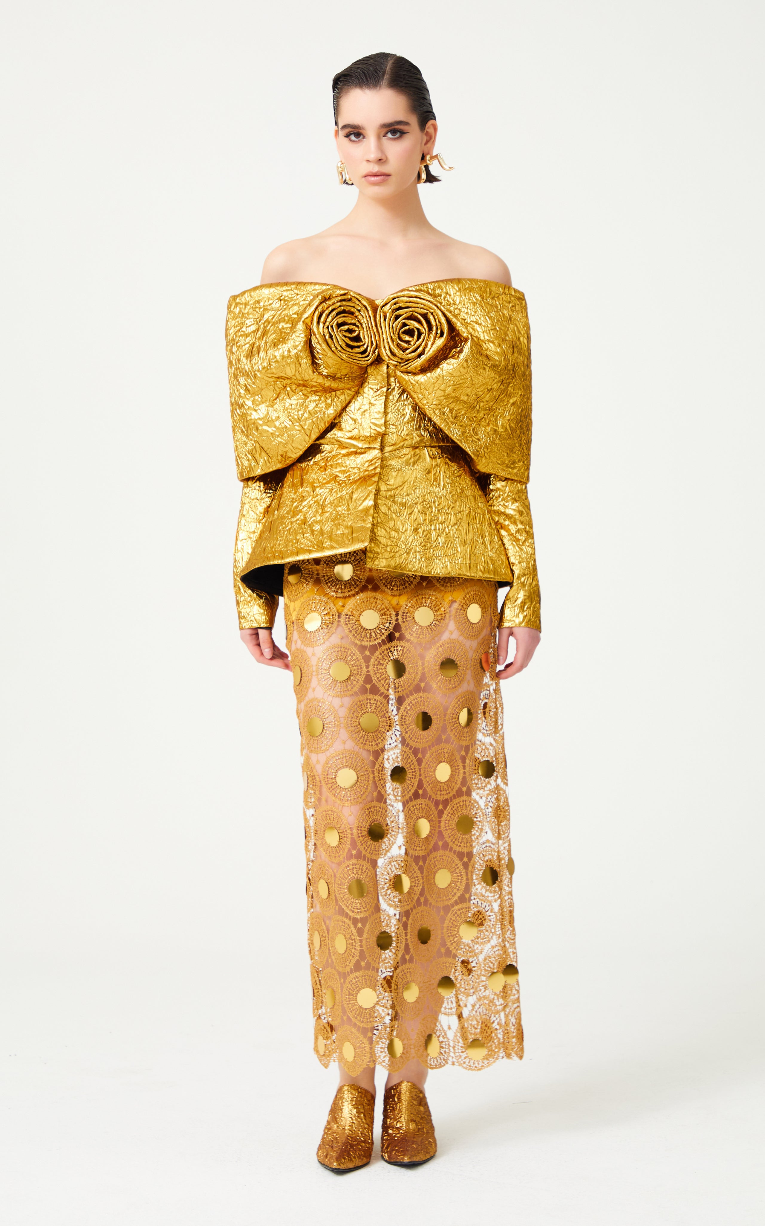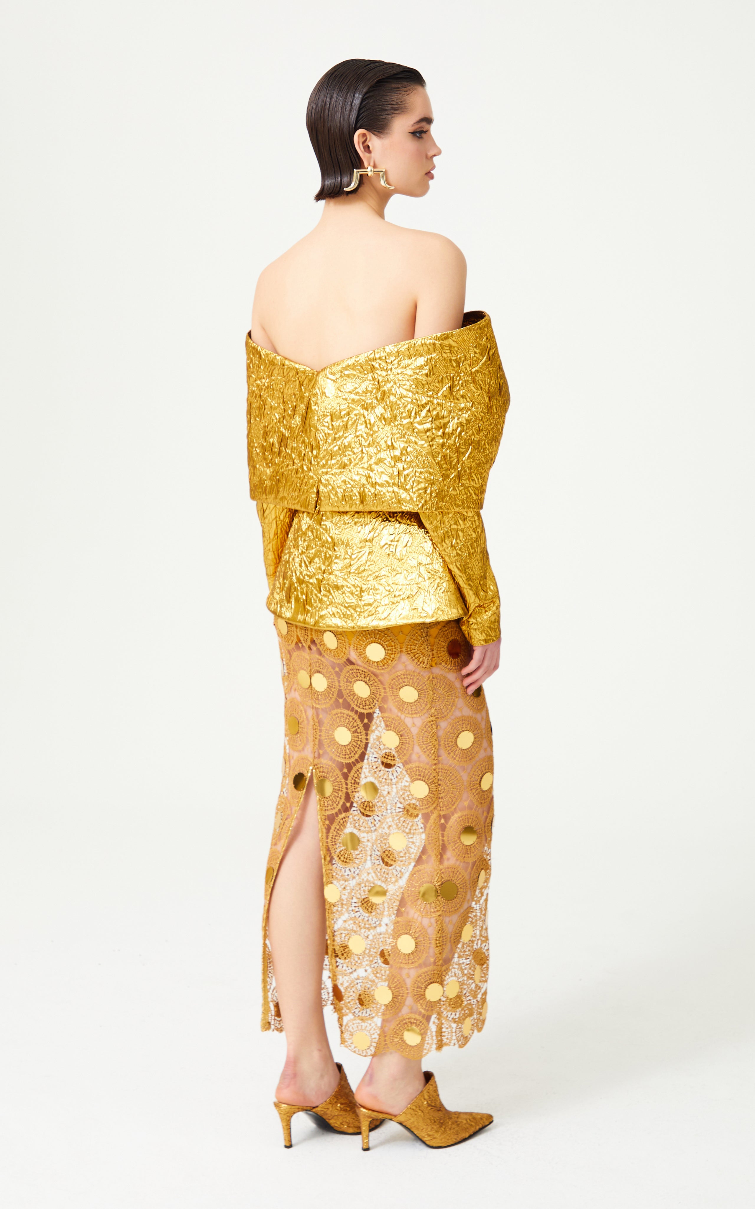 Indulge in elegance with our Gold Guipure Polka Dot Embroidered Maxi Skirt, adorned with intricate detailing and timeless charm. Crafted with delicate guipure lace and embroidered polka dots in shimmering gold, this skirt exudes sophistication and romance. The mini lining underneath adds a subtle hint of allure, while the maxi length provides a graceful and flowing silhouette. Perfect for special occasions or evenings out. Flaunt your style with this exquisite maxi skirt that effortlessly combines luxury and grace.