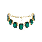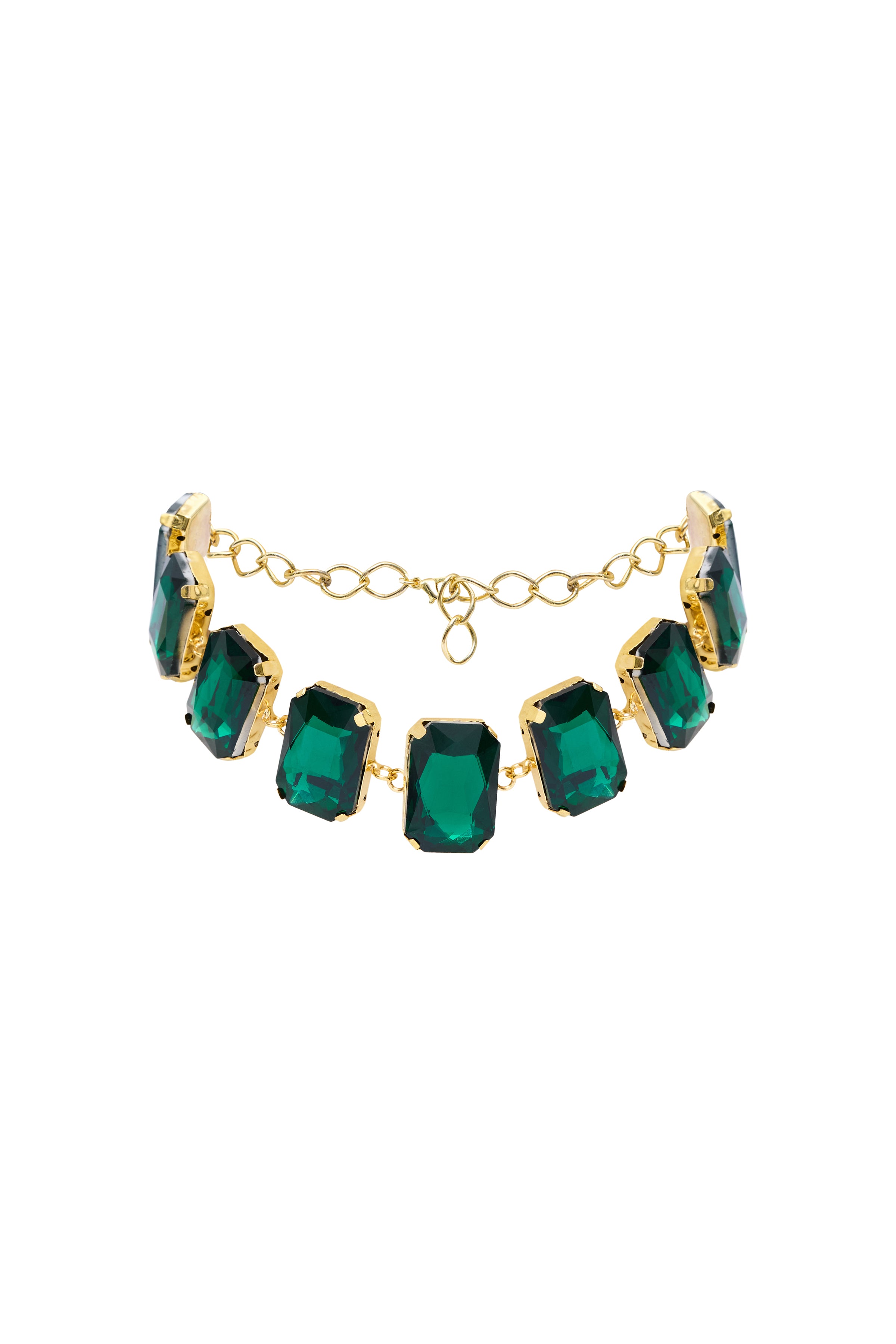 This sculptural gold metal choker is adorned with emerald-toned stones, offering a striking blend of modern elegance and timeless glamour. A bold finish for elevated necklines.