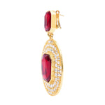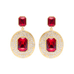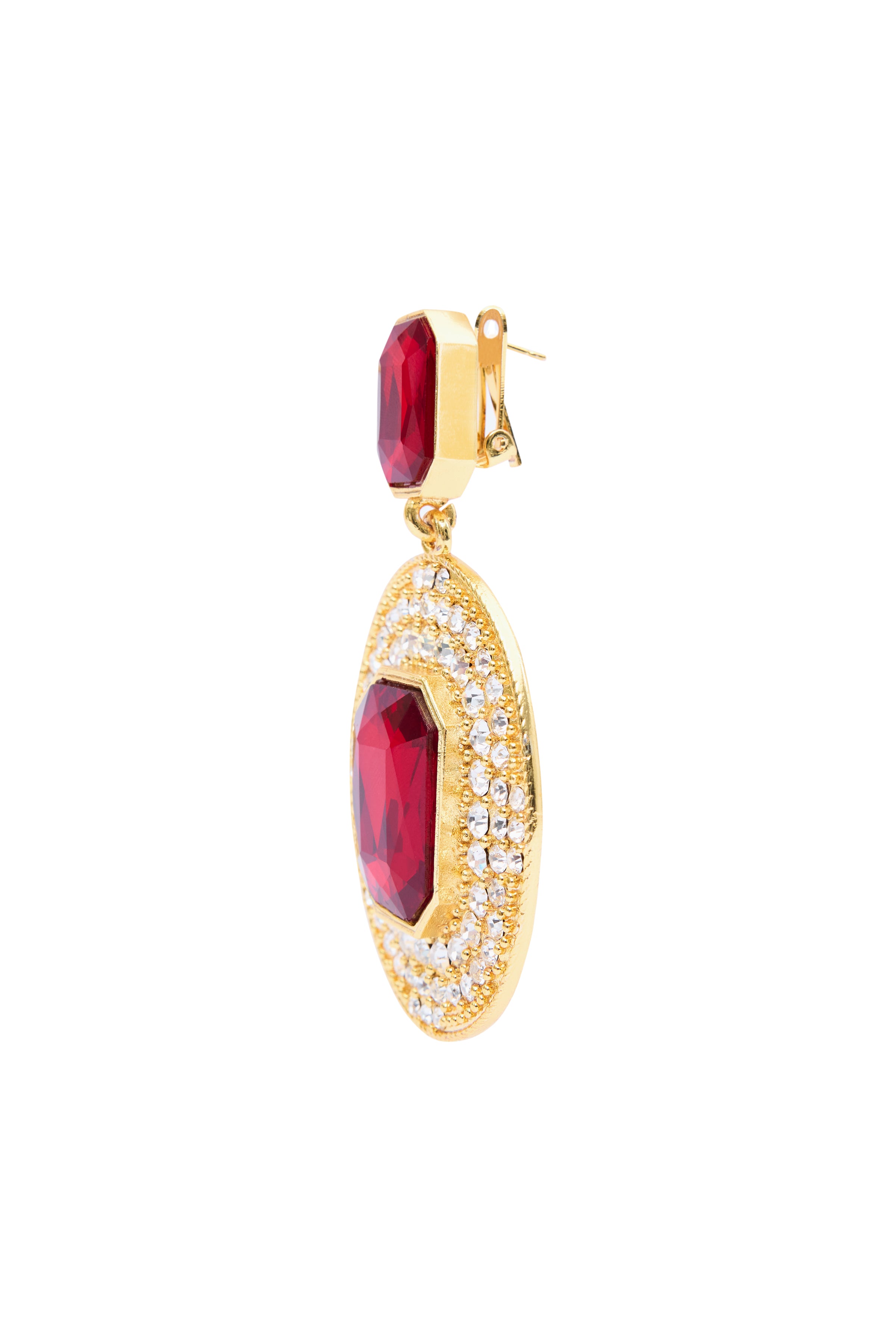 A radiant fusion of glamour and timeless sophistication, these gold metal earrings are adorned with shimmering crystals and bold red stones. The geometric composition and rich color palette evoke a vintage-inspired elegance, while the high-shine finish adds a modern twist.