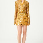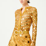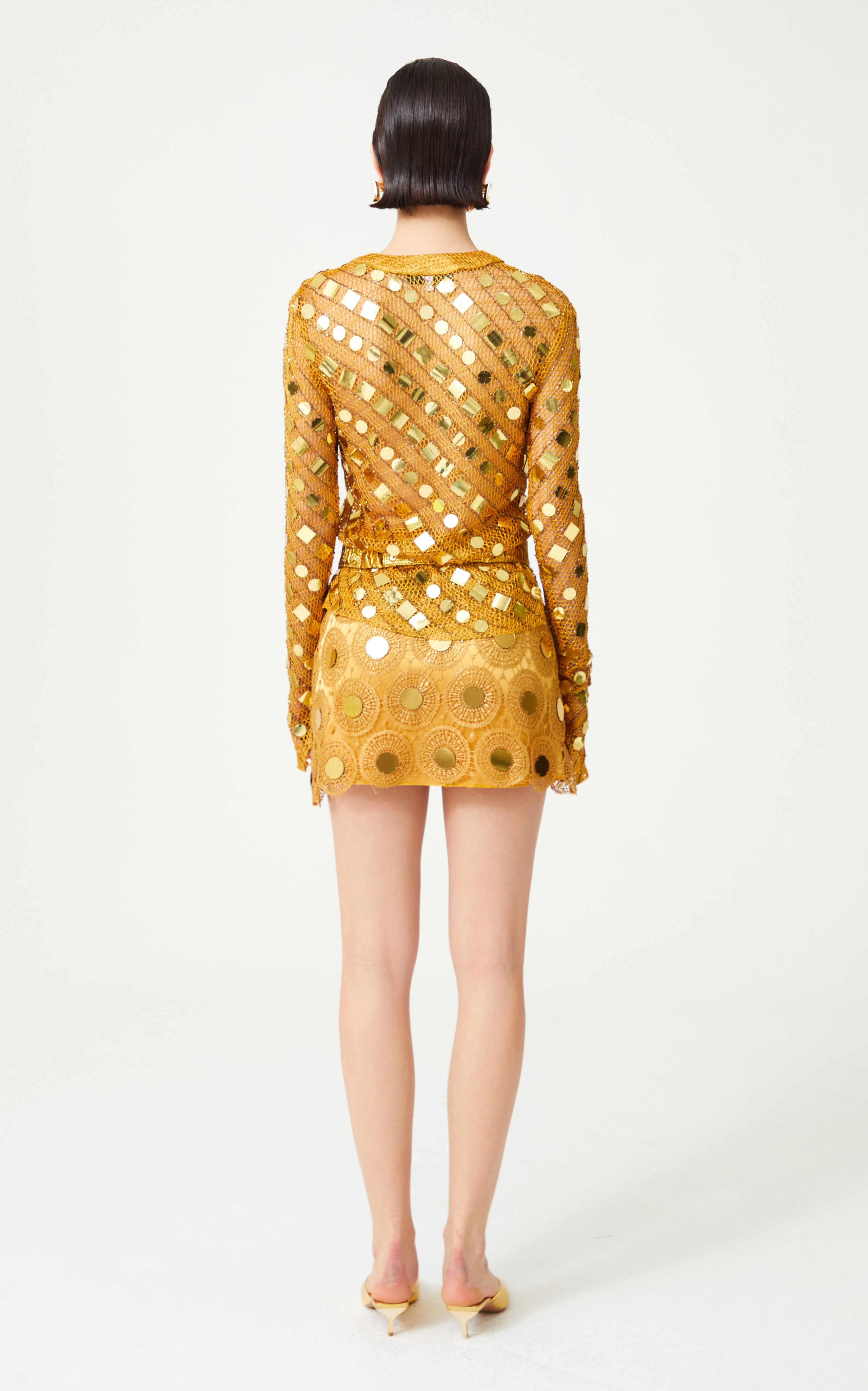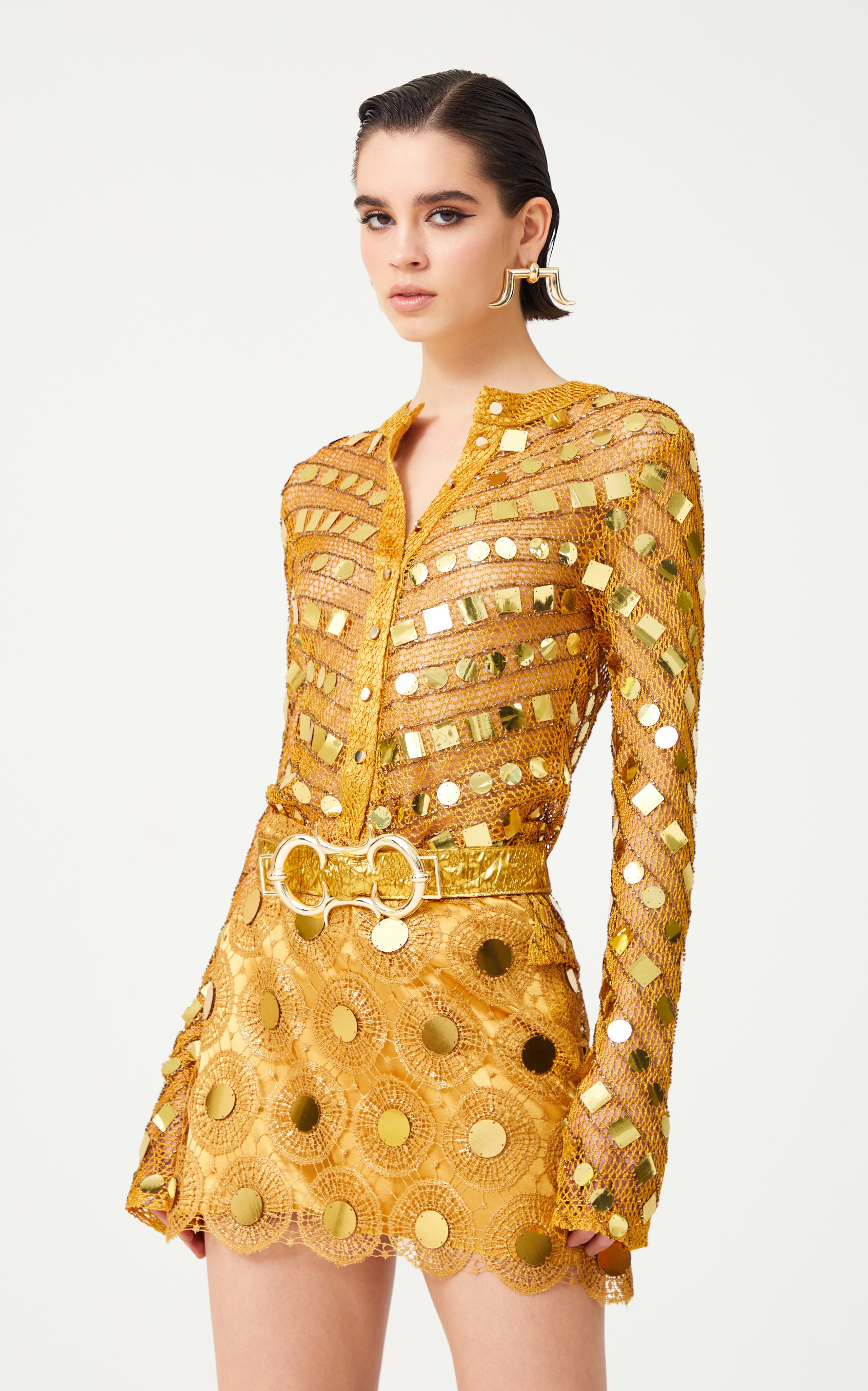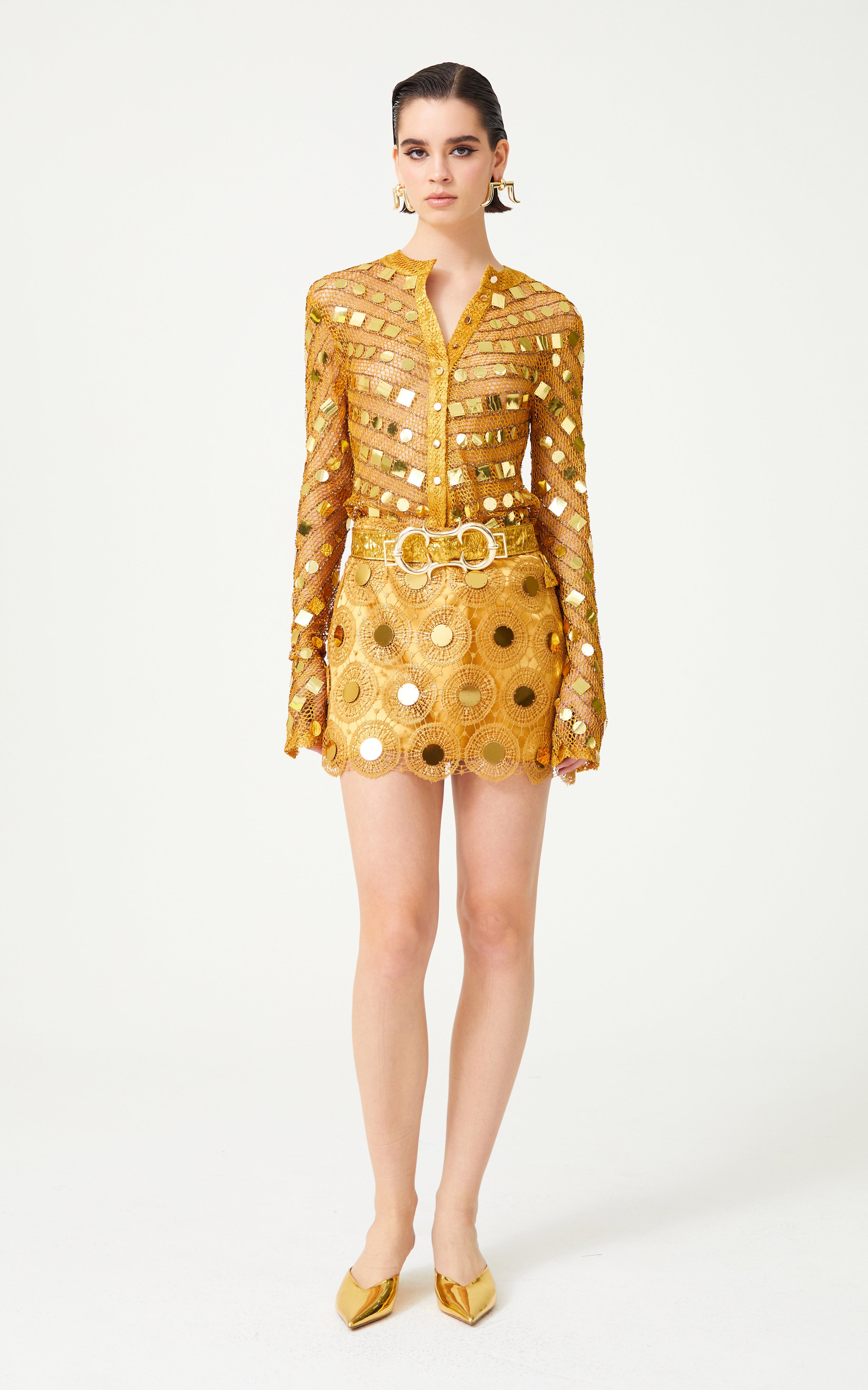 Make a bold statement with our Gold Sequin Embroidered Mini Skirt, a dazzling piece that exudes glamour and sophistication. Adorned with intricate sequin embroidery, this skirt sparkles and shines with every movement, ensuring you stand out from the crowd. The mini length adds a playful and flirty touch, making it perfect for nights out or special occasions where you want to make an impression. Embrace your inner sparkle with this stunning mini skirt that combines elegance with a touch of sparkle.