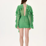 Green Chiffon Mini Dress with Ruffled Sleeves and Stoned Neckline