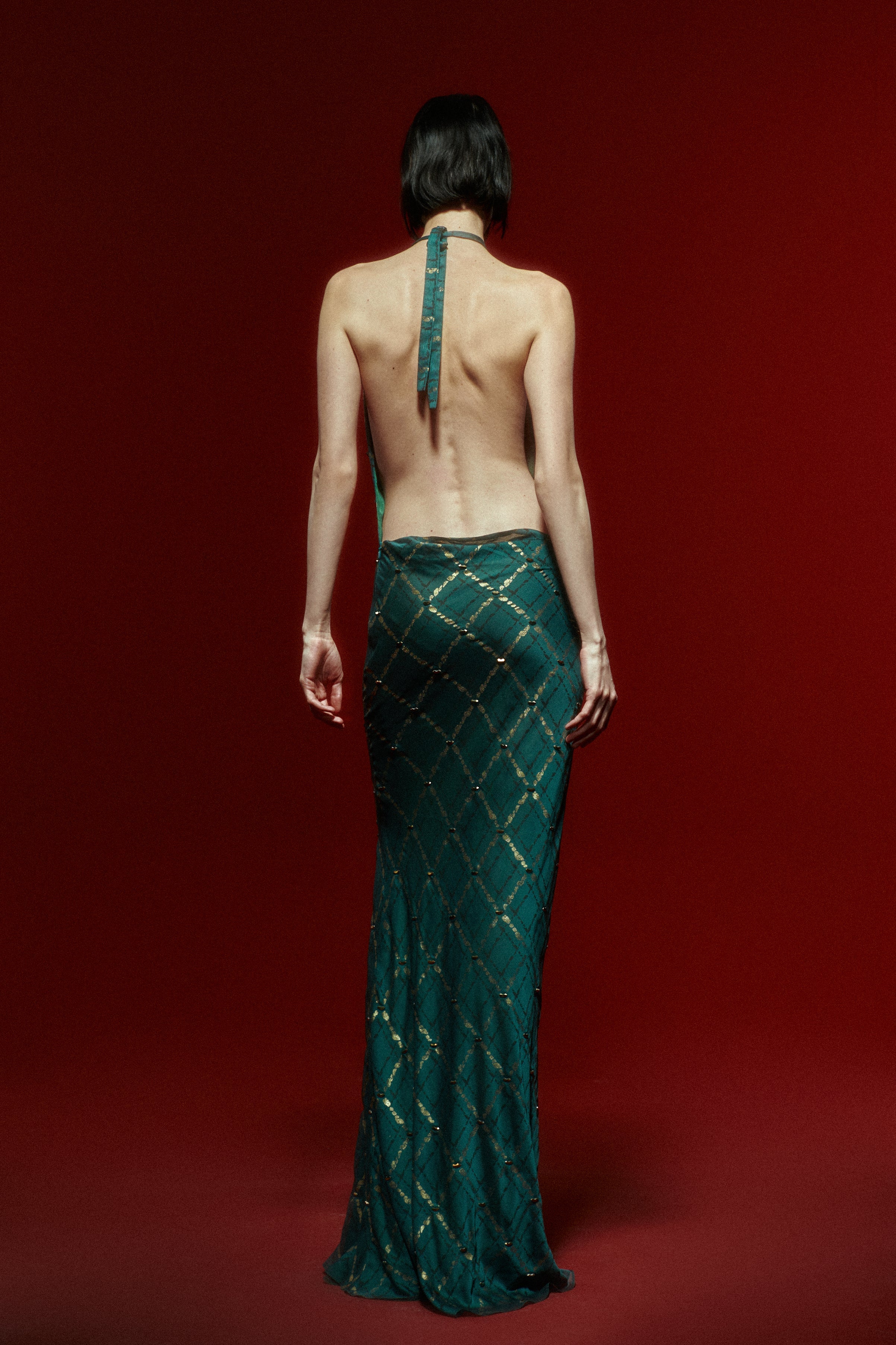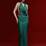 A green degage neck maxi dress with gold stone, finished wiith print details.