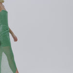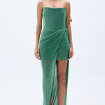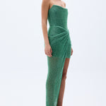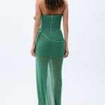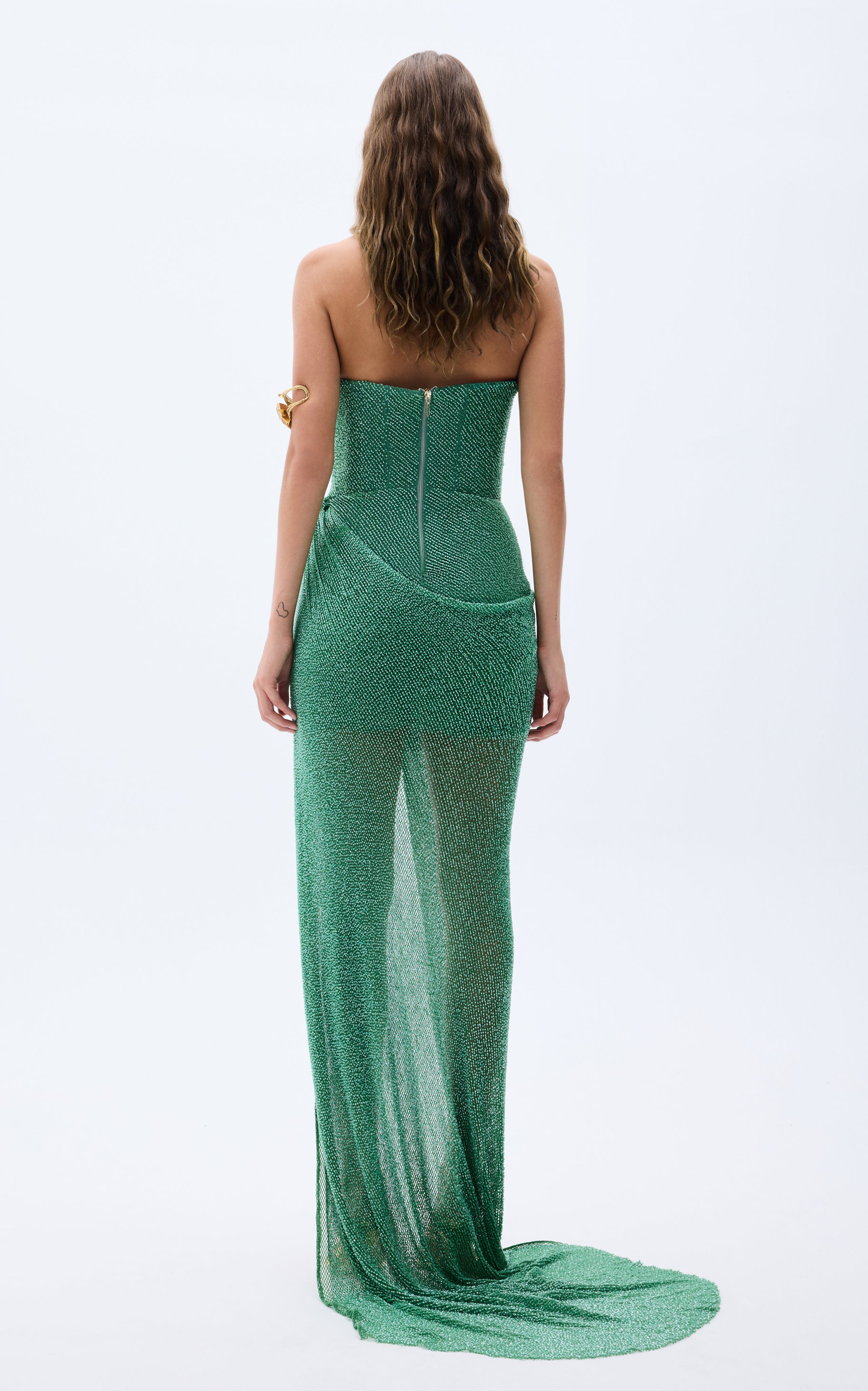 The green sequined net corseted gown features dazzling sequins and a figure-flattering corset design. The sultry slit adds a touch of drama, making it the perfect choice for a glamorous, show-stopping look.