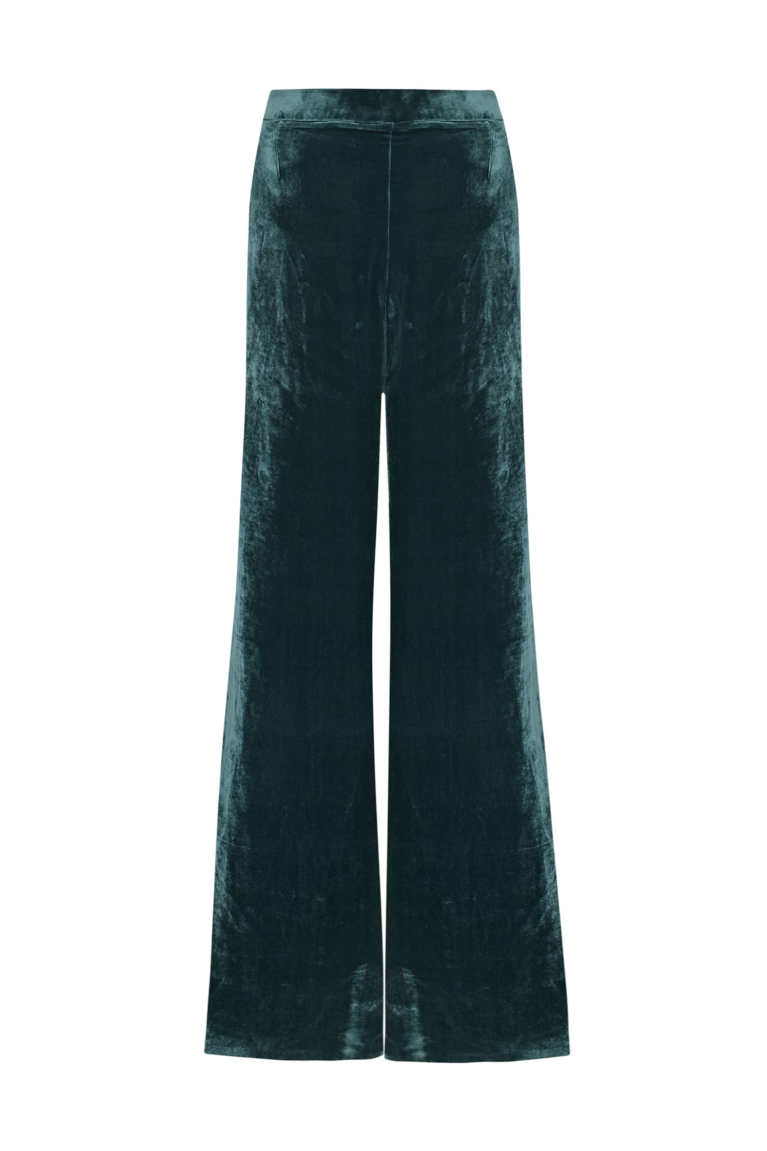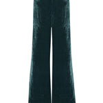 Green velvet wide leg pants feature a relaxed yet tailored silhouette with a soft and subtle shine. The high-rise fit and fluid movement offer effortless sophistication for both day and evening styling.