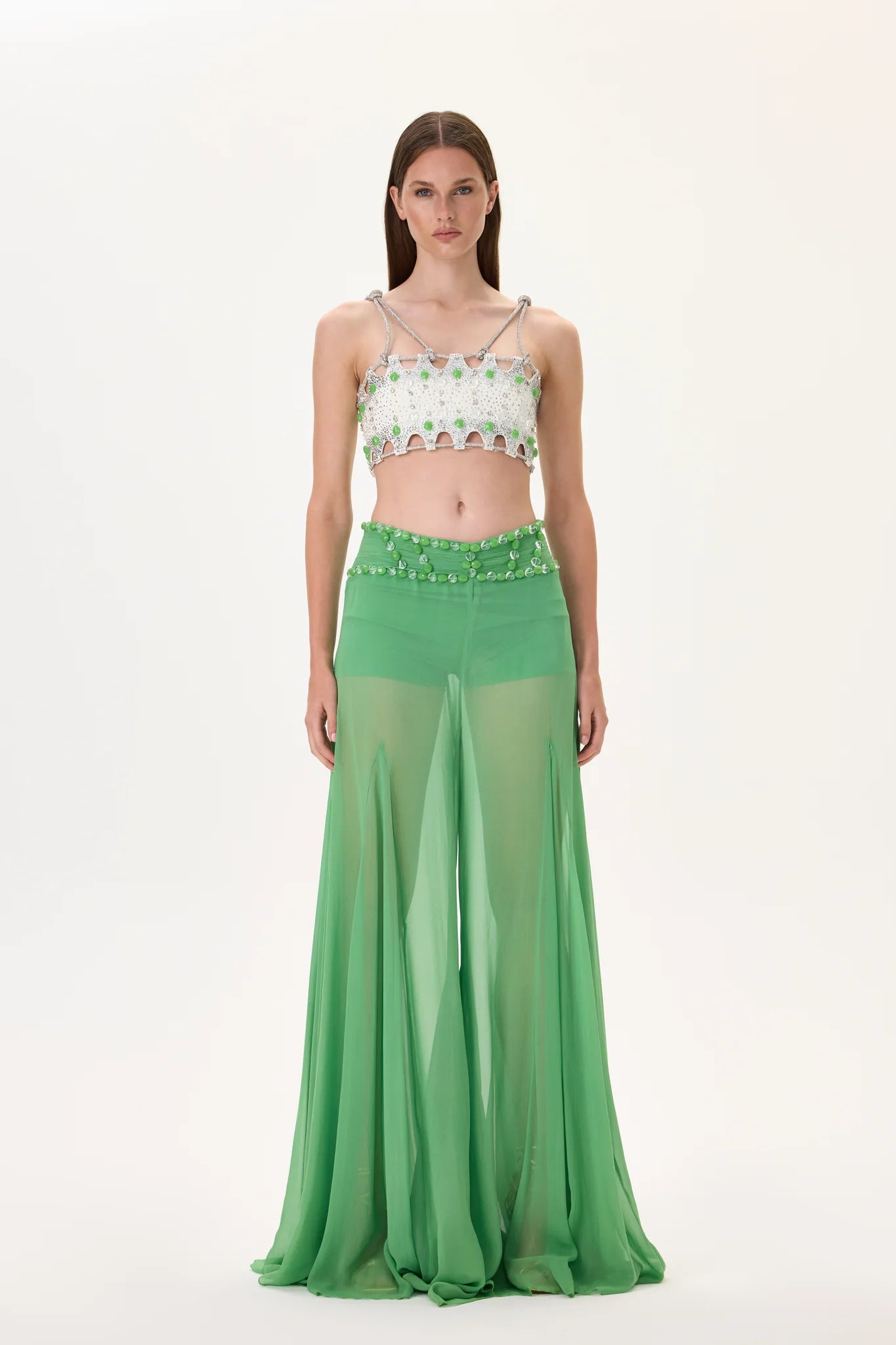 Green Wide Leg Chiffon Pants with Gold Buckled Belt