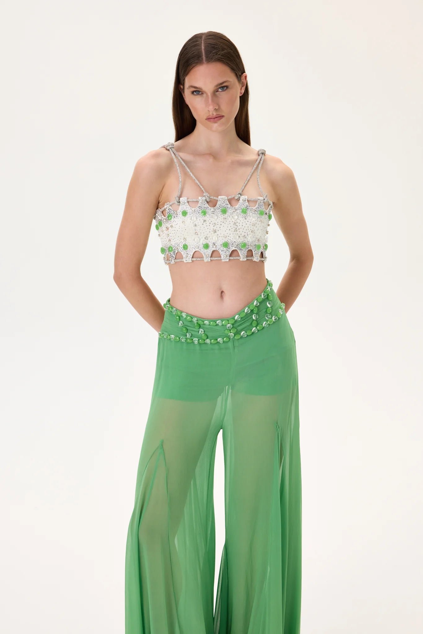Elegant wide-leg chiffon pants designed with a luxurious gold-buckled belt. The flowing silhouette offers both comfort and sophistication, perfect for evening looks or high-fashion ensembles.