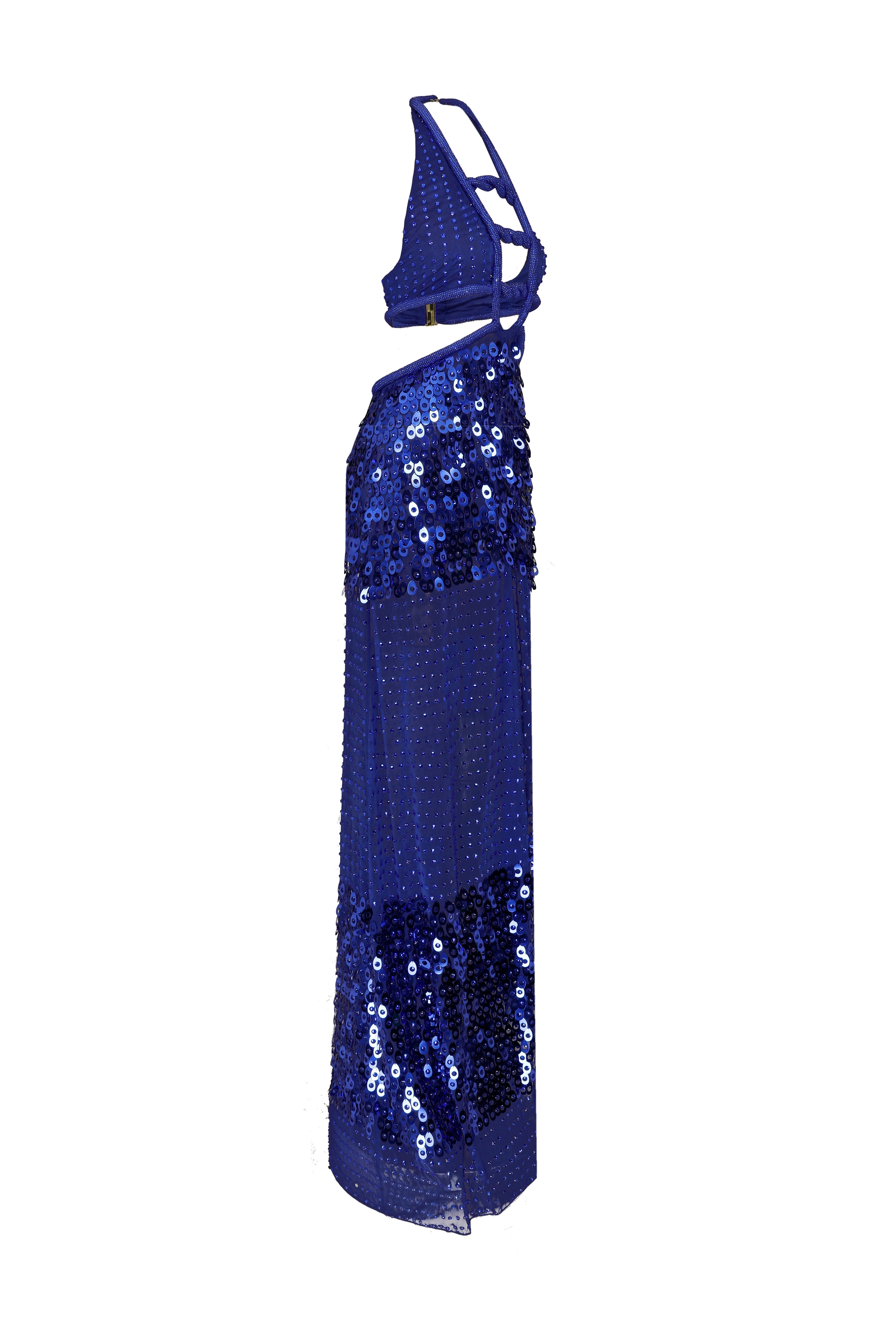 The sequined and tulle dress was combined with a string-like halter collar. The deep v-neck offers a striking look.