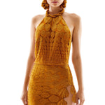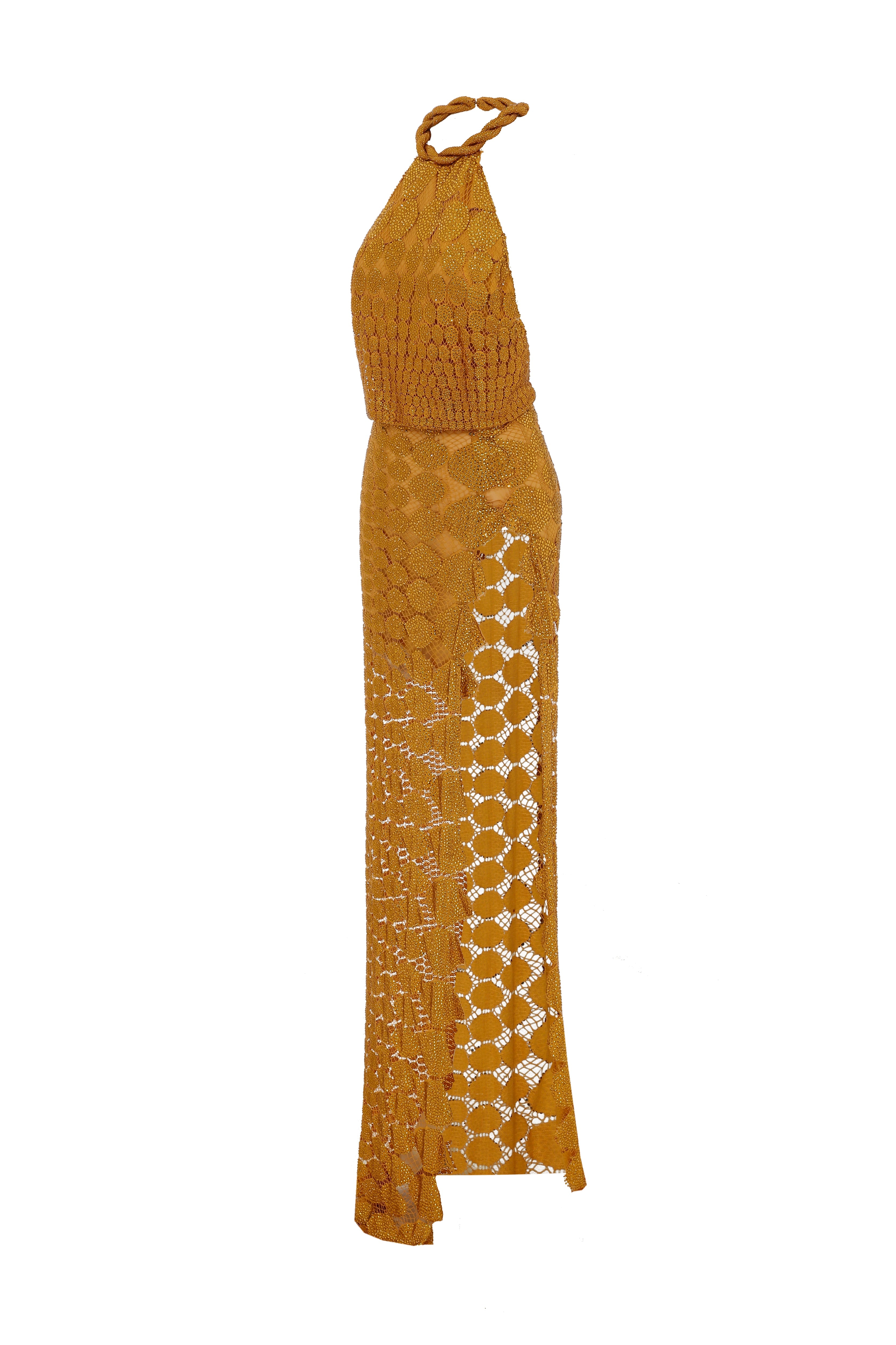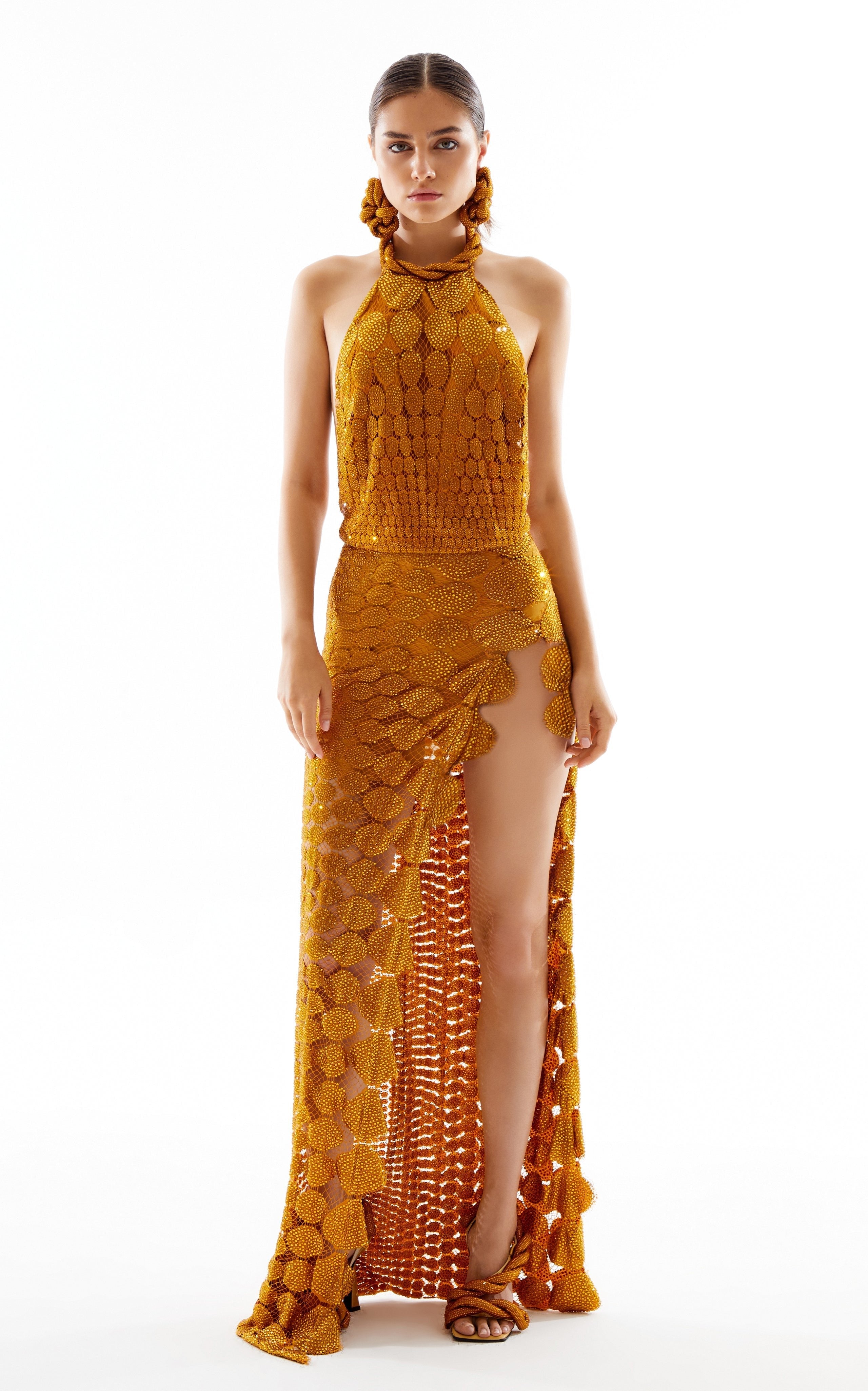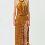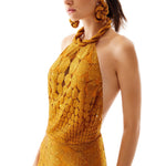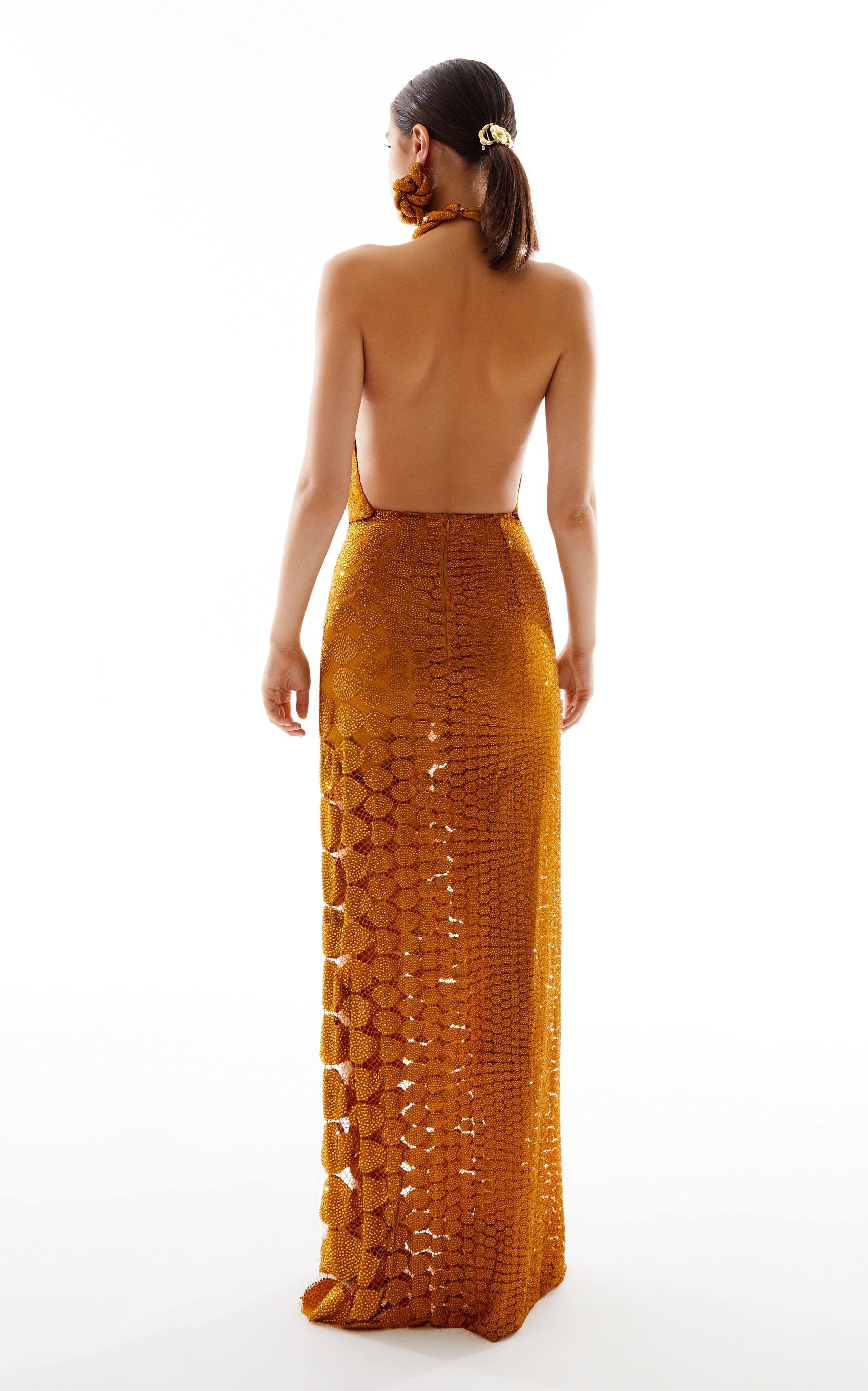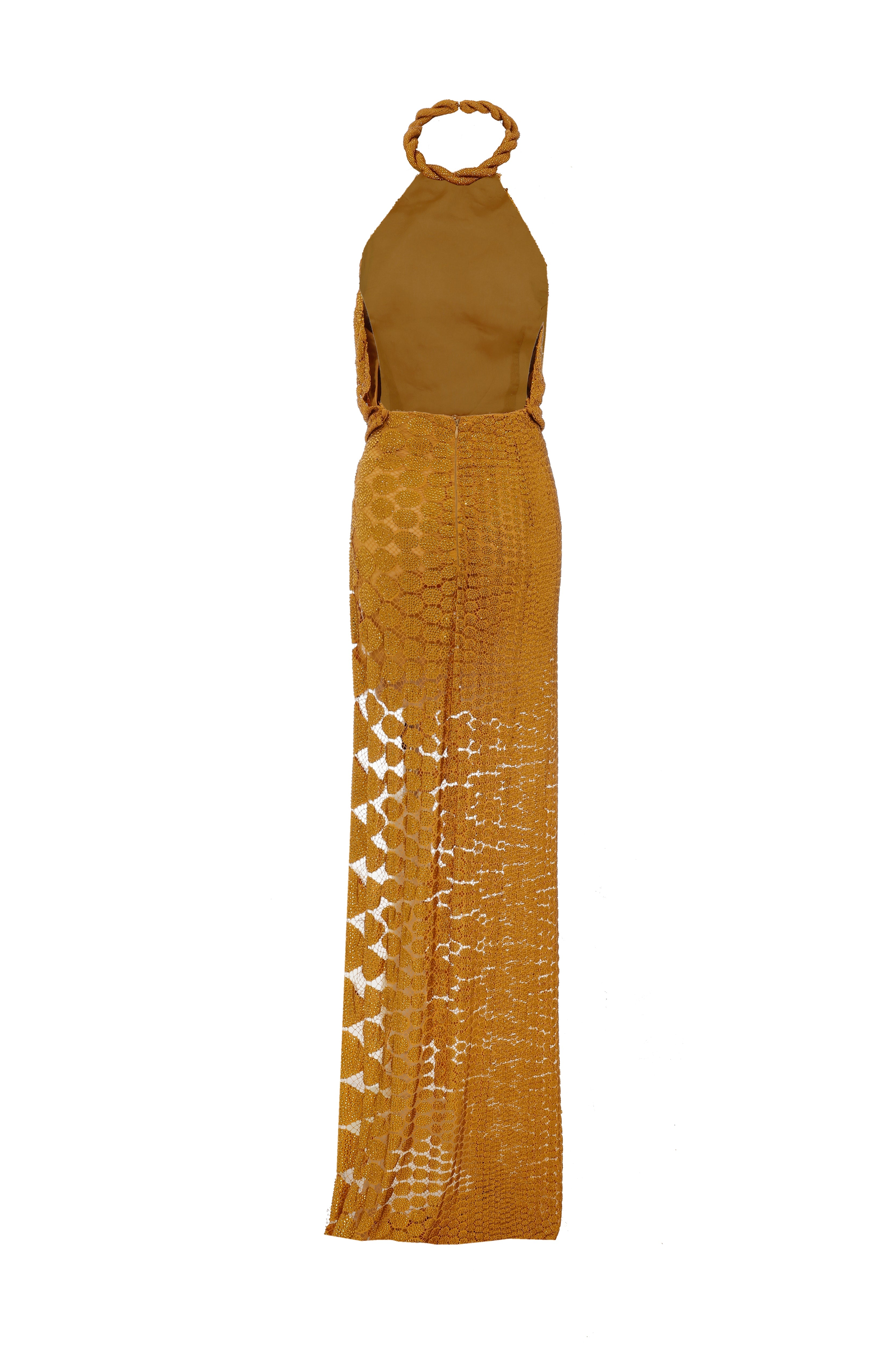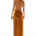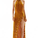 Halter Neck Sequined Circle Lace Maxi Dress with High Slit