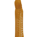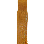 Ethnic-looking dress with a rope-string halter neckline that completely covers the neck, decorated with round embroidery.