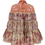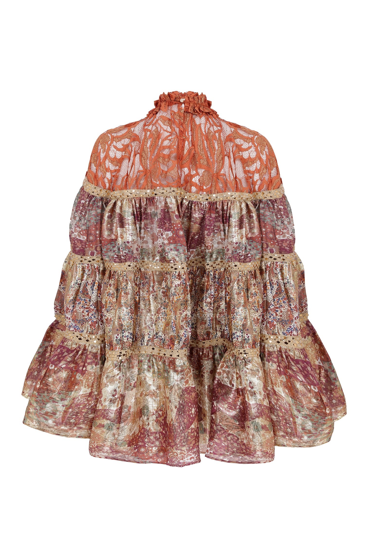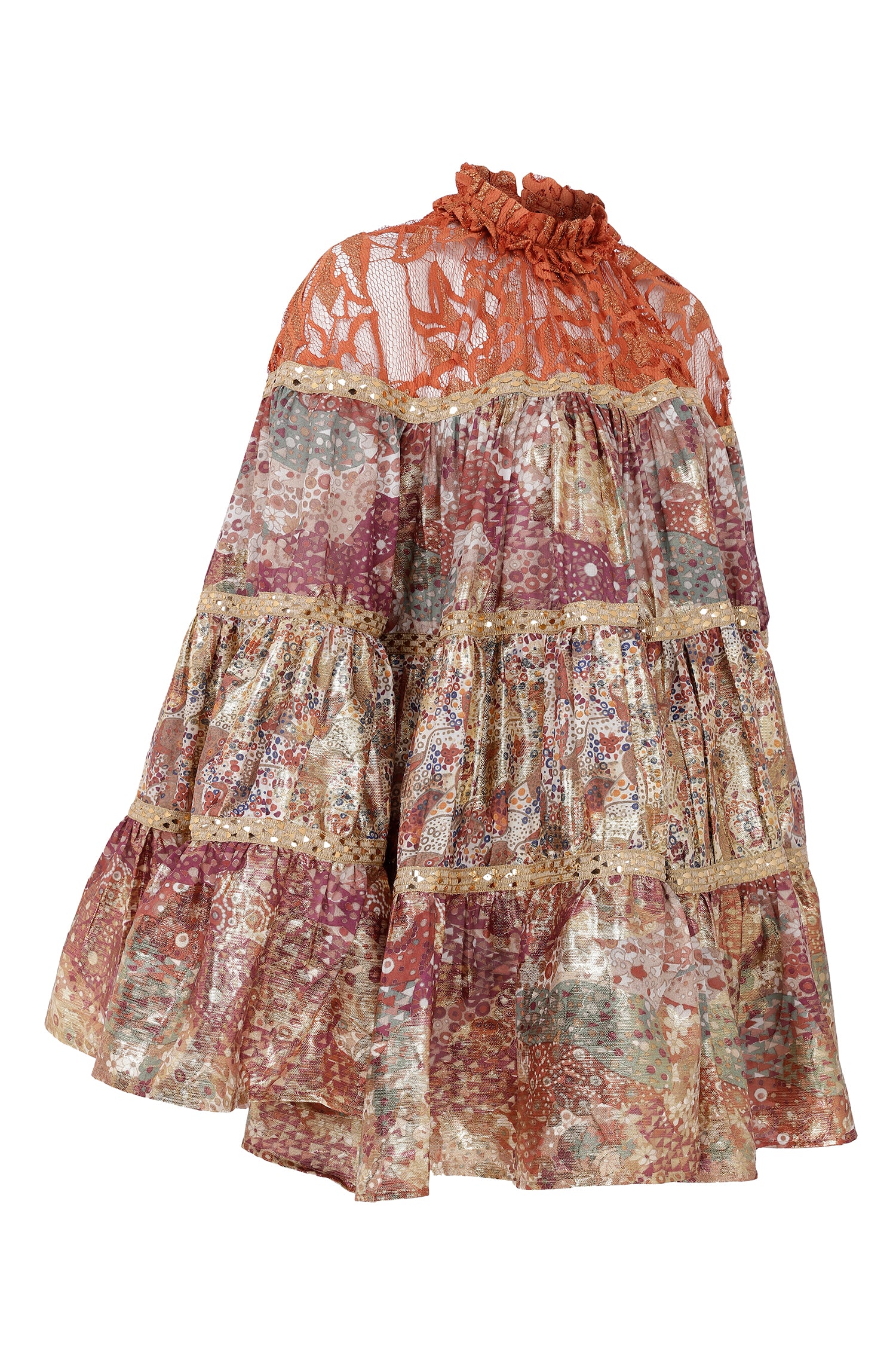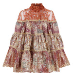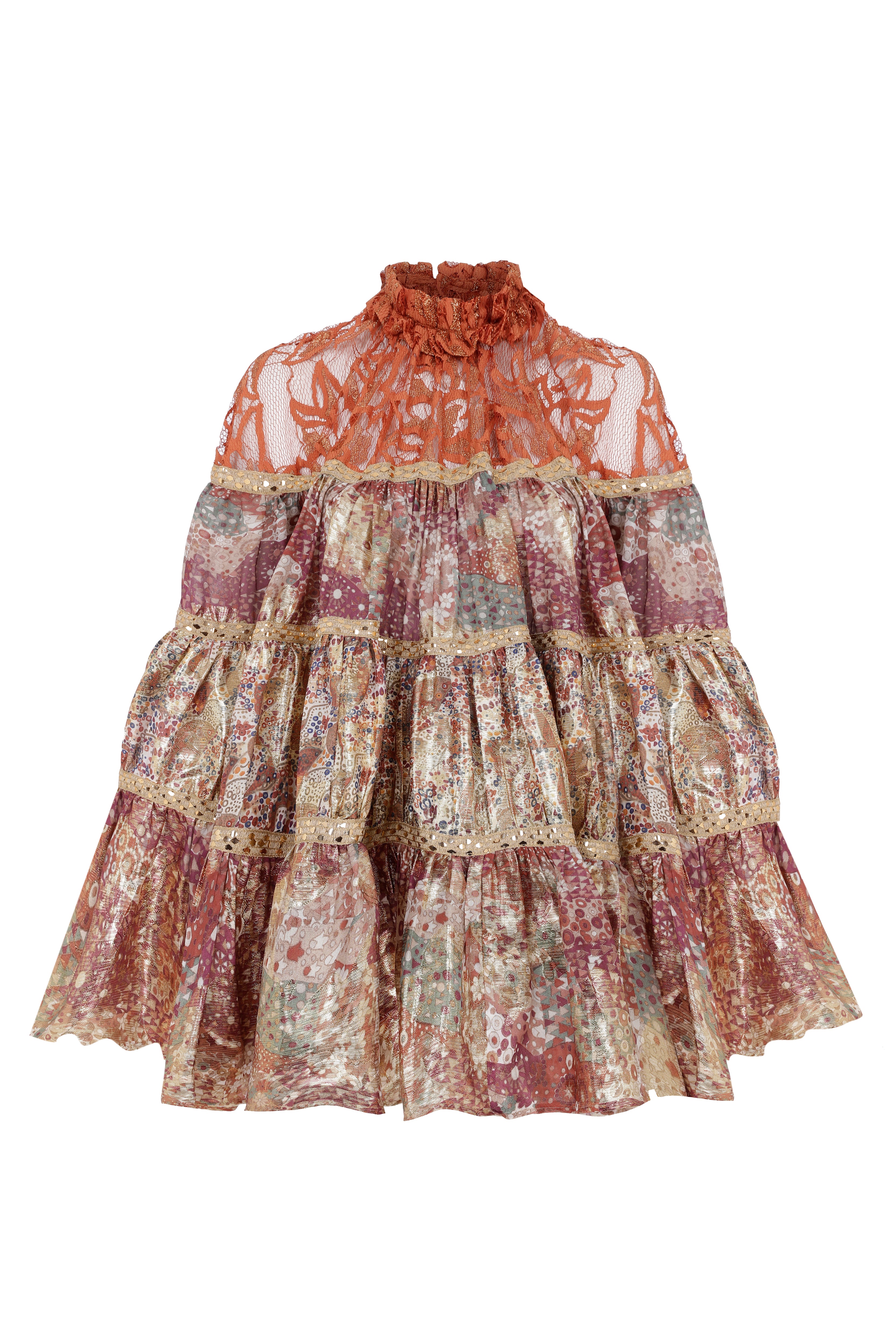 High Neck Ethnic Patterned Mini Shirt Dress with Lace