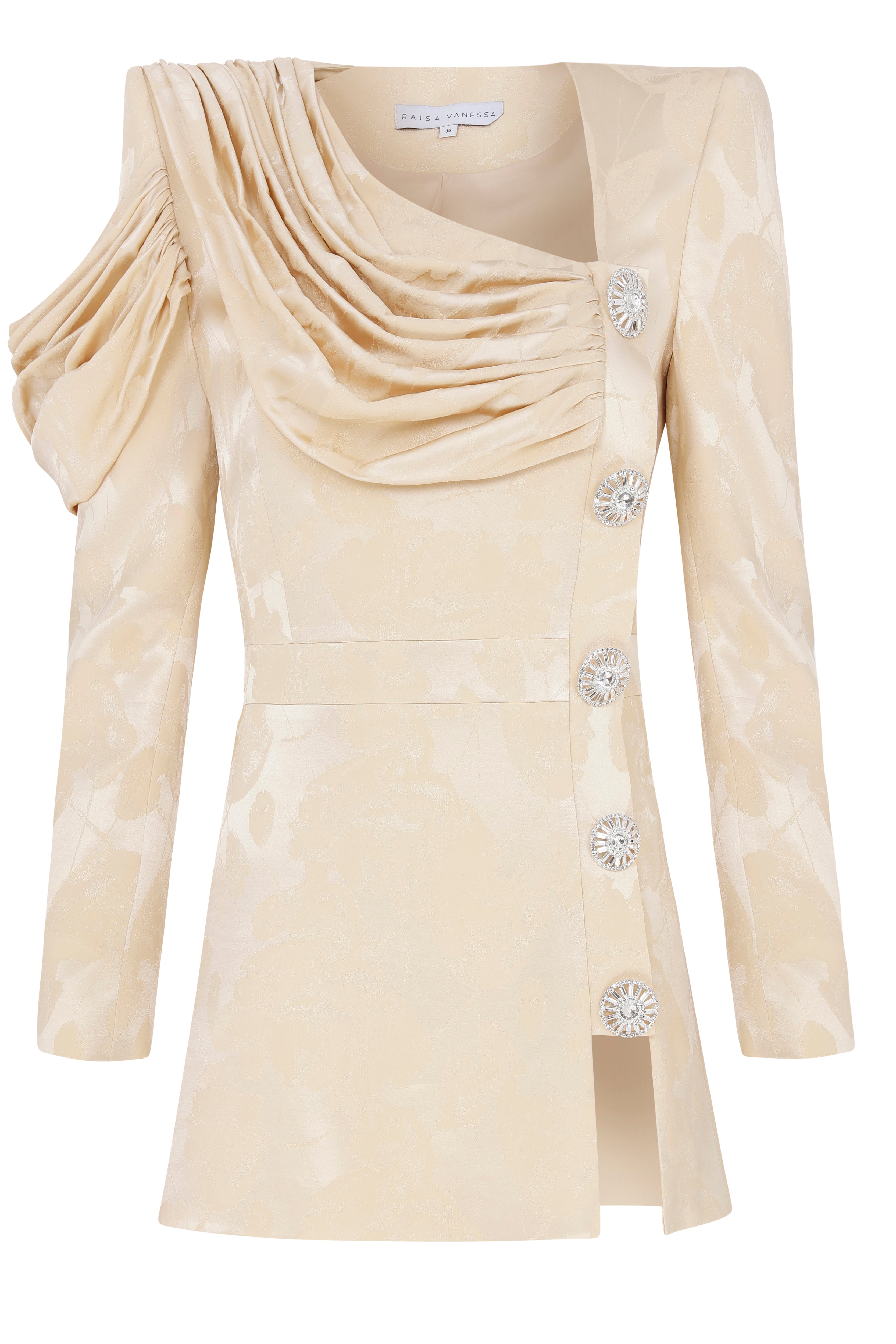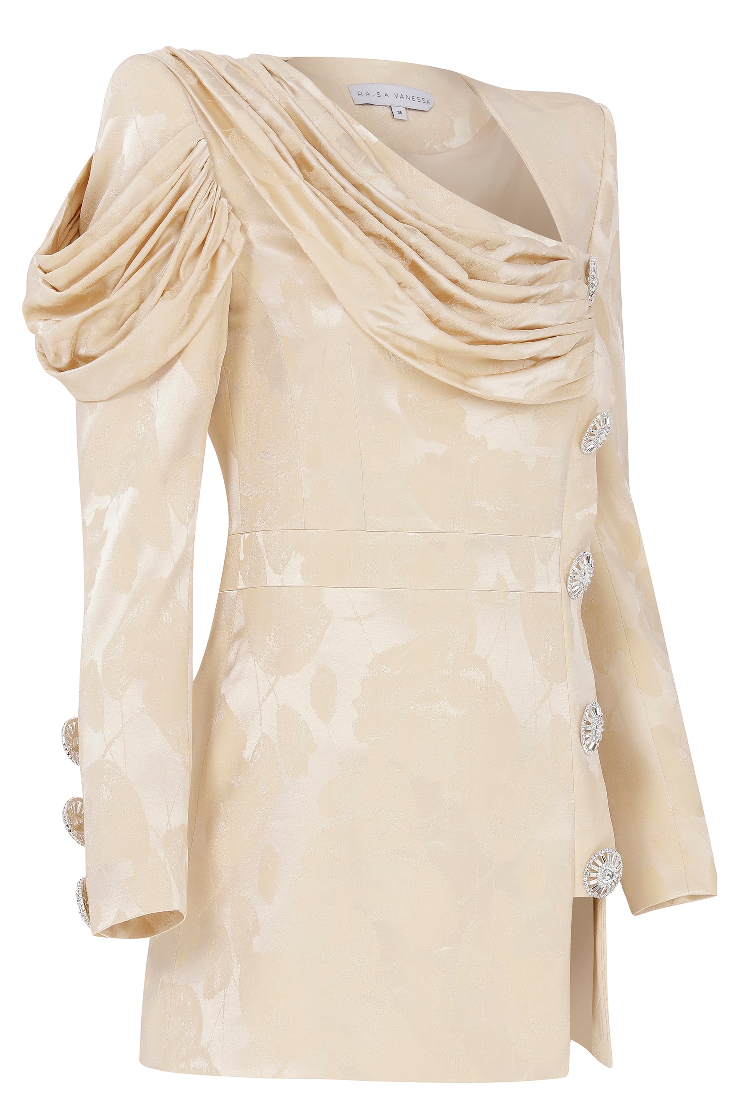 This dress, which has drapes on the side sleeves and neckline, is decorated with crystals.
