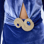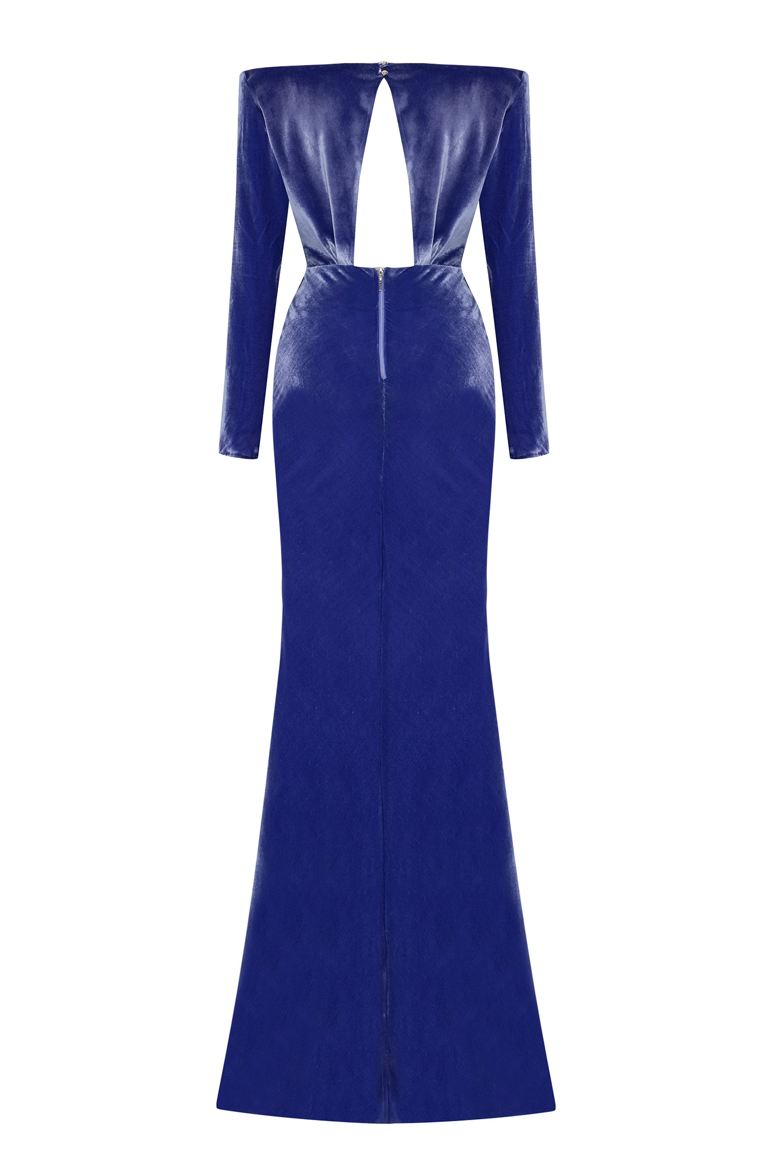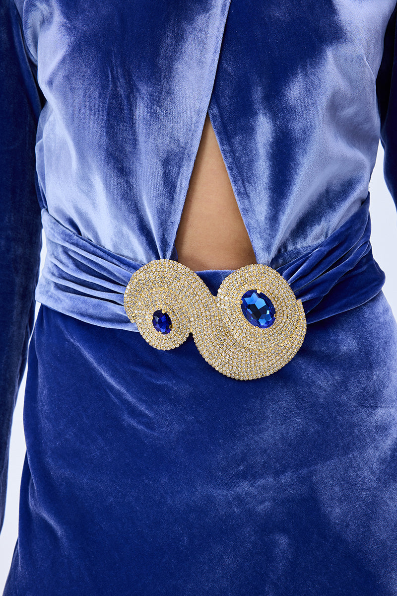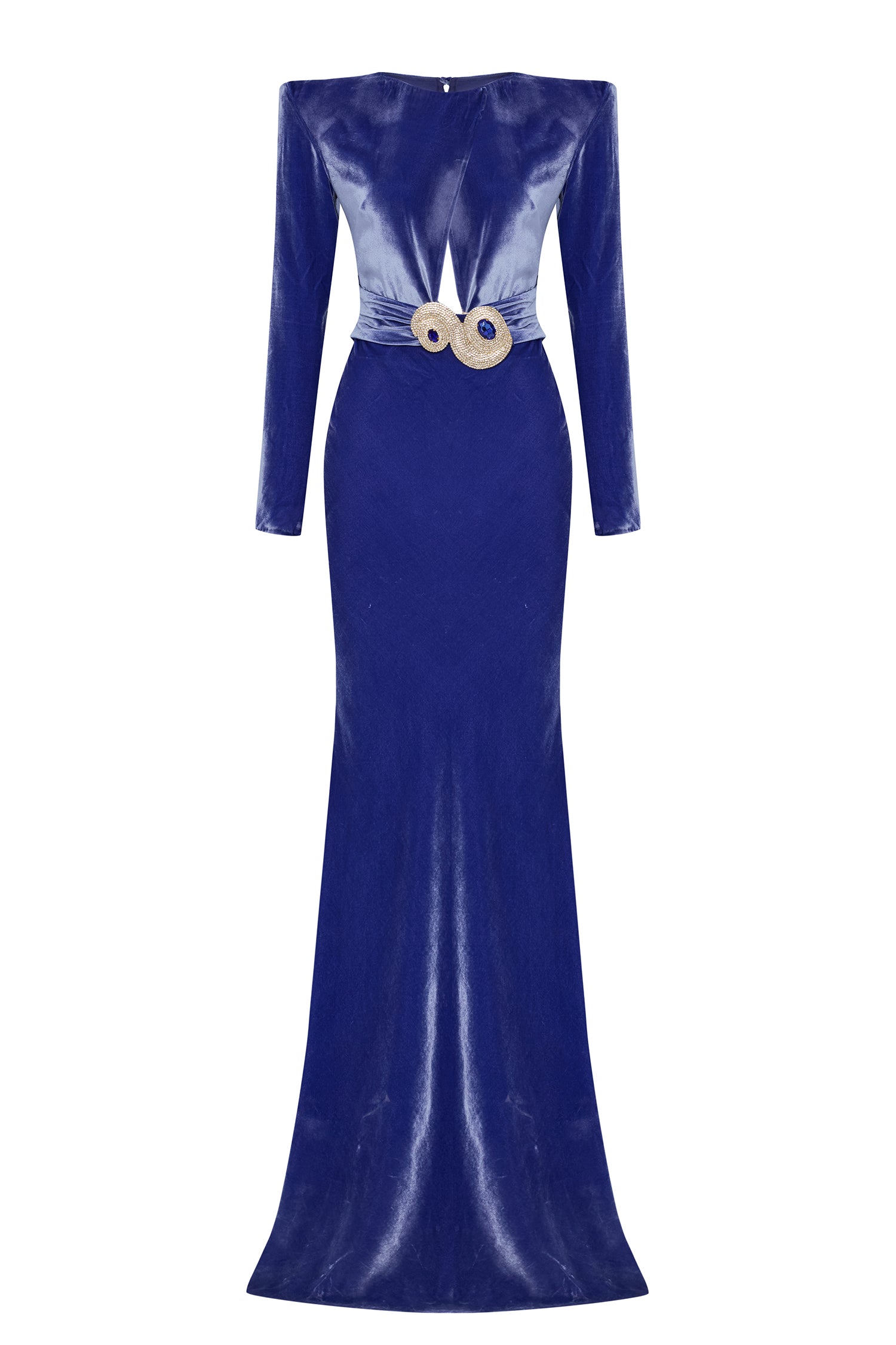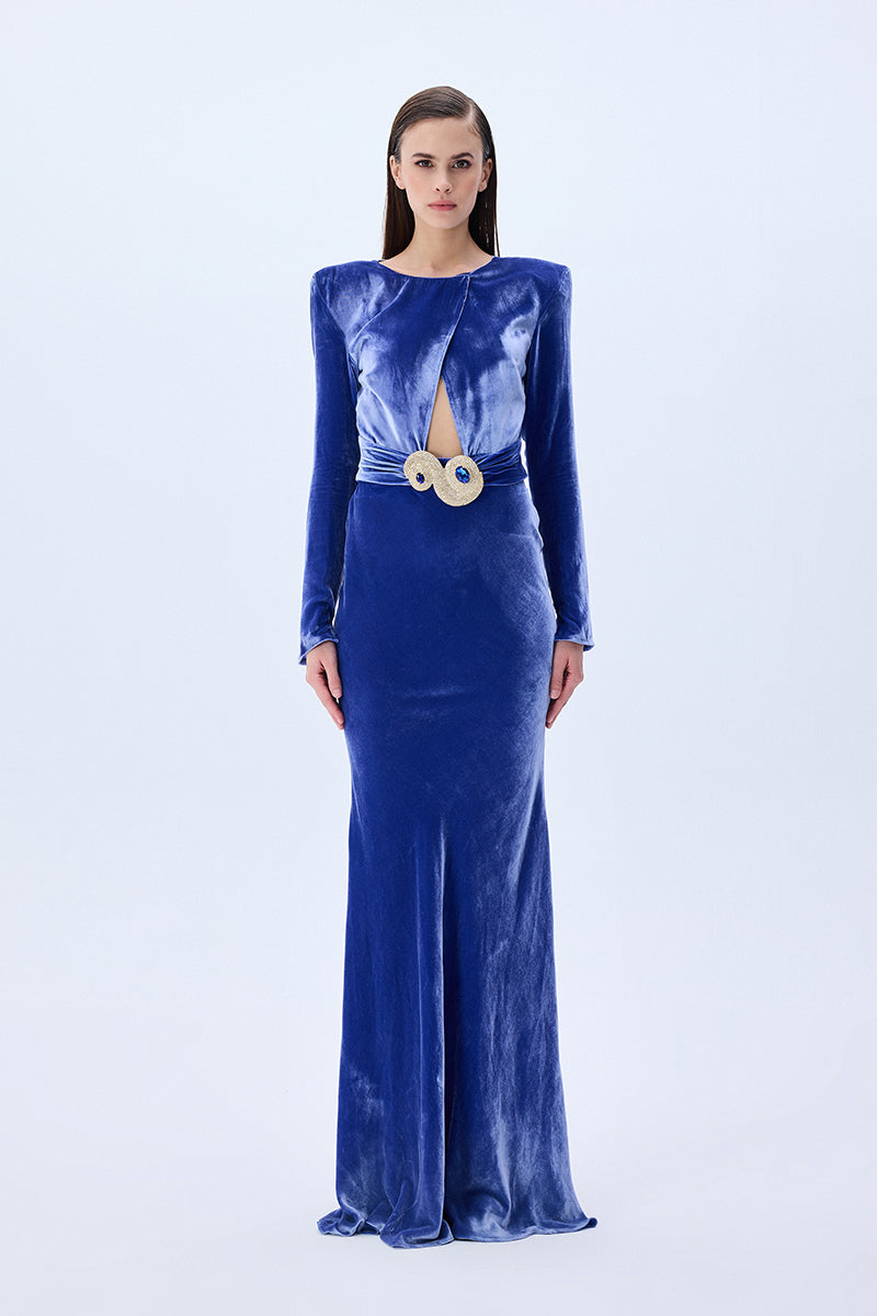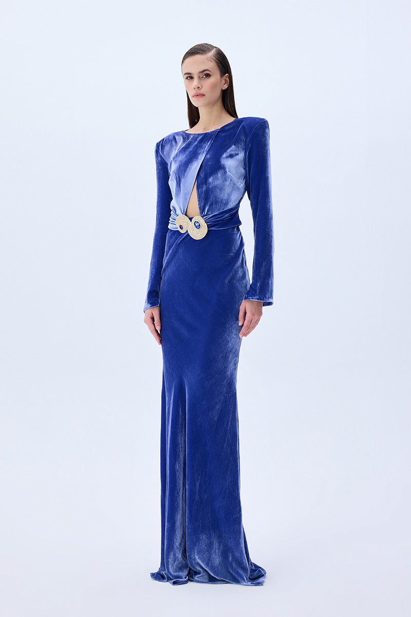 Indigo Velvet Maxi Dress With Cutout Detail And Cyrstal Belt