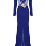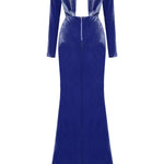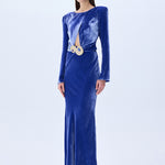 Indigo velvet maxi dress showcases a sculpted silhouette with structured shoulders and a daring front cutout that highlights the waist. The floor-grazing hemline elongates the figure, while the crystal-embellished belt adds a luxurious finish with subtle sparkle.