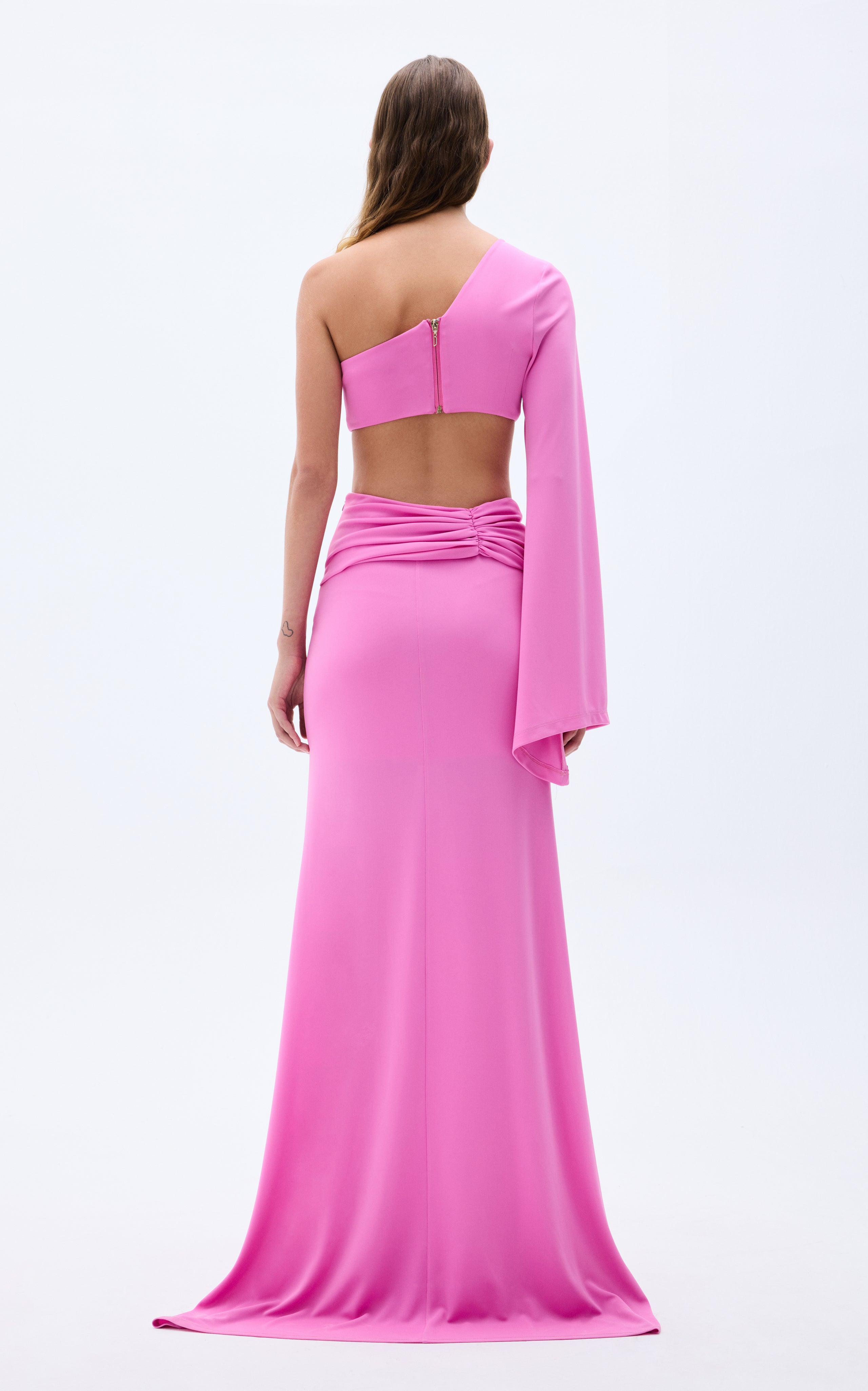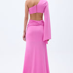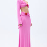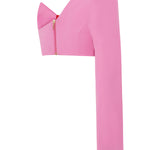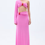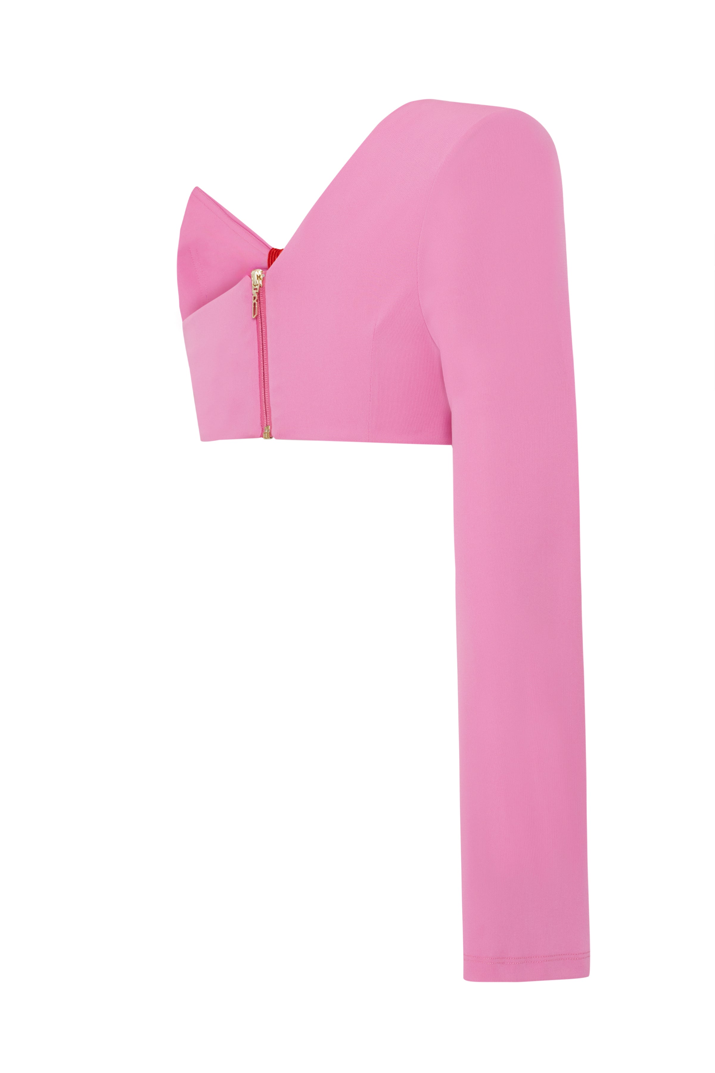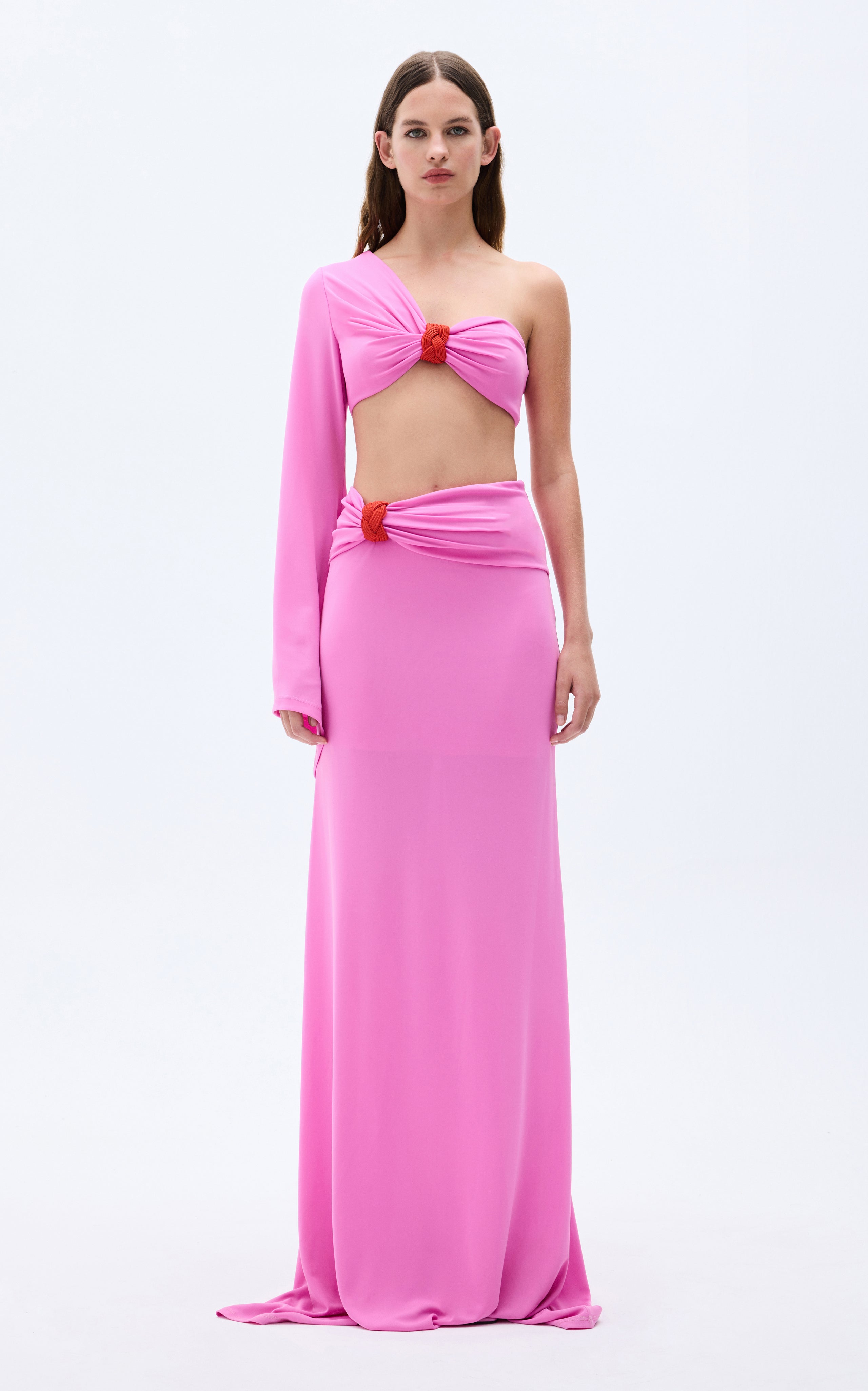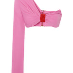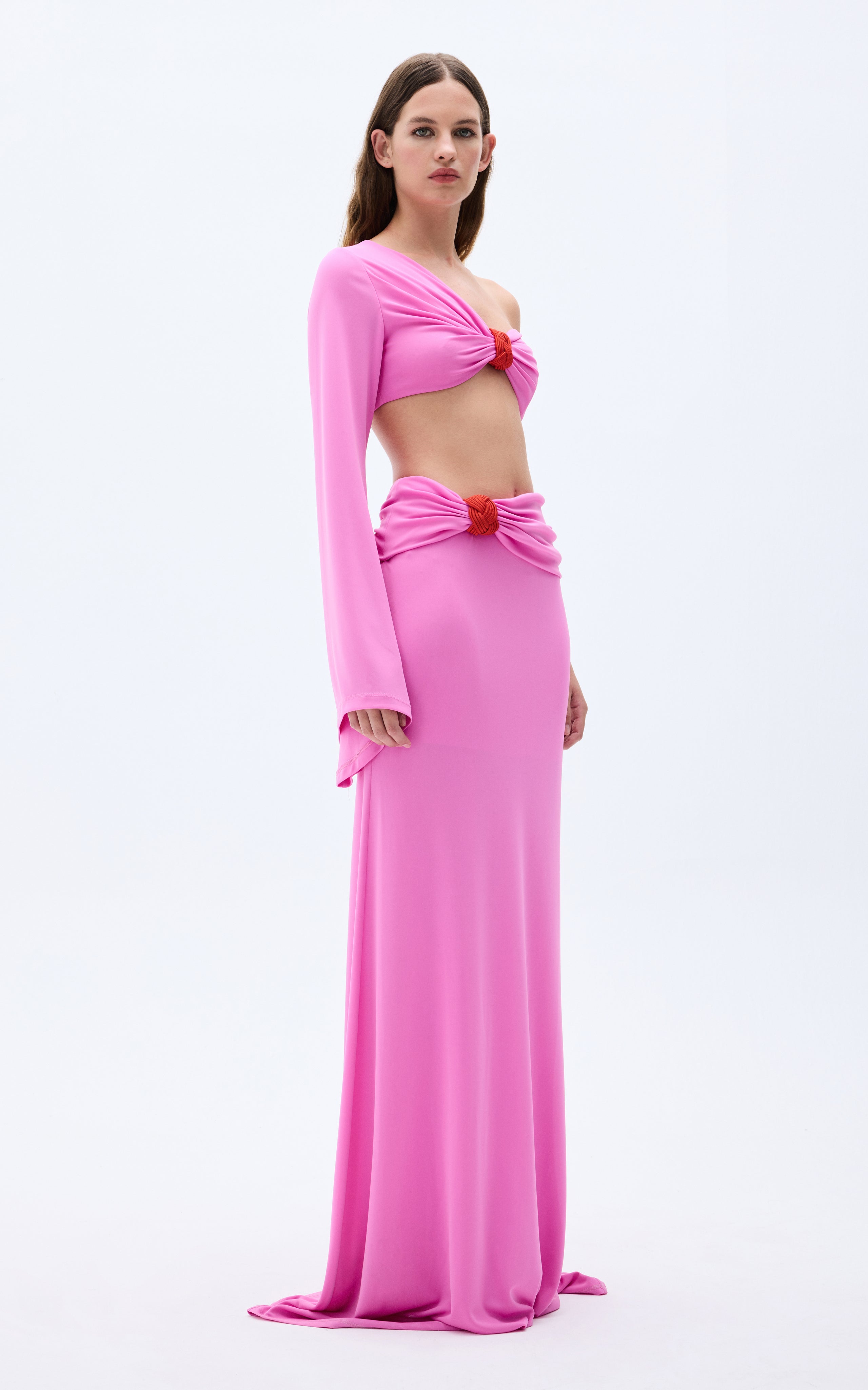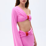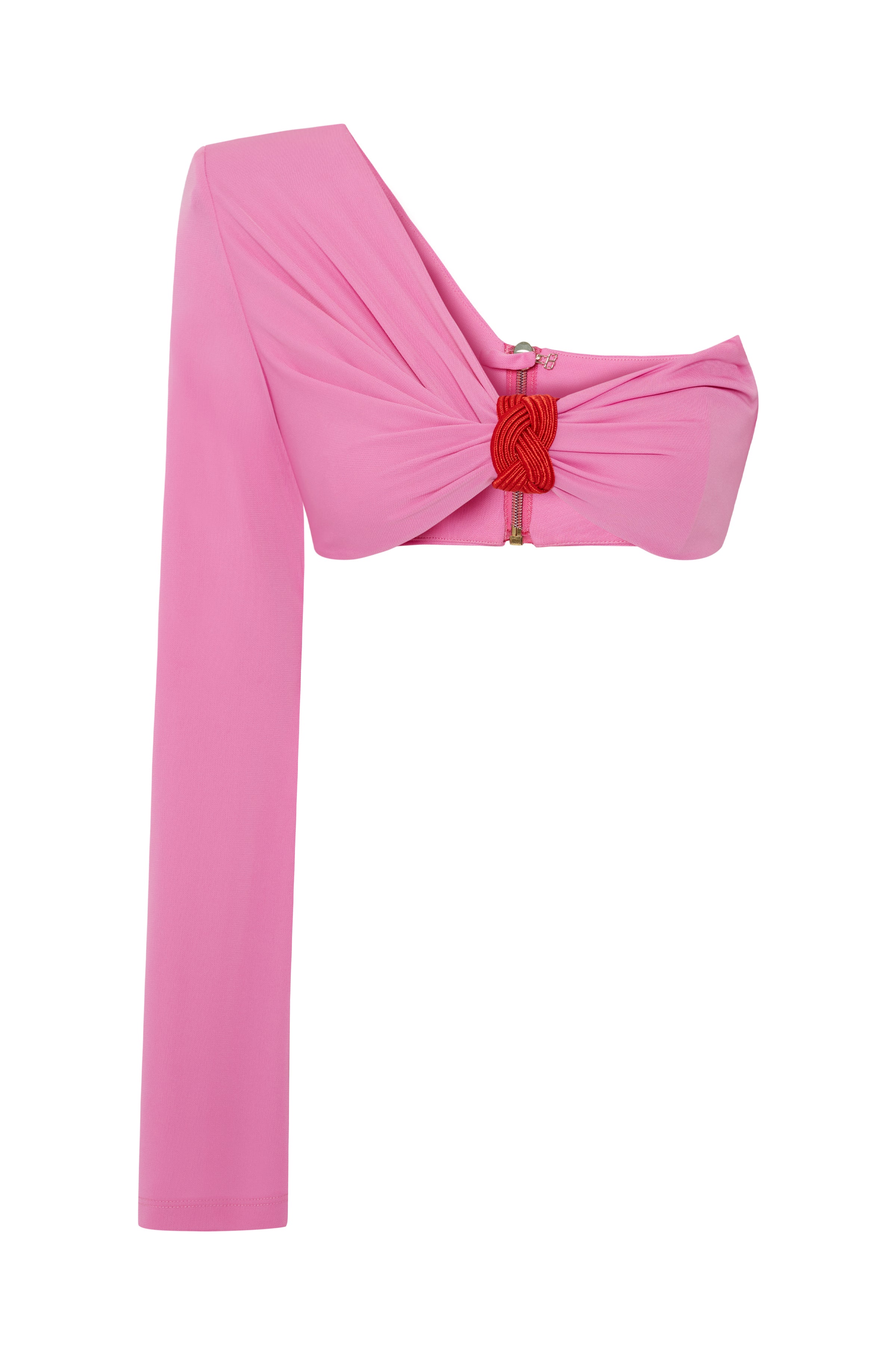 This ink-colored one-shouldered crop top exudes modern elegance with a bold red rope detail. The asymmetrical design offers a sleek, edgy look, perfect for pairing with its matching skirt for a striking, fashion-forward outfit.