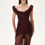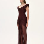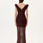 Exquisite knitted burgundy gown featuring a cowl neckline, corseted bodice, train, and elegant front slit. This design combines sensual elegance with a regal silhouette, ideal for red carpet and evening occasions.