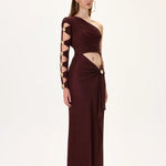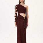 Knitted Burgundy One Sleeved Draped Midi Dress With Side Slit And Gold Accessories