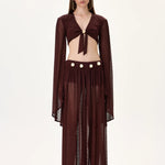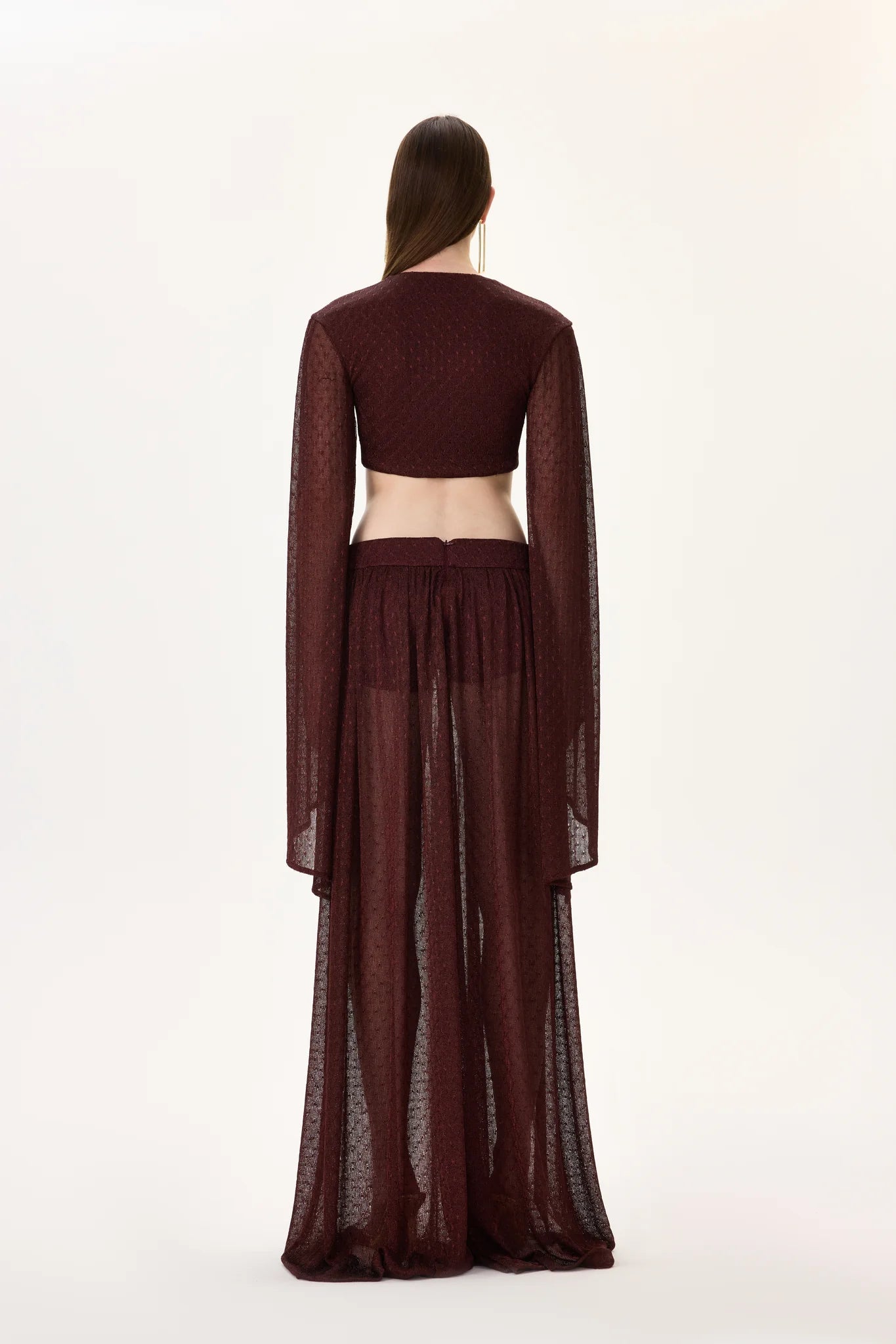 Sophisticated knitted burgundy wide leg pants adorned with gold accessories. Designed to provide both comfort and elegance, creating a luxurious silhouette perfect for elevated resort and evening looks.