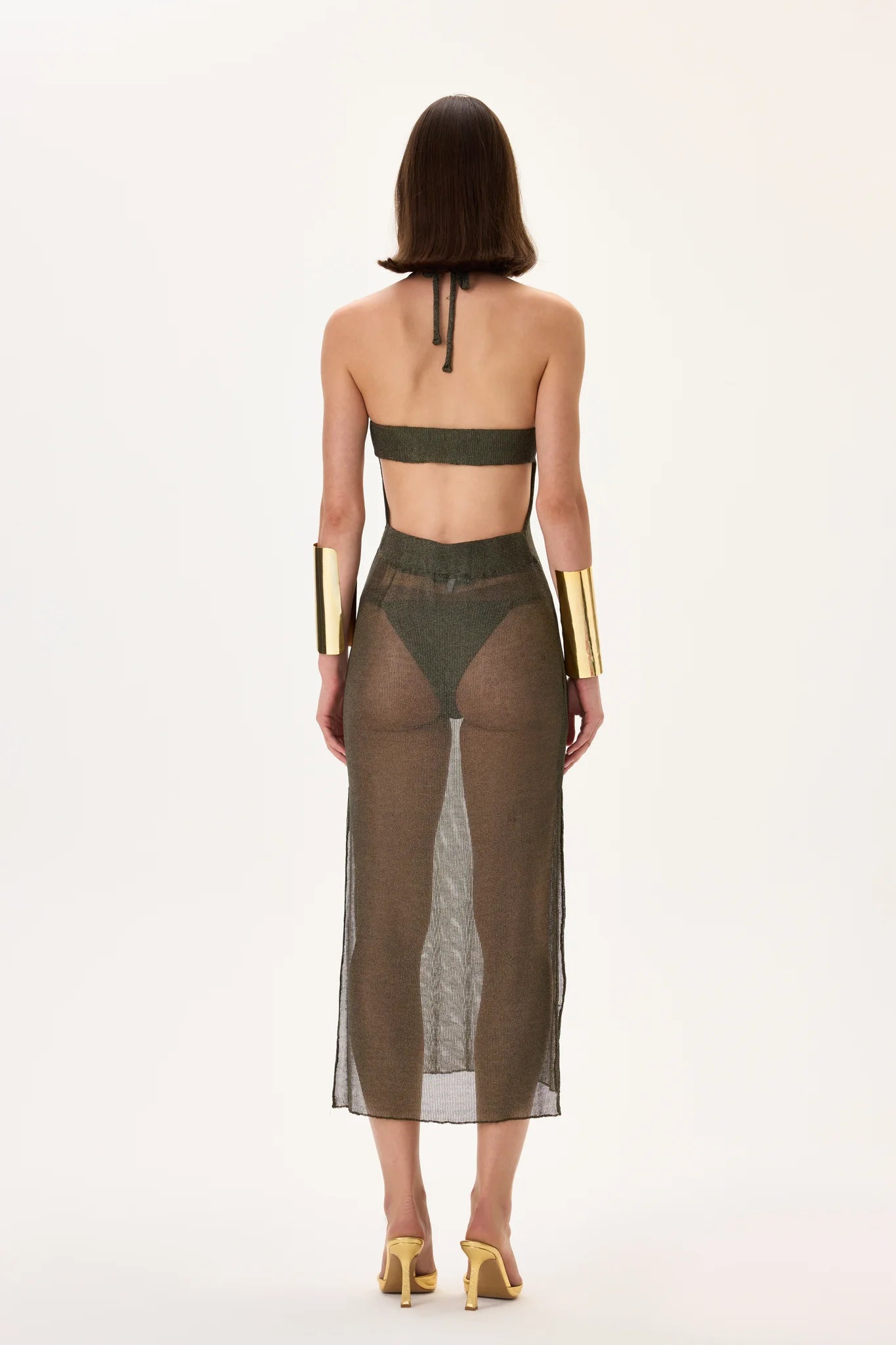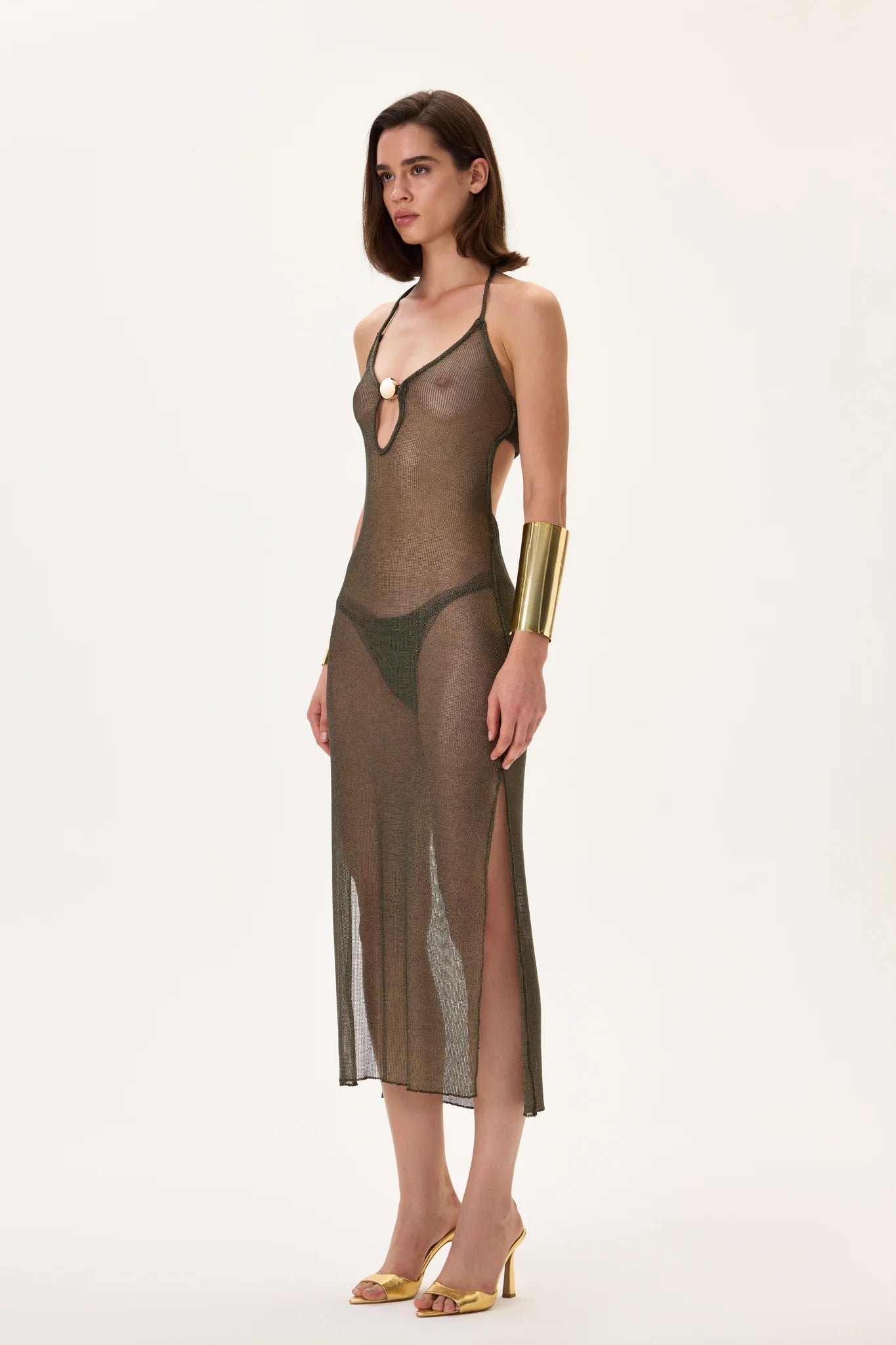 Modern knitted khaki see-through dress offering a bold yet elegant silhouette. Crafted with delicate transparency for a contemporary aesthetic, perfect for layered styling or evening resort looks.