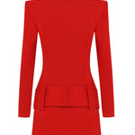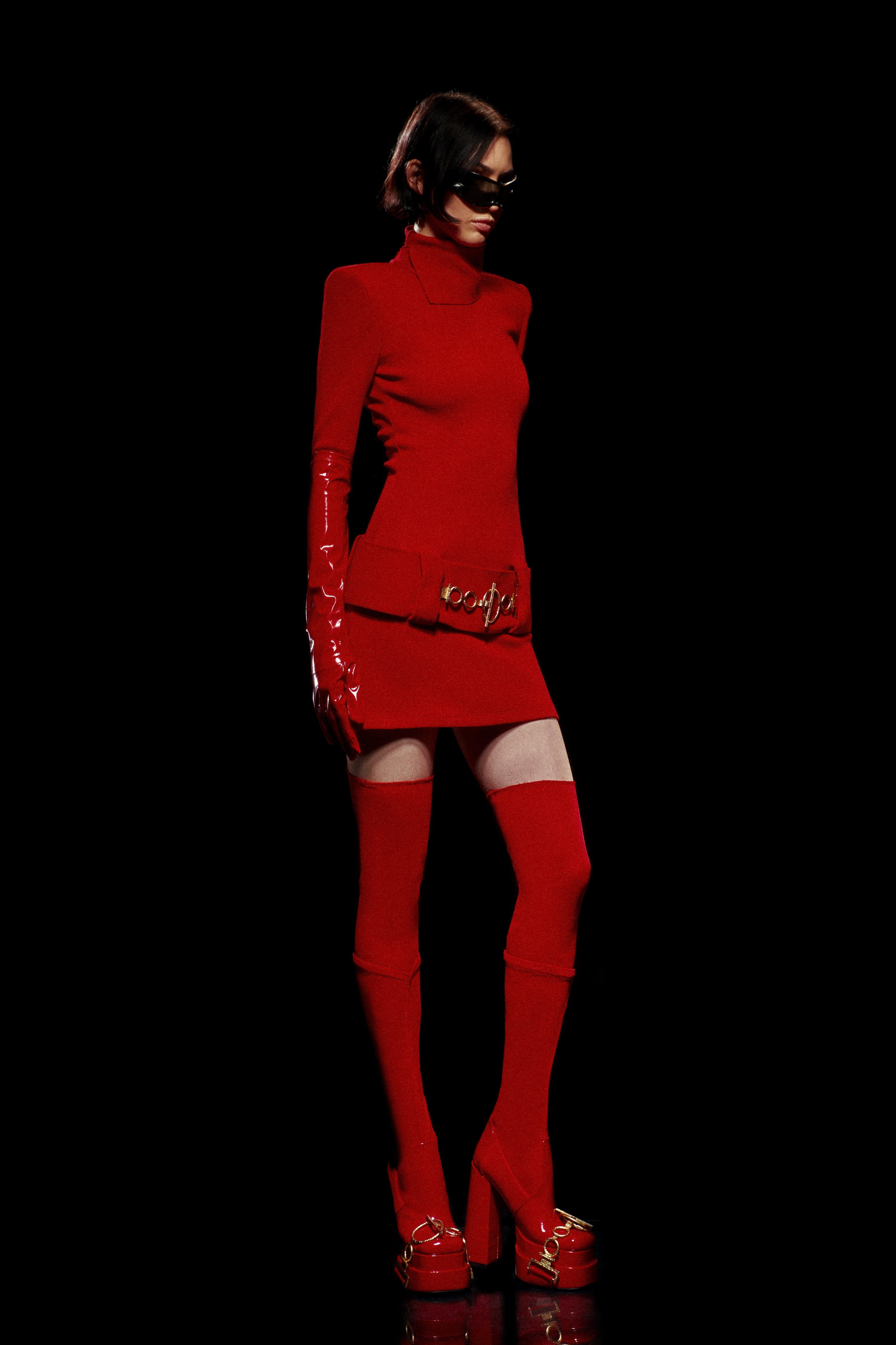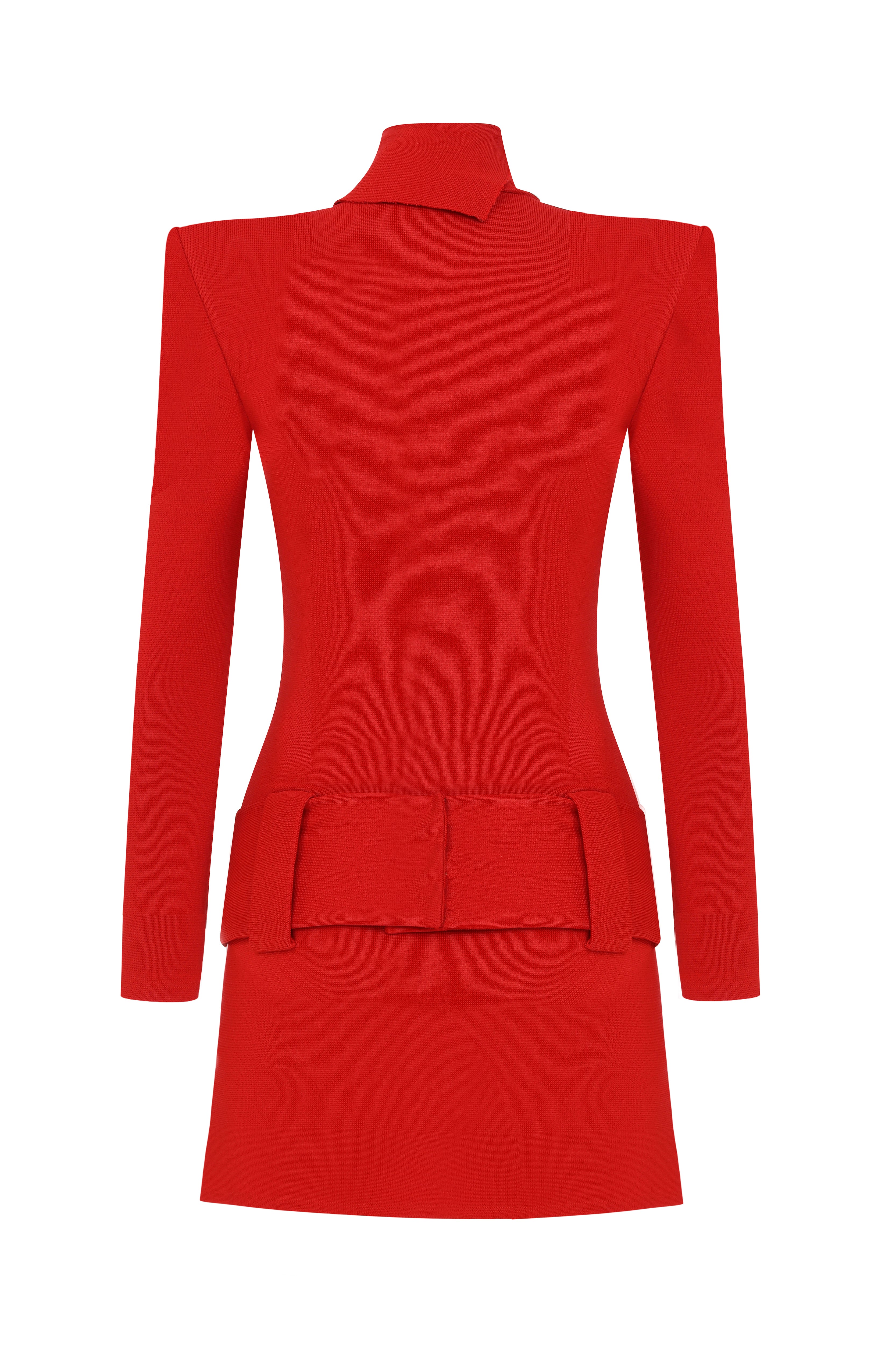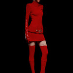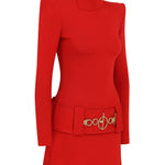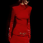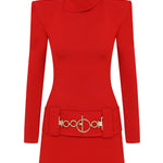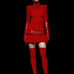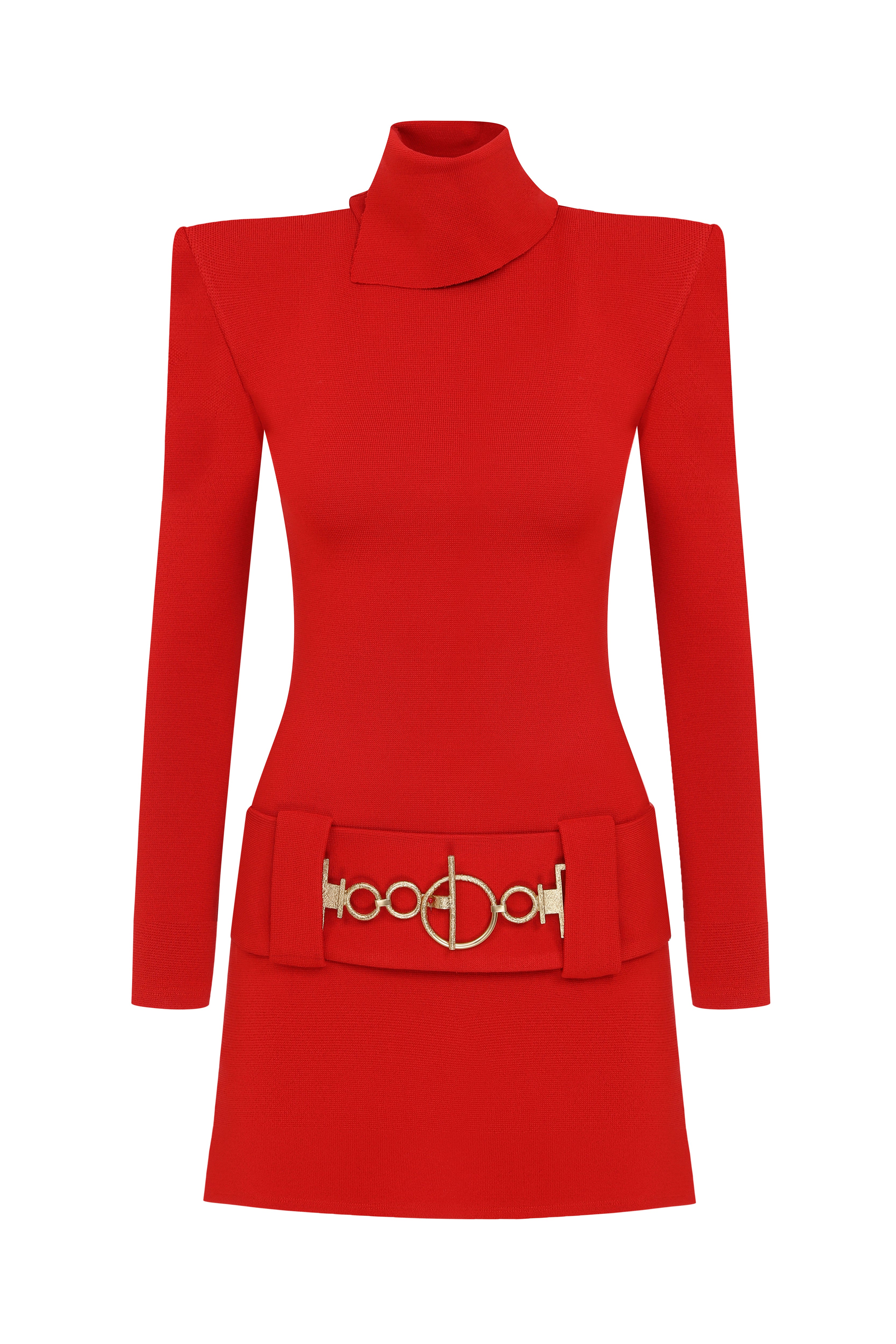 Knitted Red Mini Dress with High Neck And Gold Belt Detail
