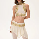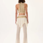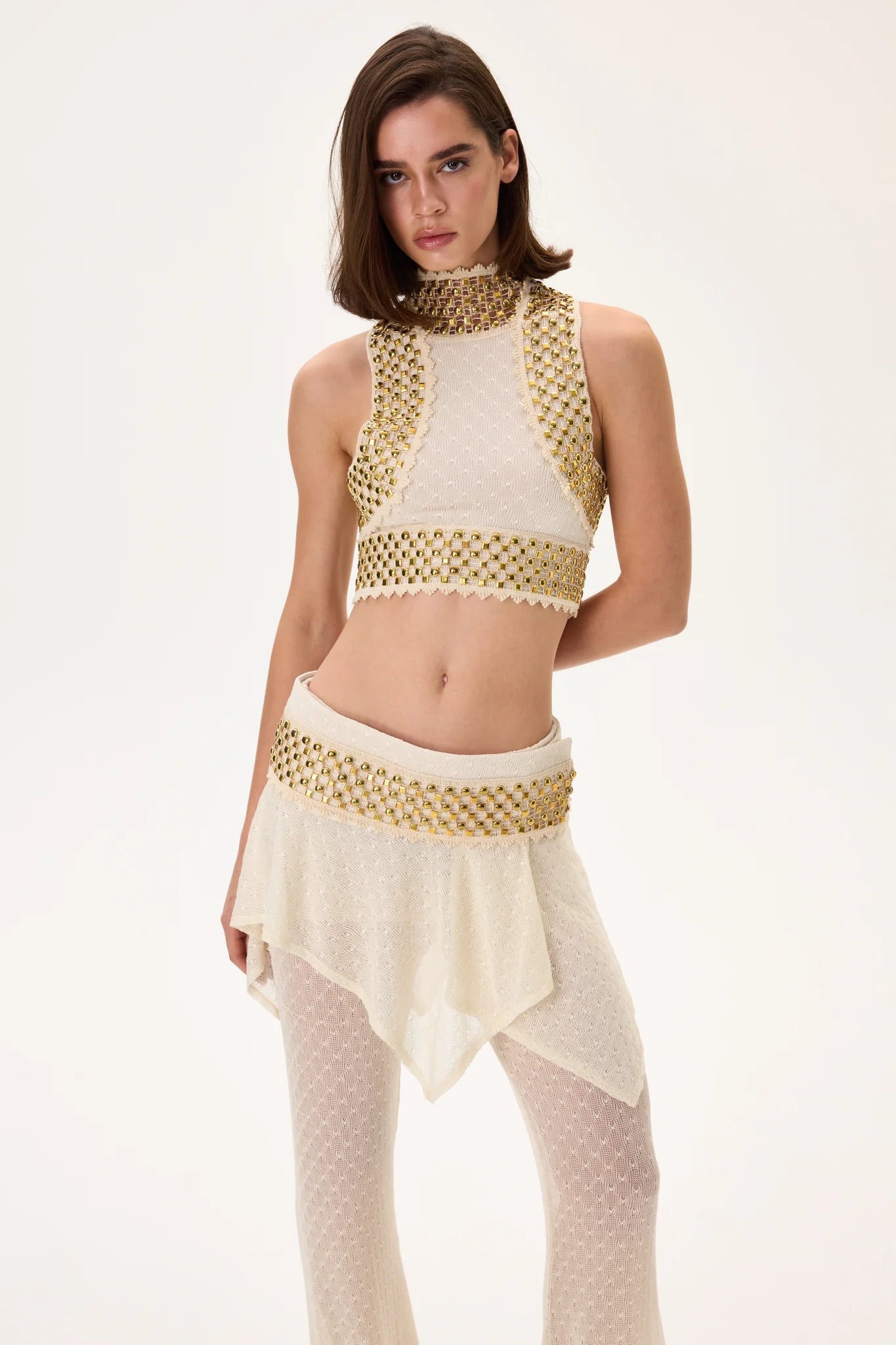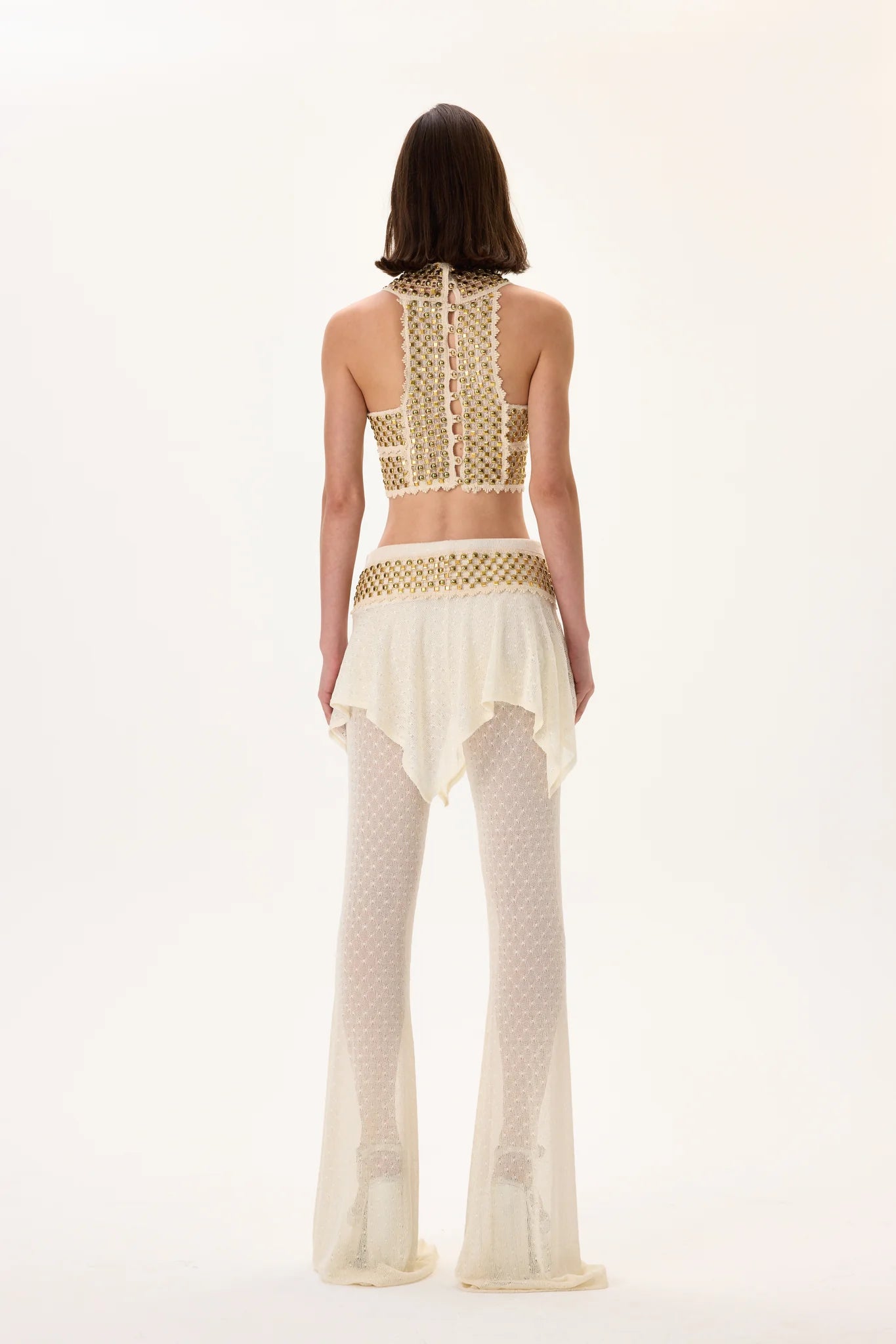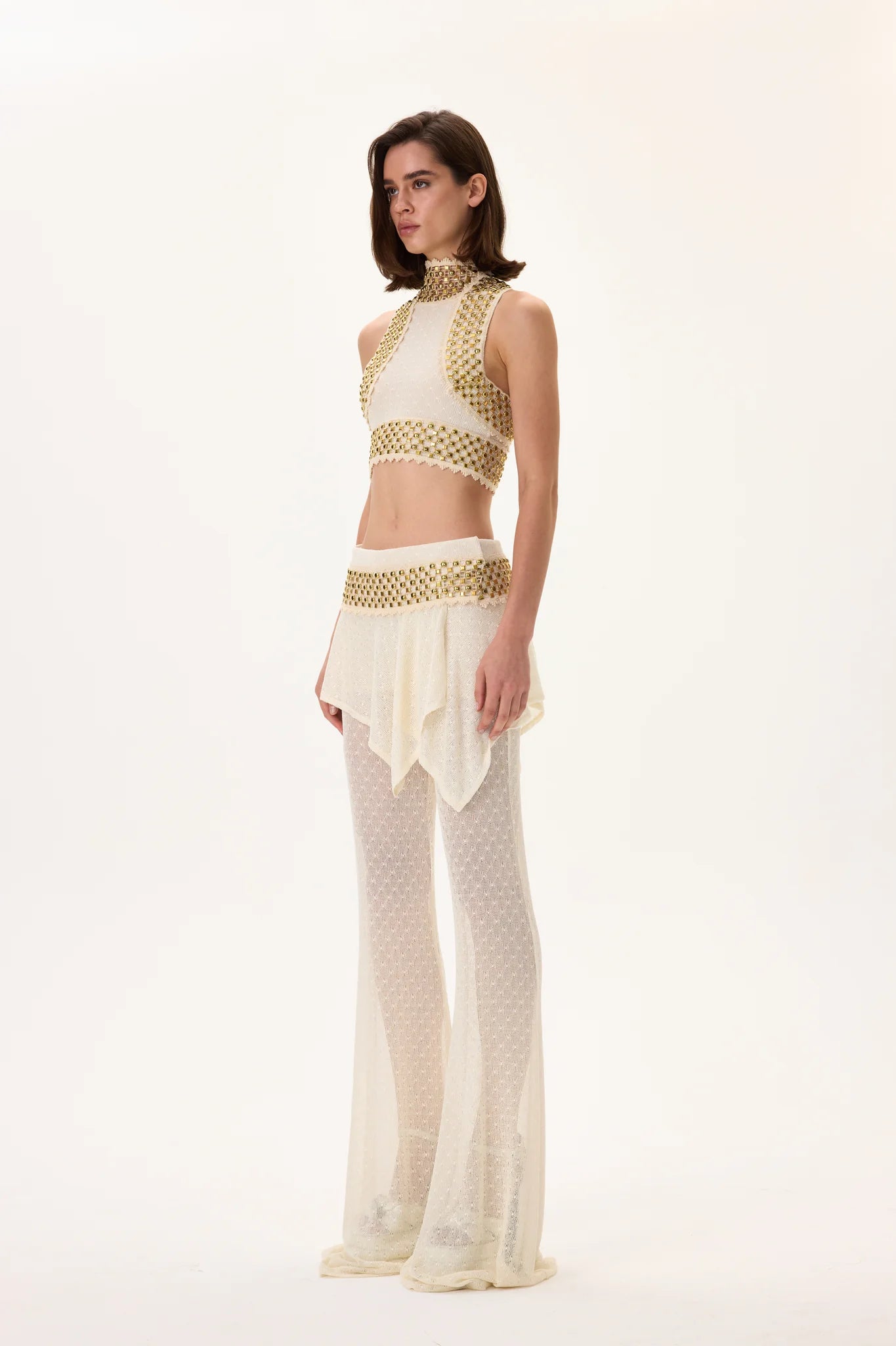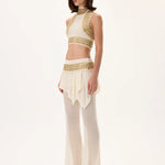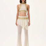 Luxurious knitted flare pants with a skirt-overlay design, complemented by a gold metal belt. Combines comfort, elegance, and a touch of modern glamour—perfect for sophisticated evening ensembles.