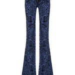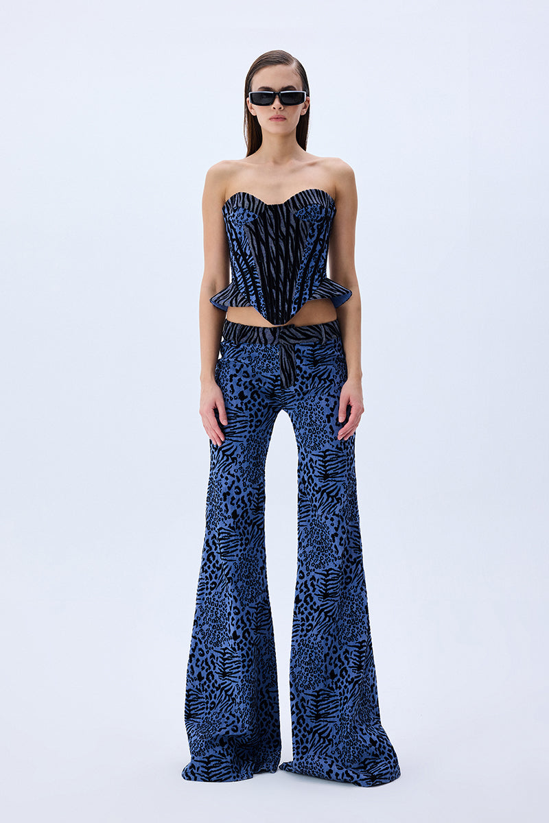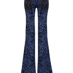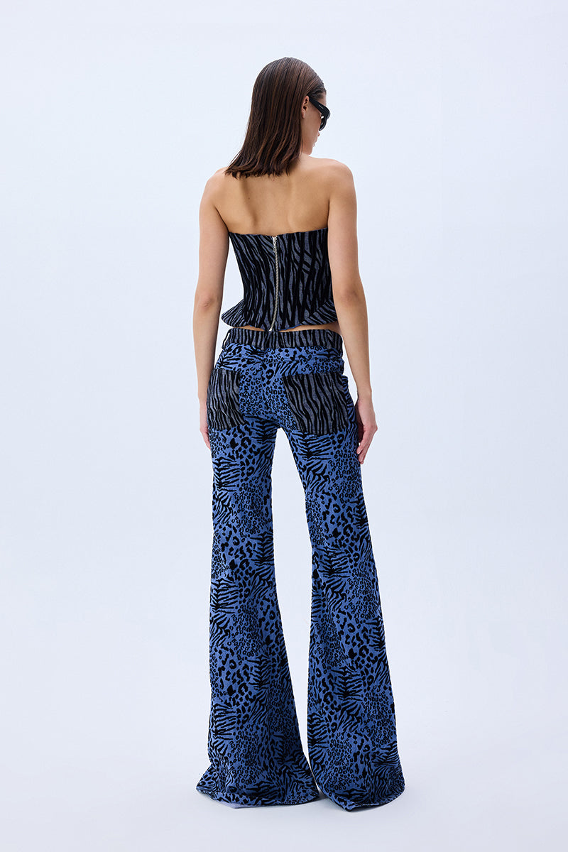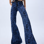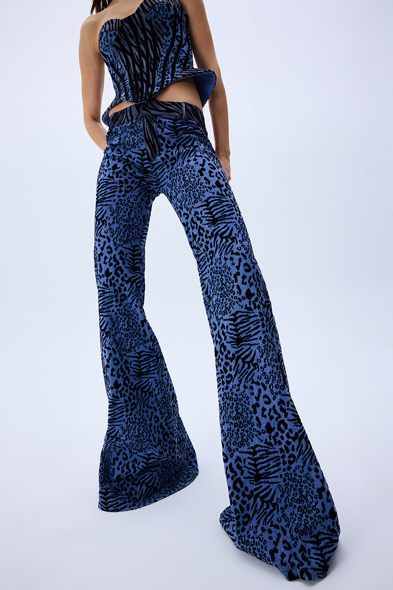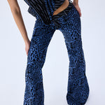These flared denim pants are printed with a bold velvet leopard motif, blending texture and attitude in one striking silhouette. Designed to elongate the legs while making a fearless fashion statement.