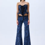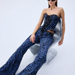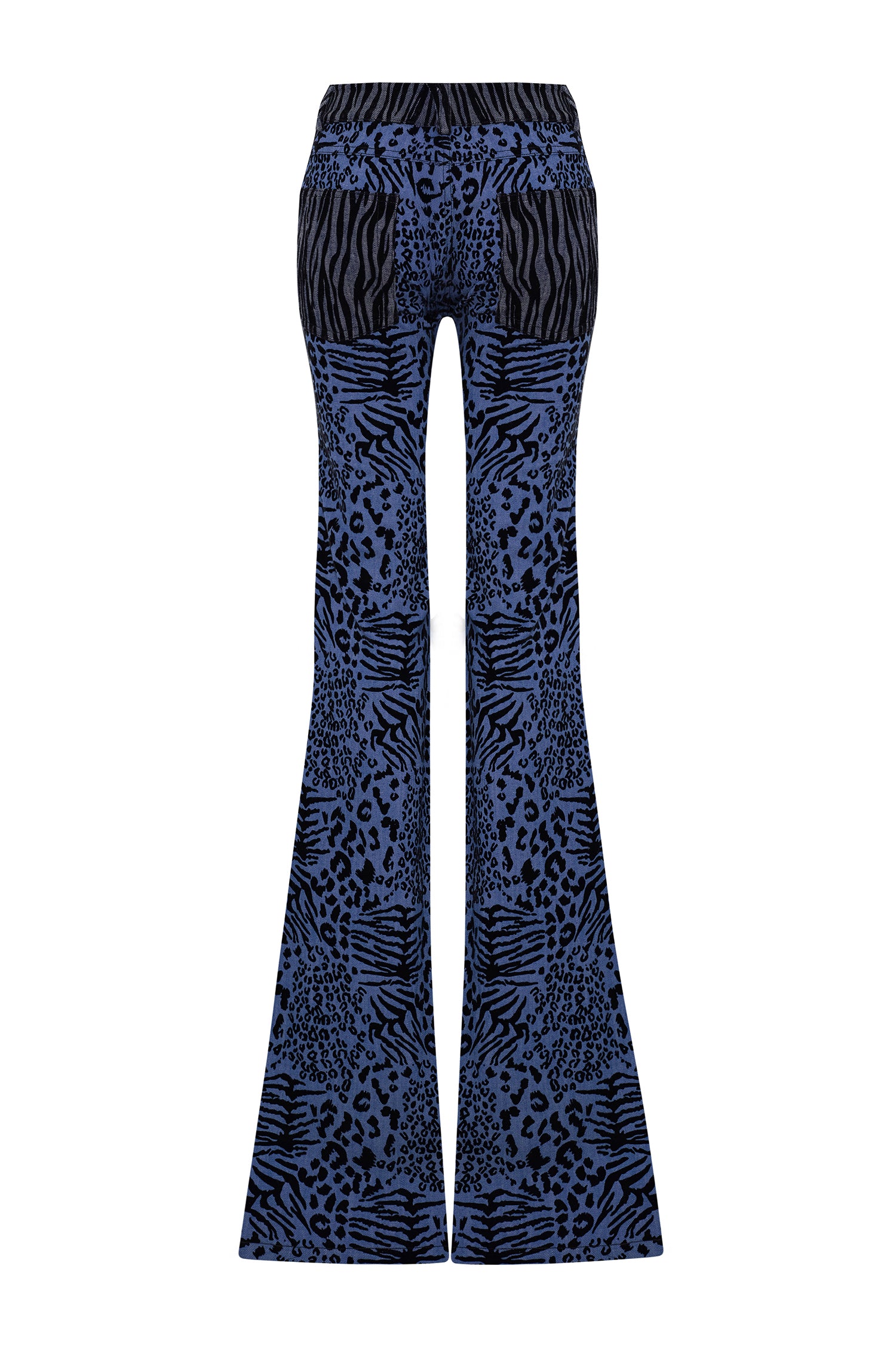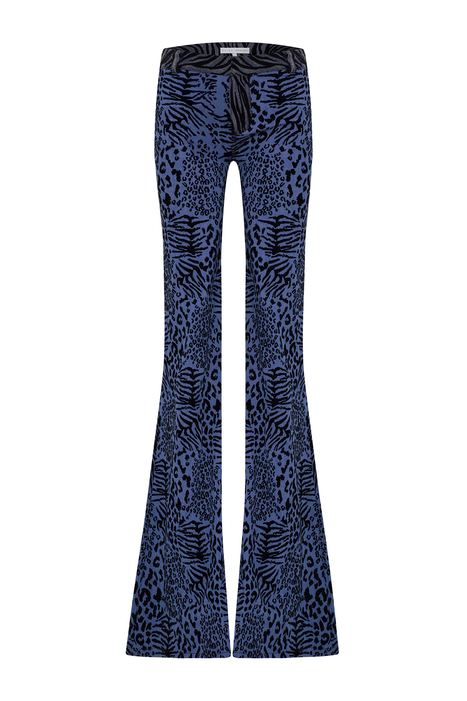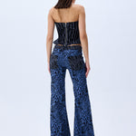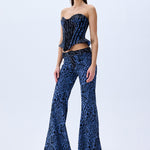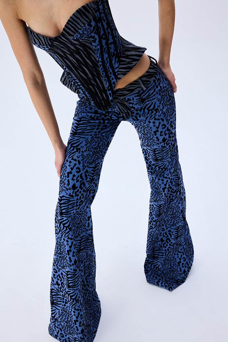 These flared denim pants are printed with a bold velvet leopard motif, blending texture and attitude in one striking silhouette. Designed to elongate the legs while making a fearless fashion statement.