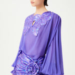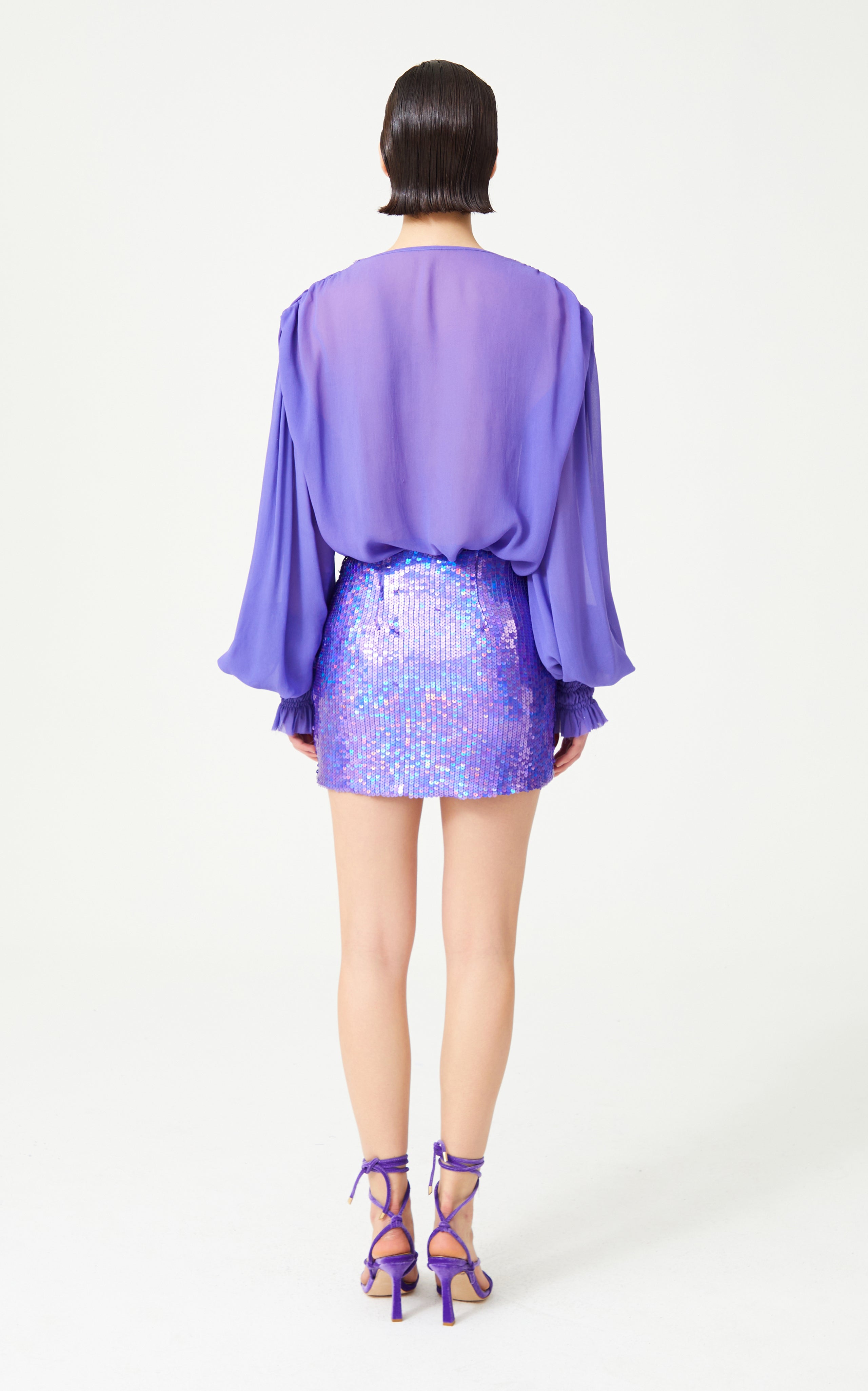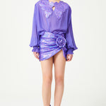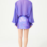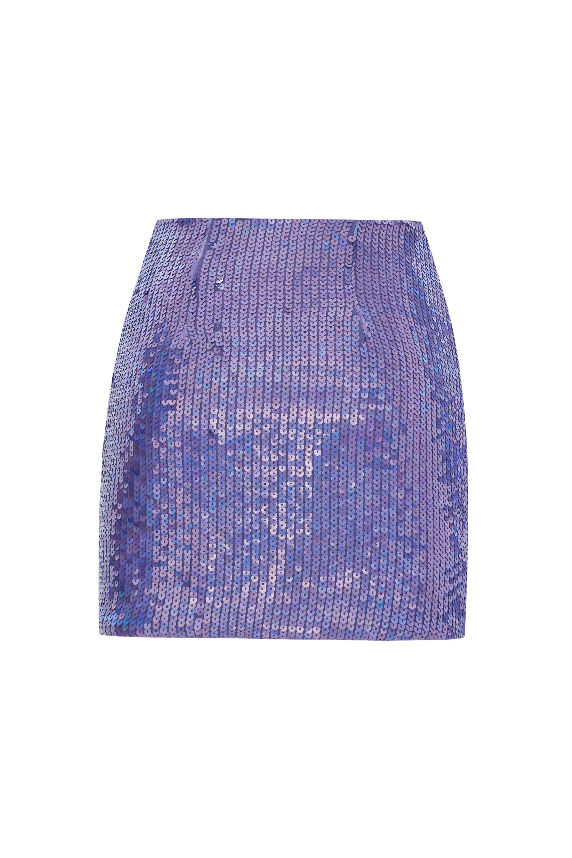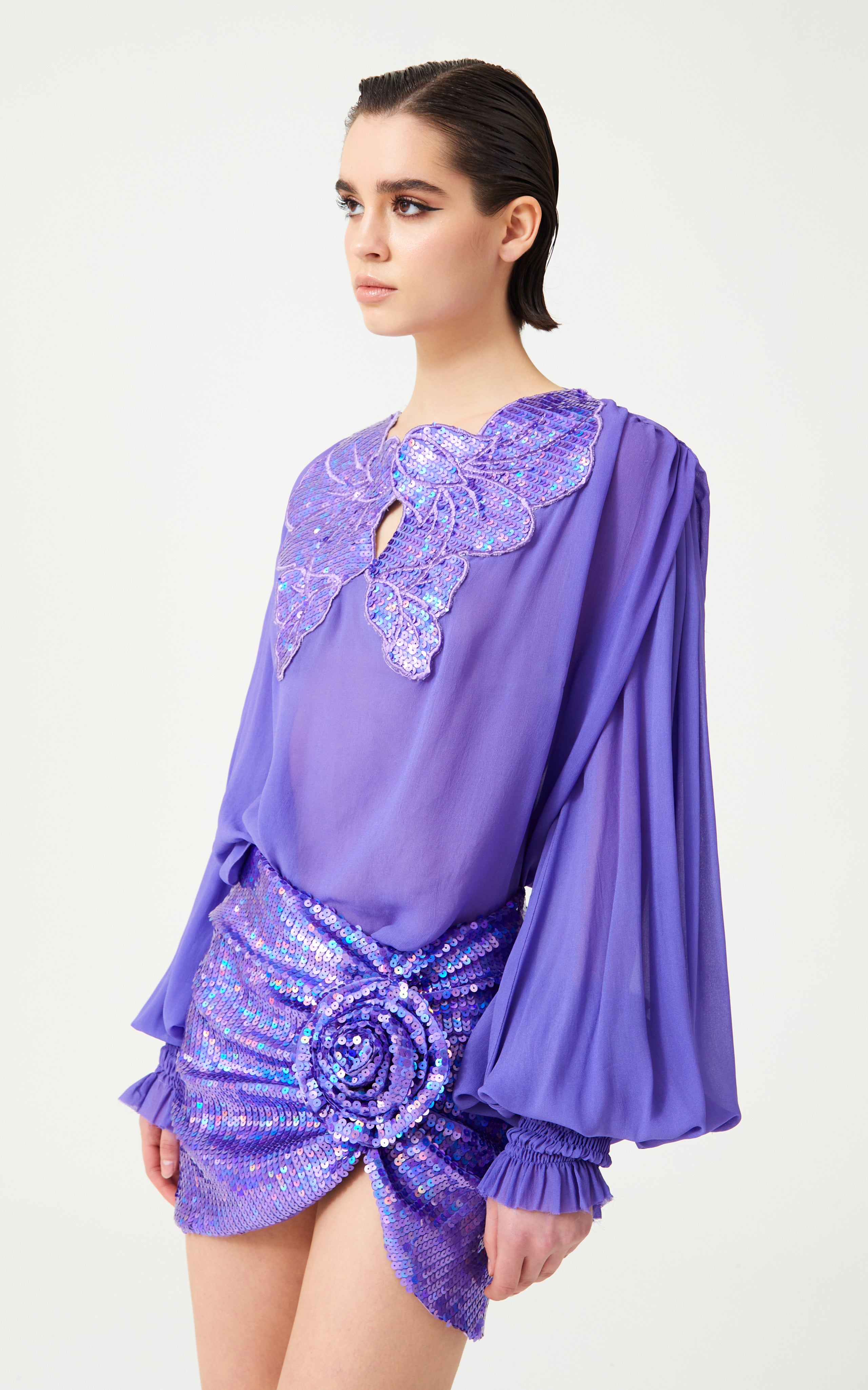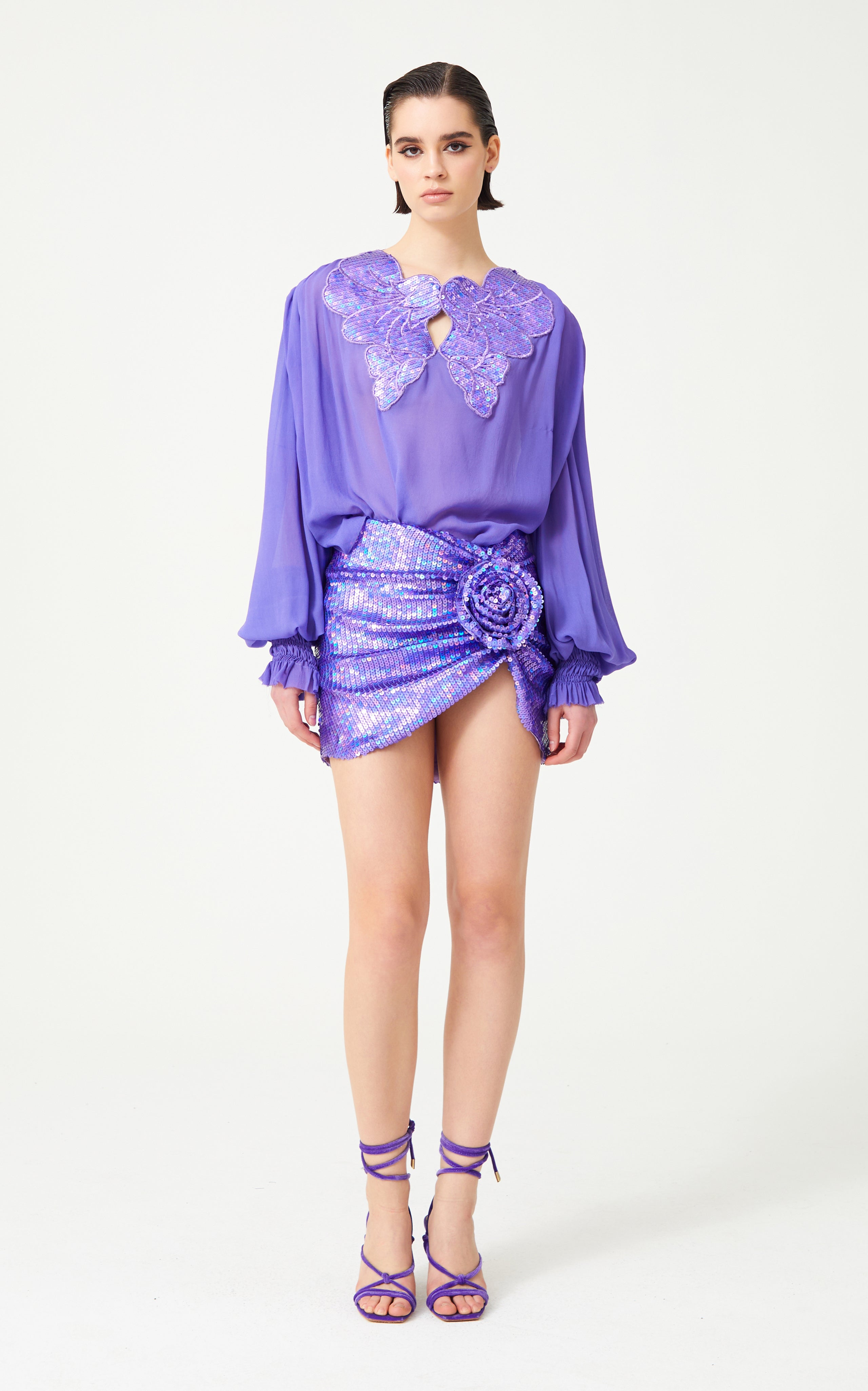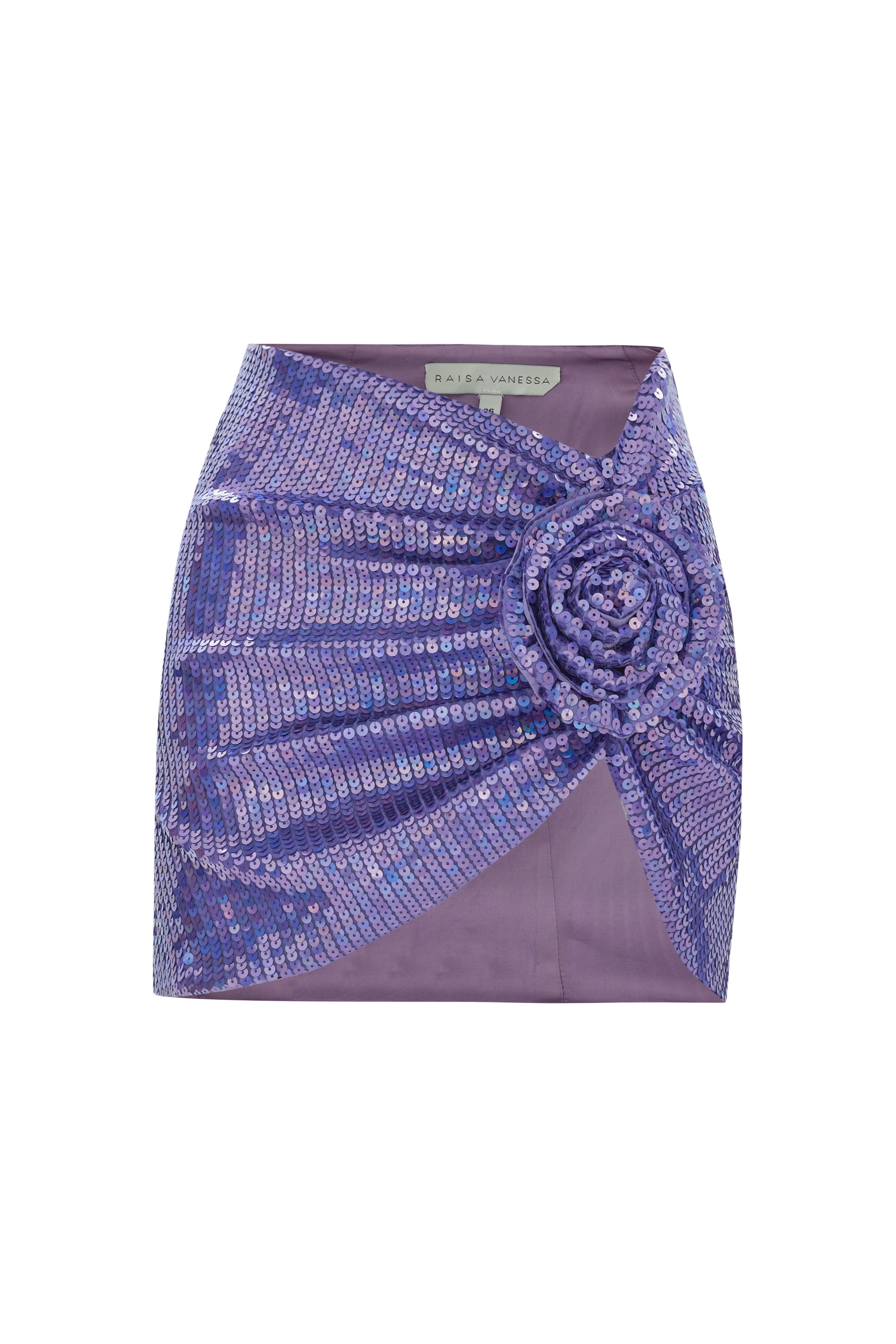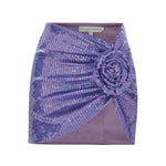 Lilac Fully Sequined Draped Mini Skirt With Flower Detail