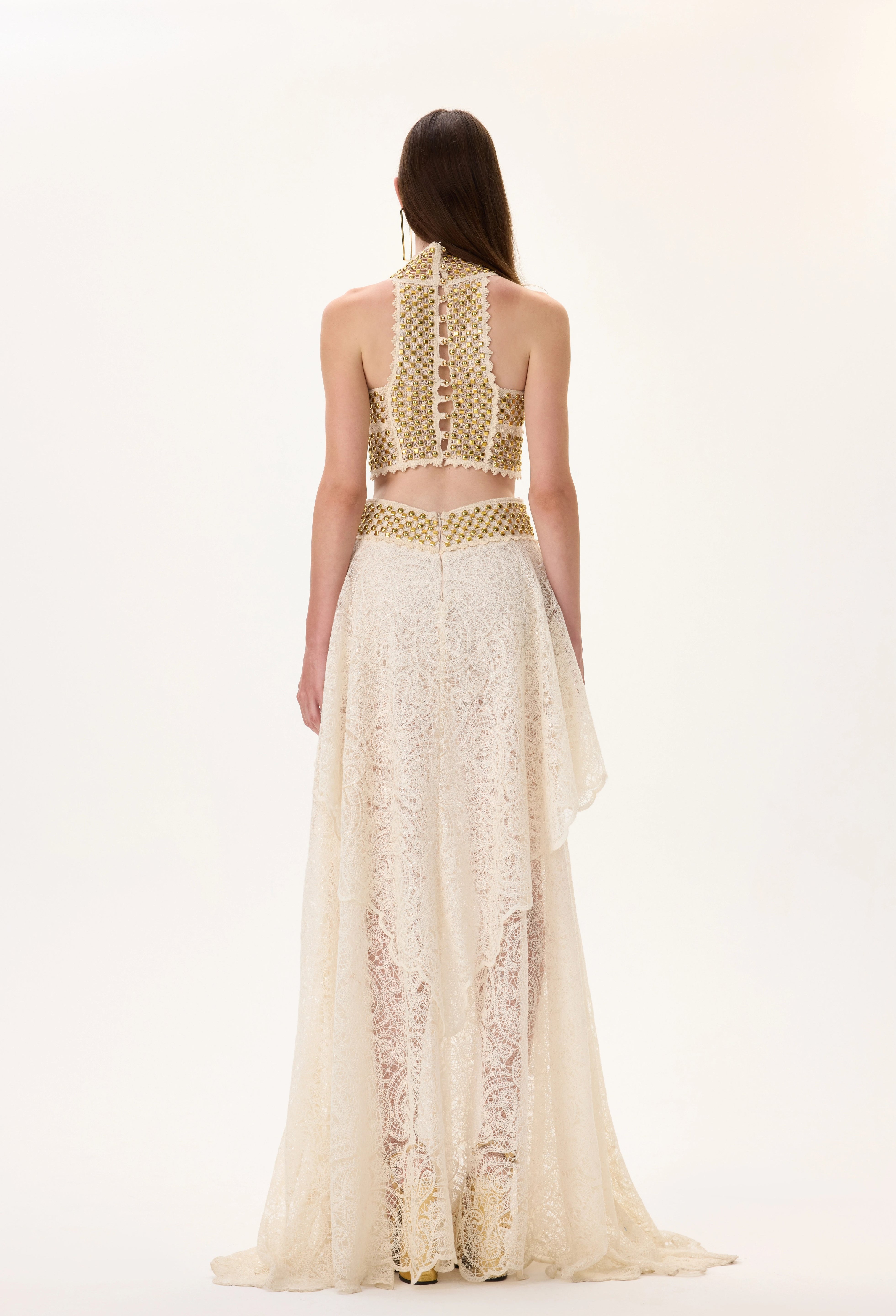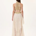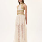A luxurious maxi dress featuring a refined knitted top combined with a sophisticated two-layered lace skirt. Gold metal borderline detailing enhances the couture effect, adding depth, character, and rich texture contrast. Perfect for gala events, evening occasions, or luxury fashion styling.