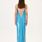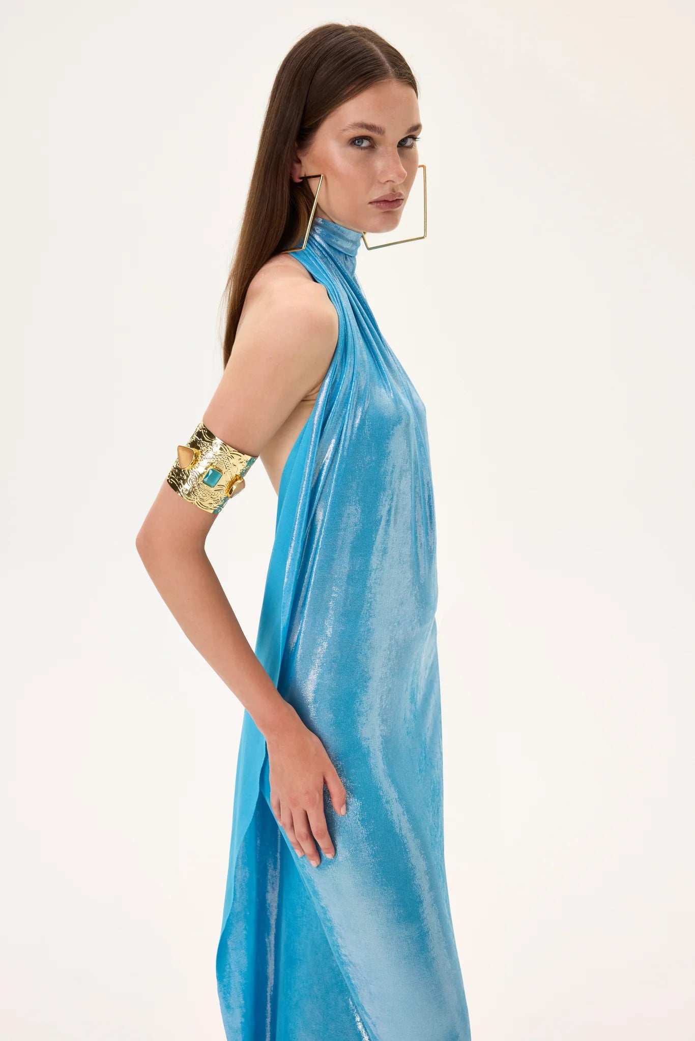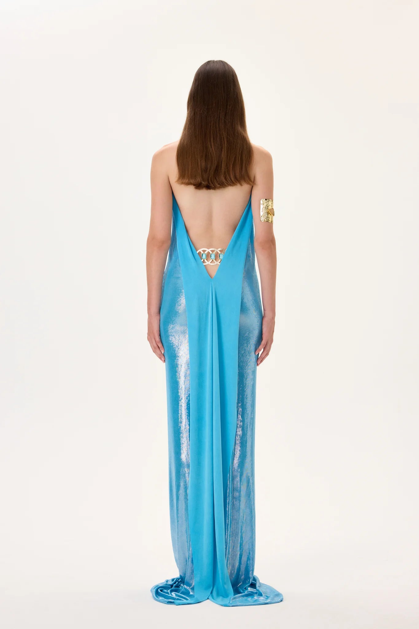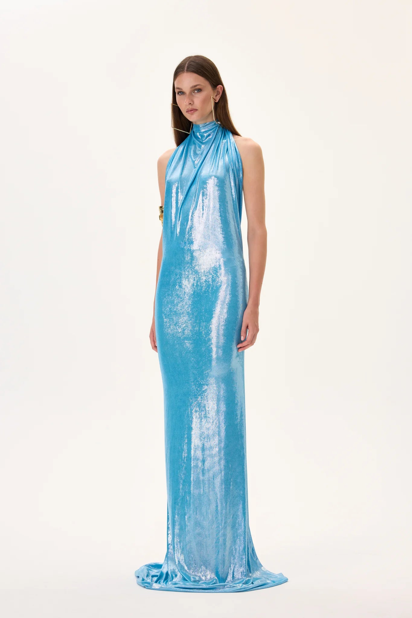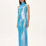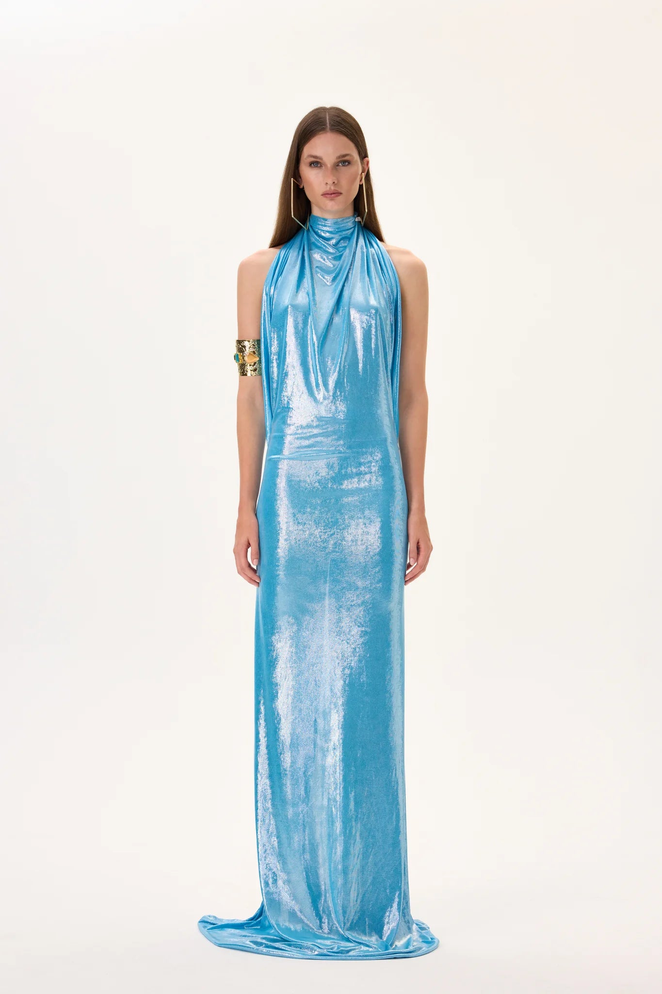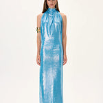 Glamorous metallic jersey halter neck maxi gown accented with a gold back accessory. Designed for an elegant and elongated silhouette, combining sophistication and modern luxury.
