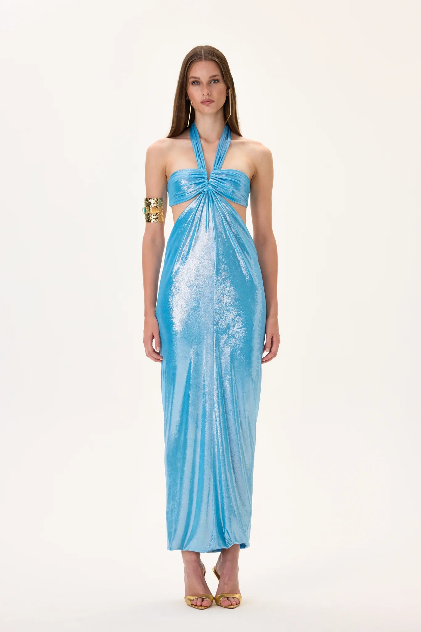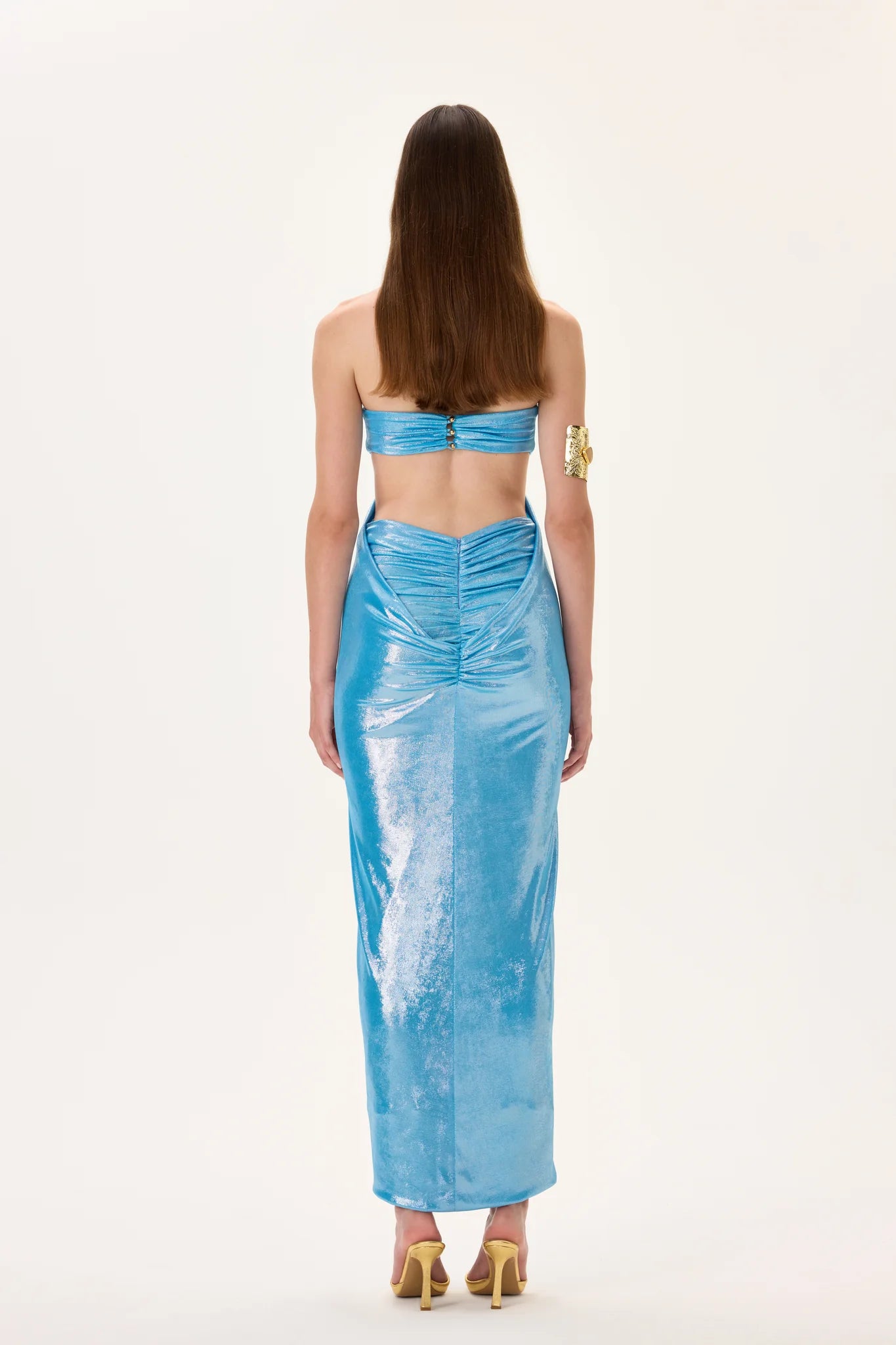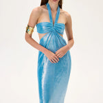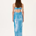 Sophisticated midi dress featuring a voluminous balloon skirt and ruched waist for a flattering feminine silhouette. Designed with a modern aesthetic suitable for evening events and elegant occasions.