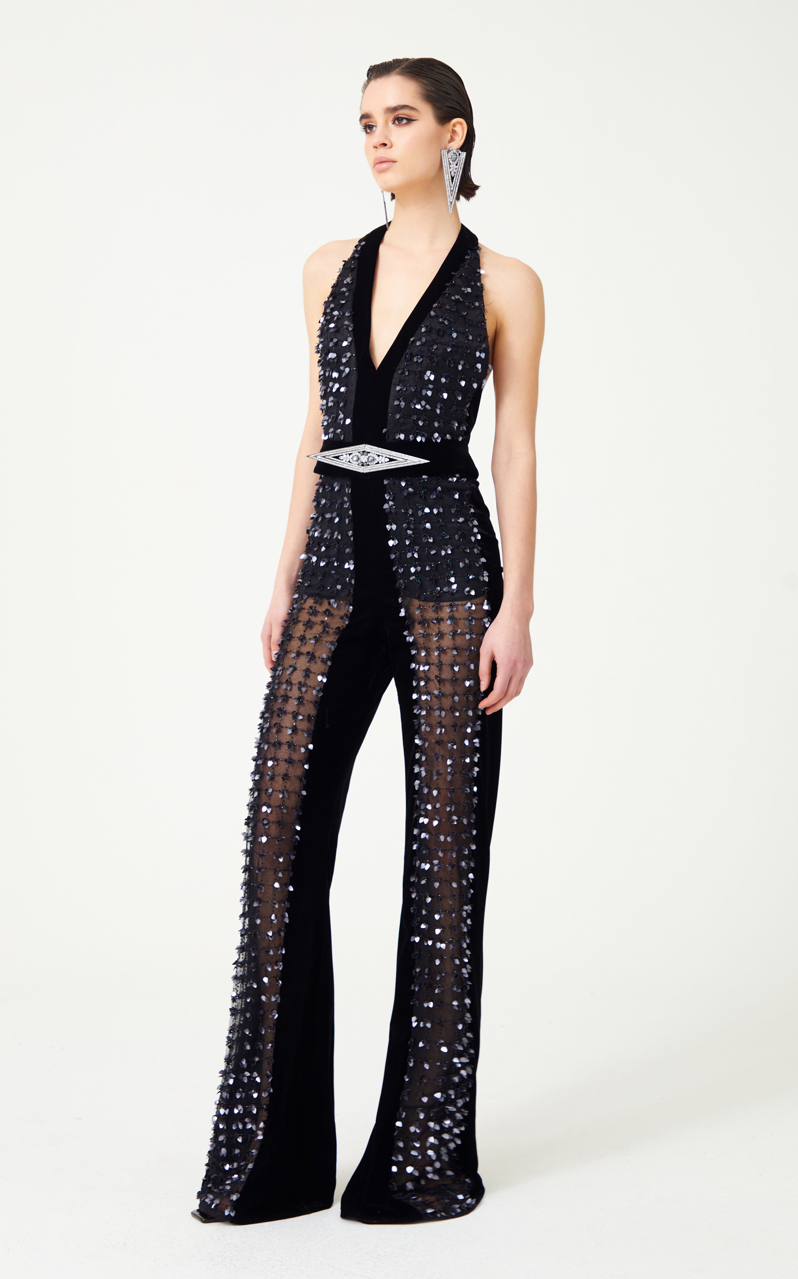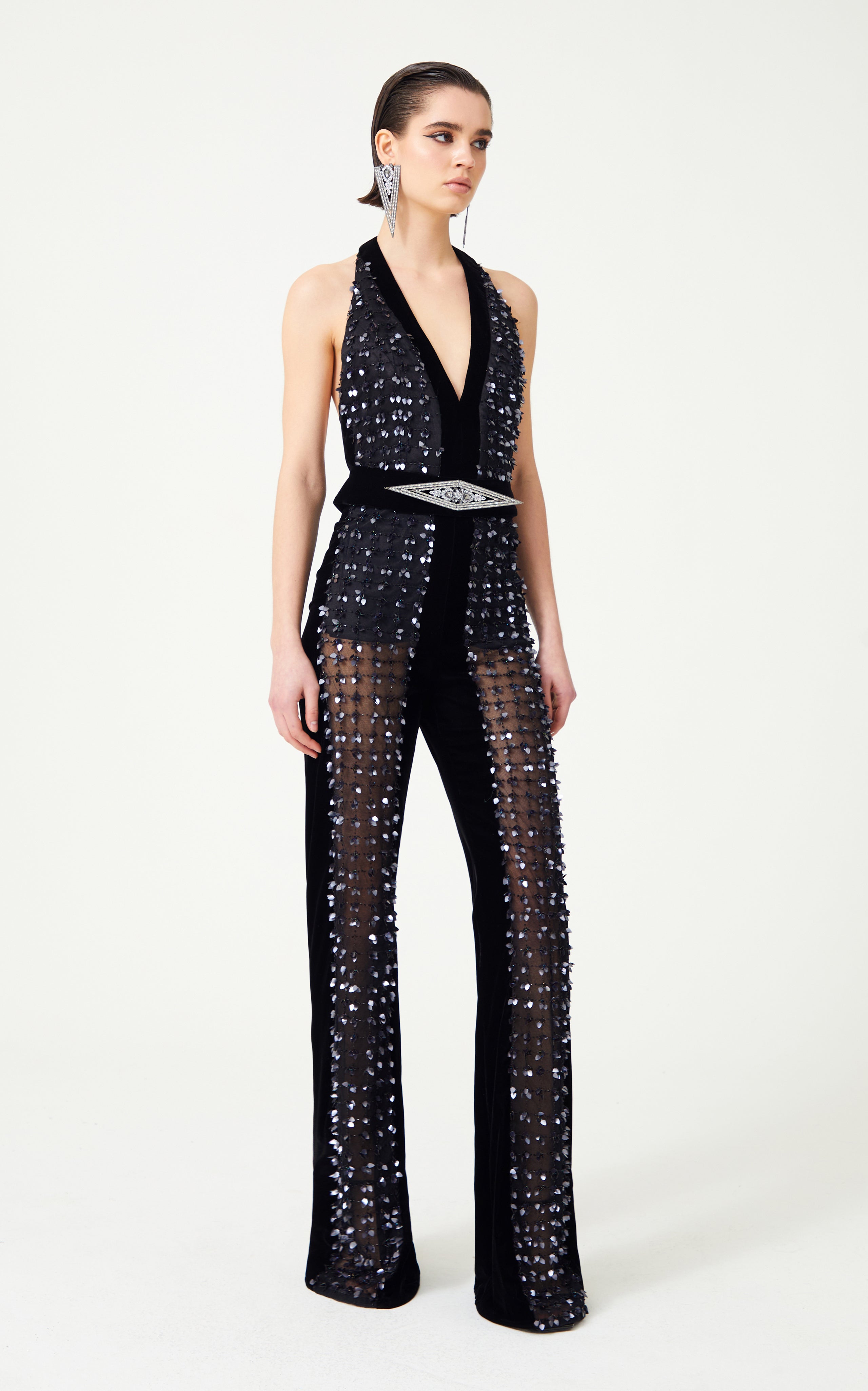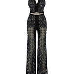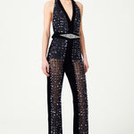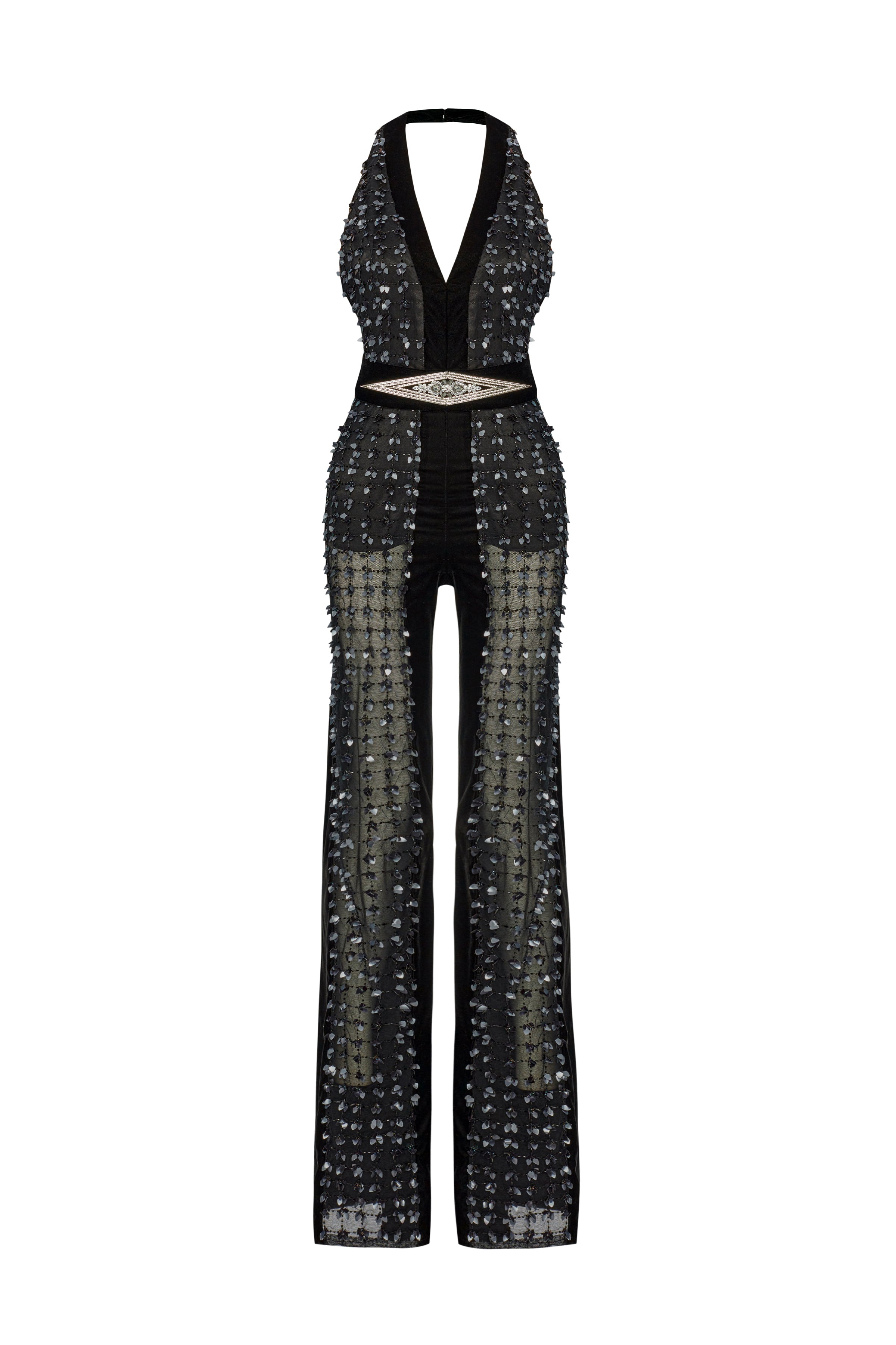 Radiate elegance in this Navy Flower Embroidered Tulle Jumpsuit. Featuring a velvet back and adorned with a crystal belt detail, it combines sophistication with intricate craftsmanship for a stunning ensemble.