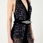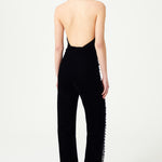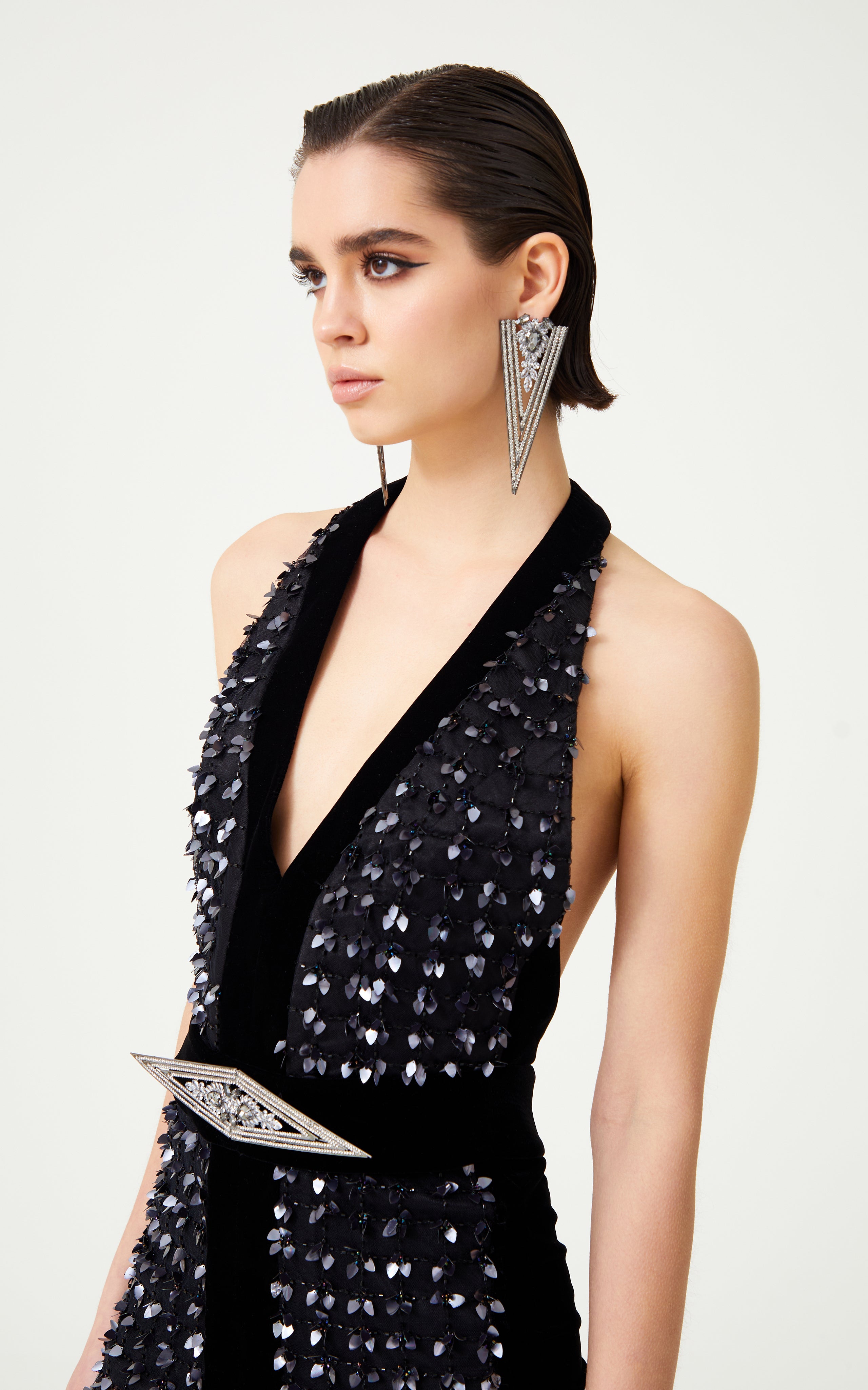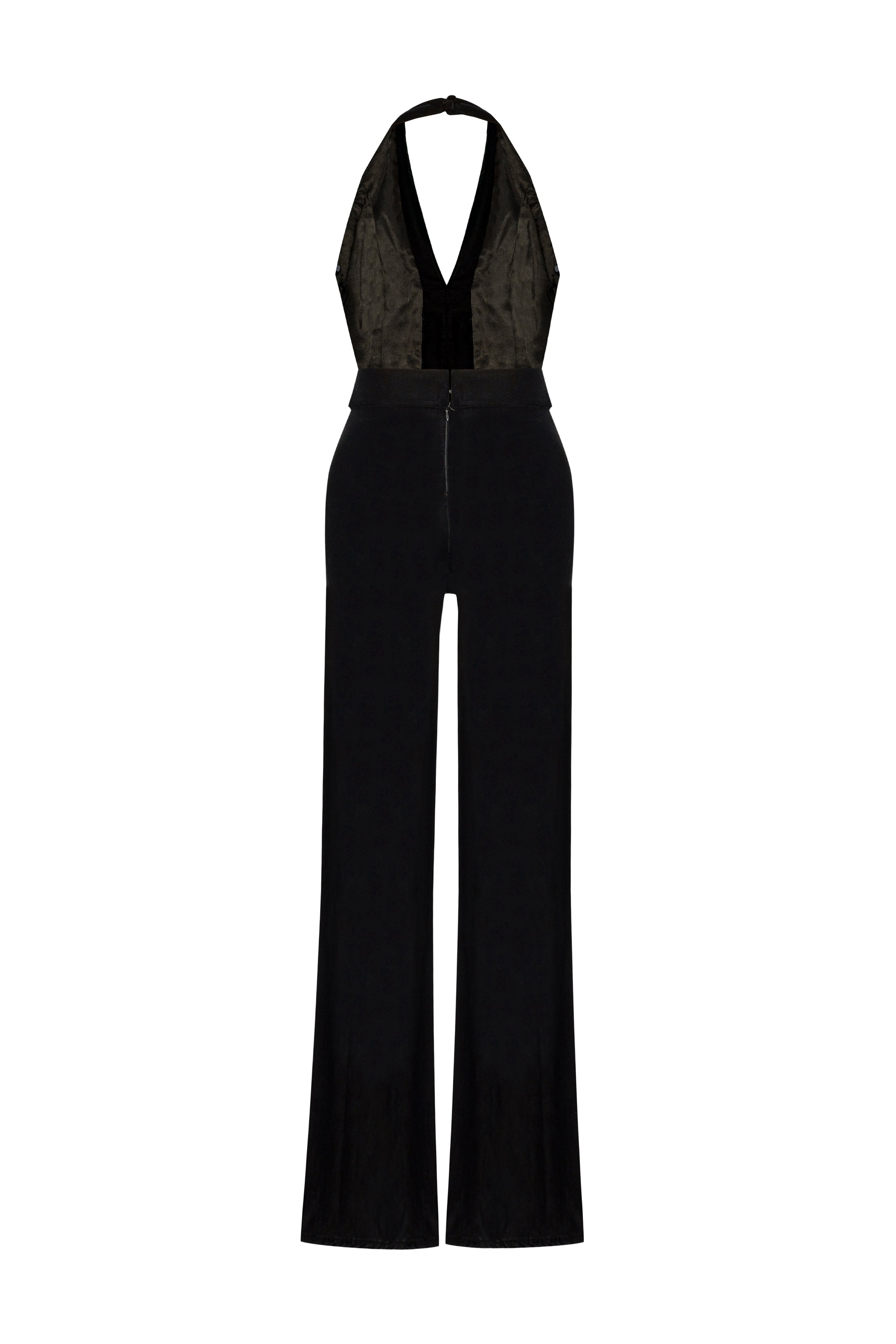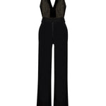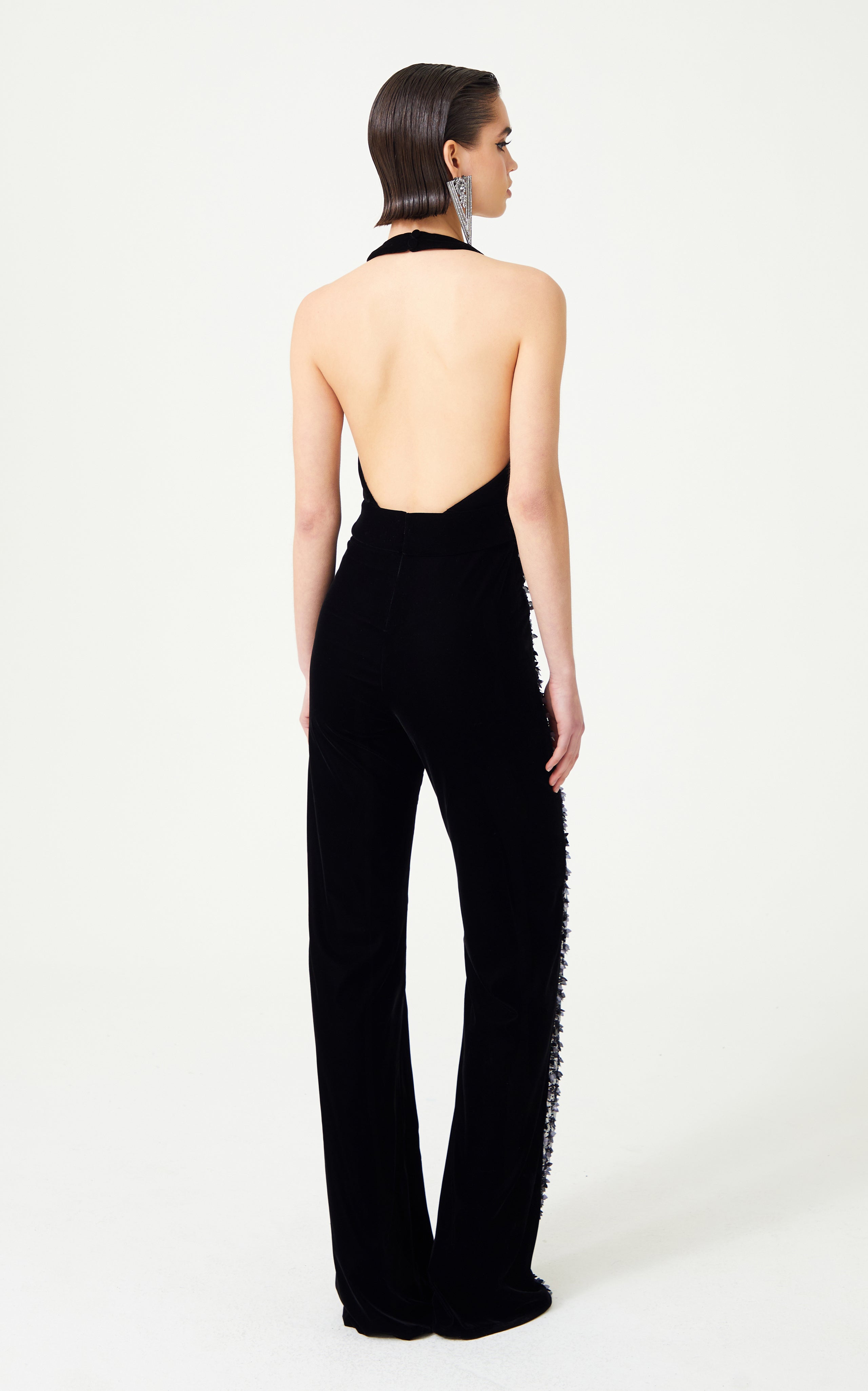 Navy Flower Embroidered Tulle Jumpsuit With Velvet Back And Crystal Belt Detail